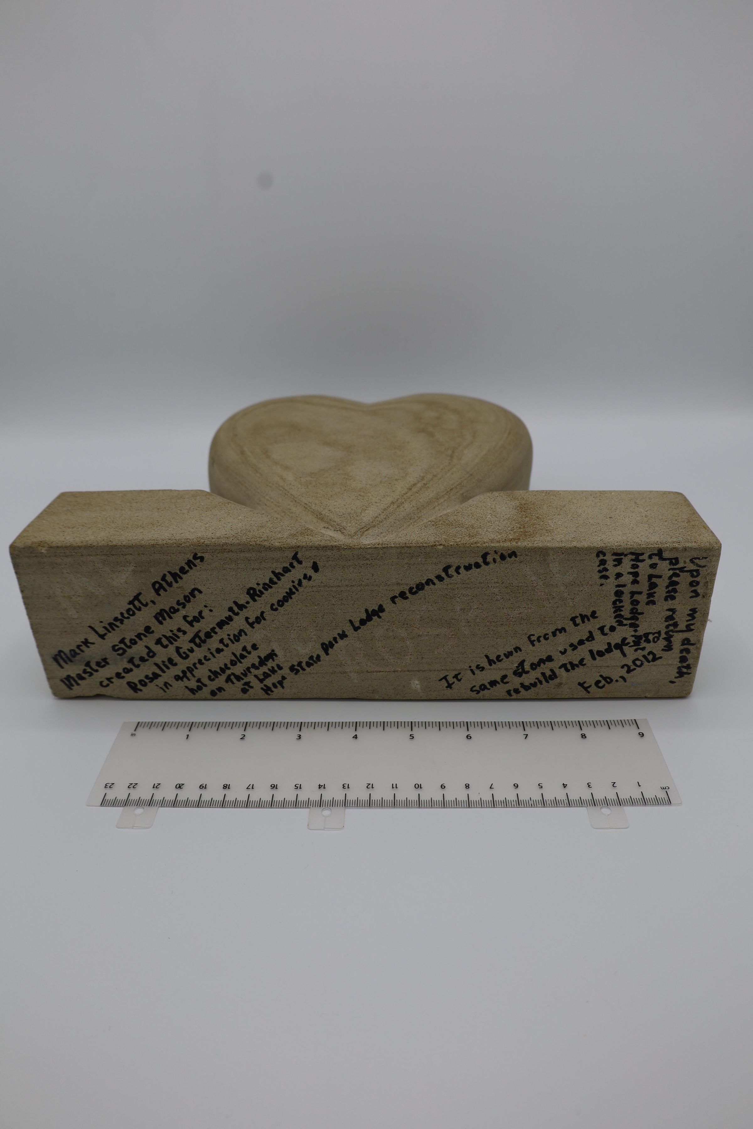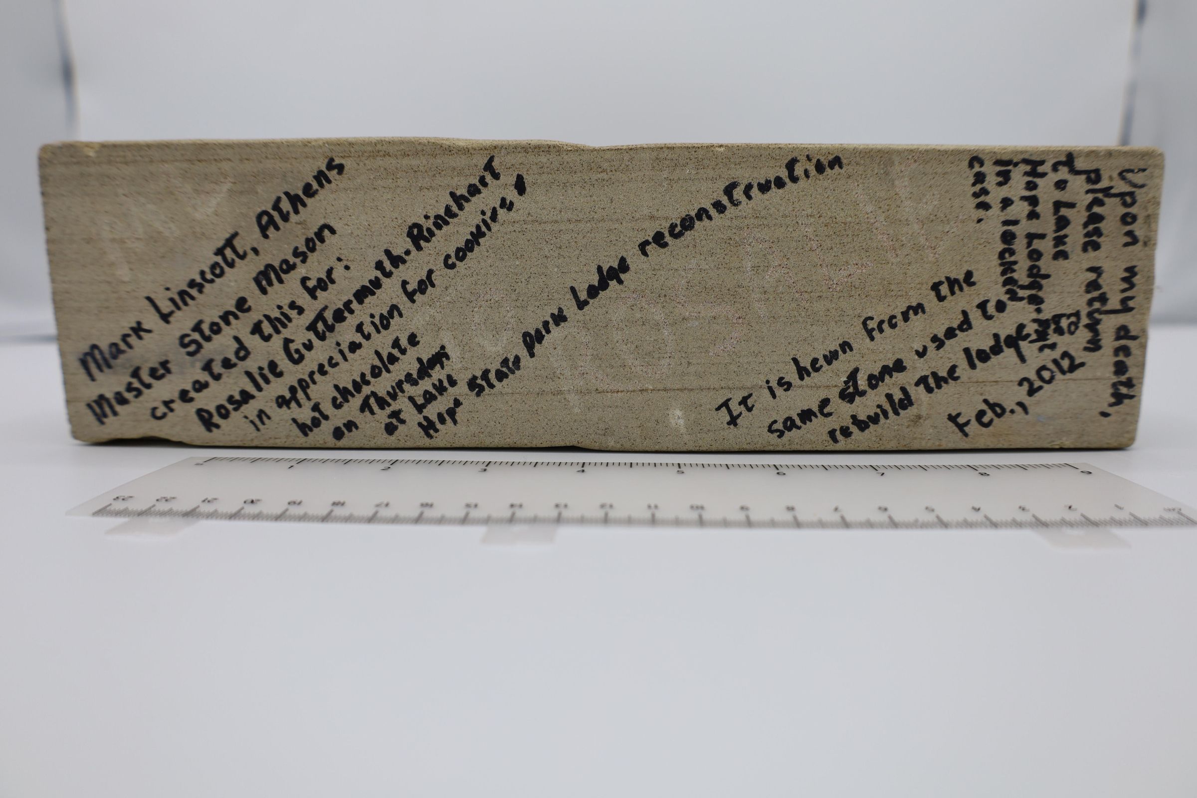 Master Stone Mason, made from the same stone used to rebuild the dining lodge. 2012, Mason Mark Linscott from Athens Ohio.Location