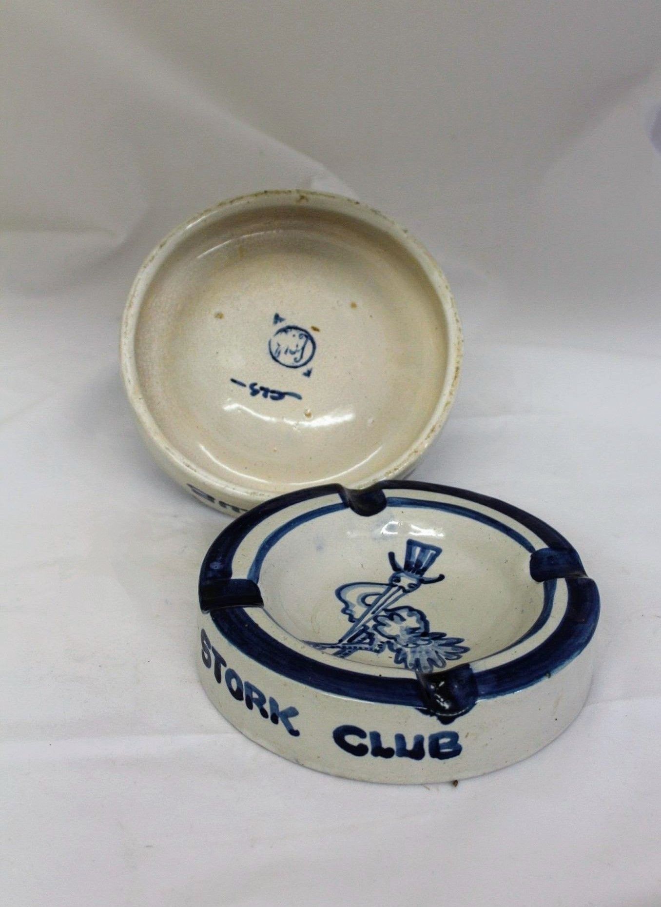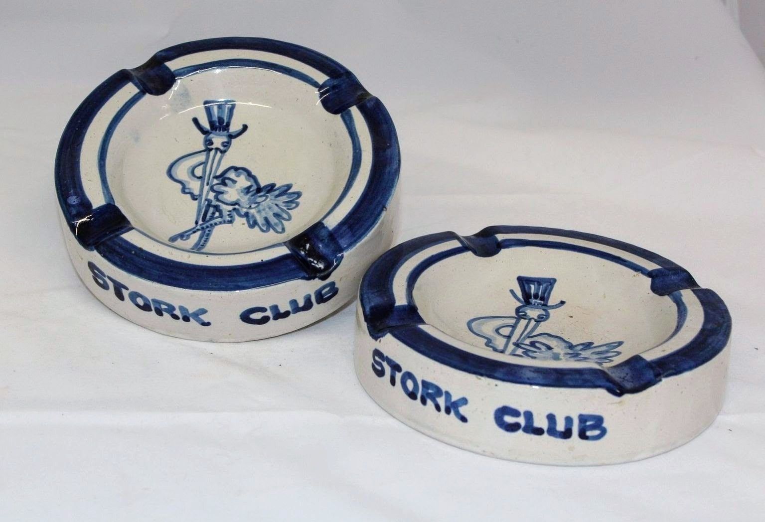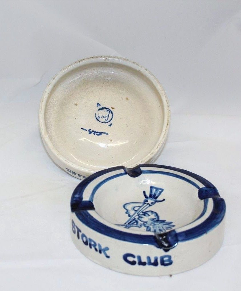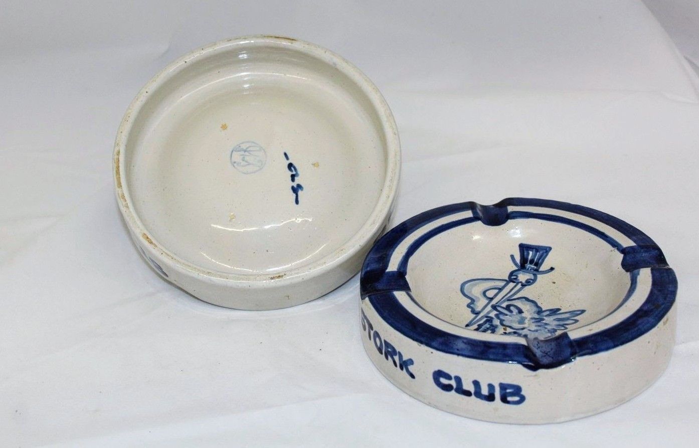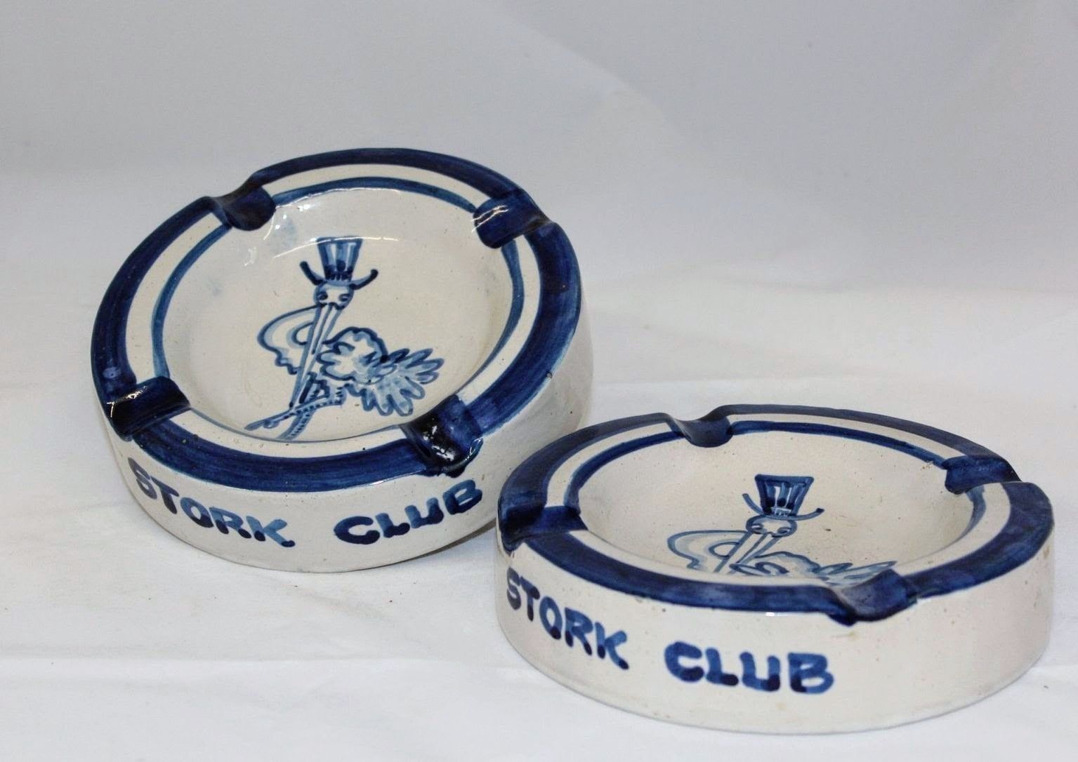 Two blue and white glazed stoneware ashtrays. Each ashtray has "STORK CLUB" written on the side and includes a drawing of a stork in a top hat, the logo for New York City's Stork Club, in the bowl.