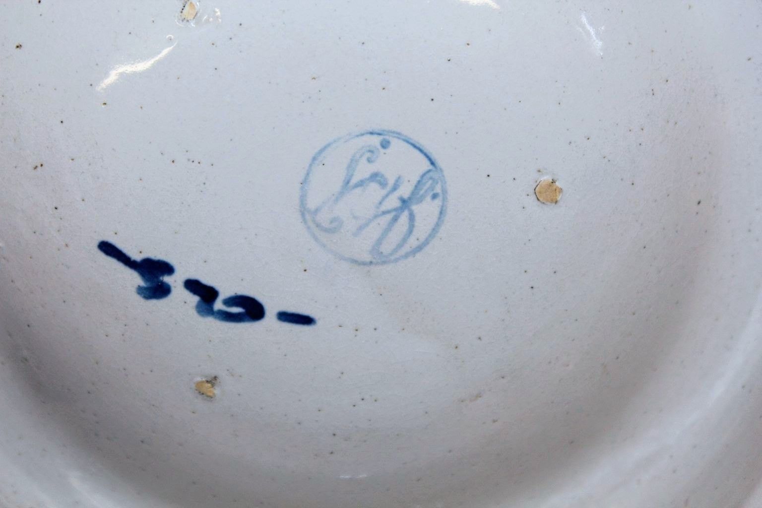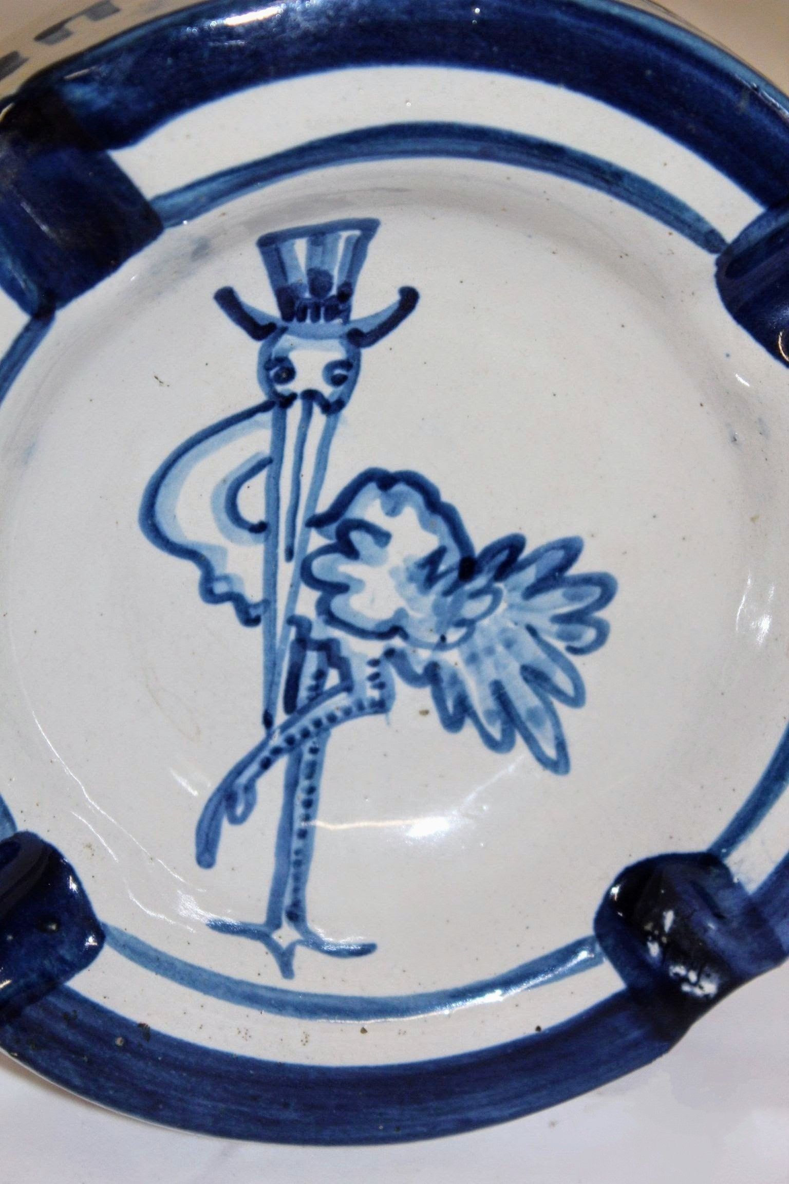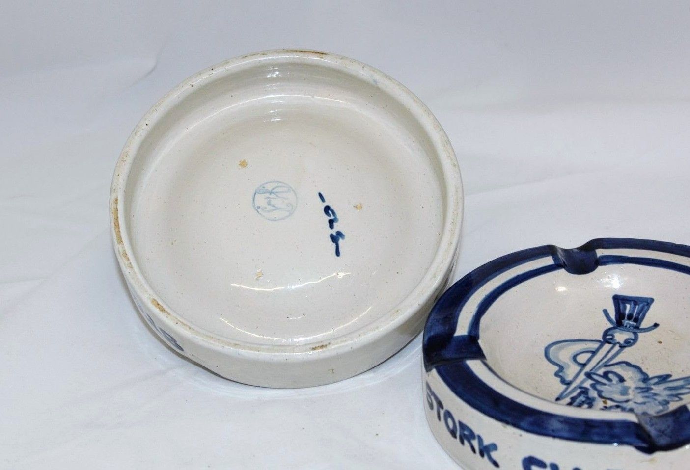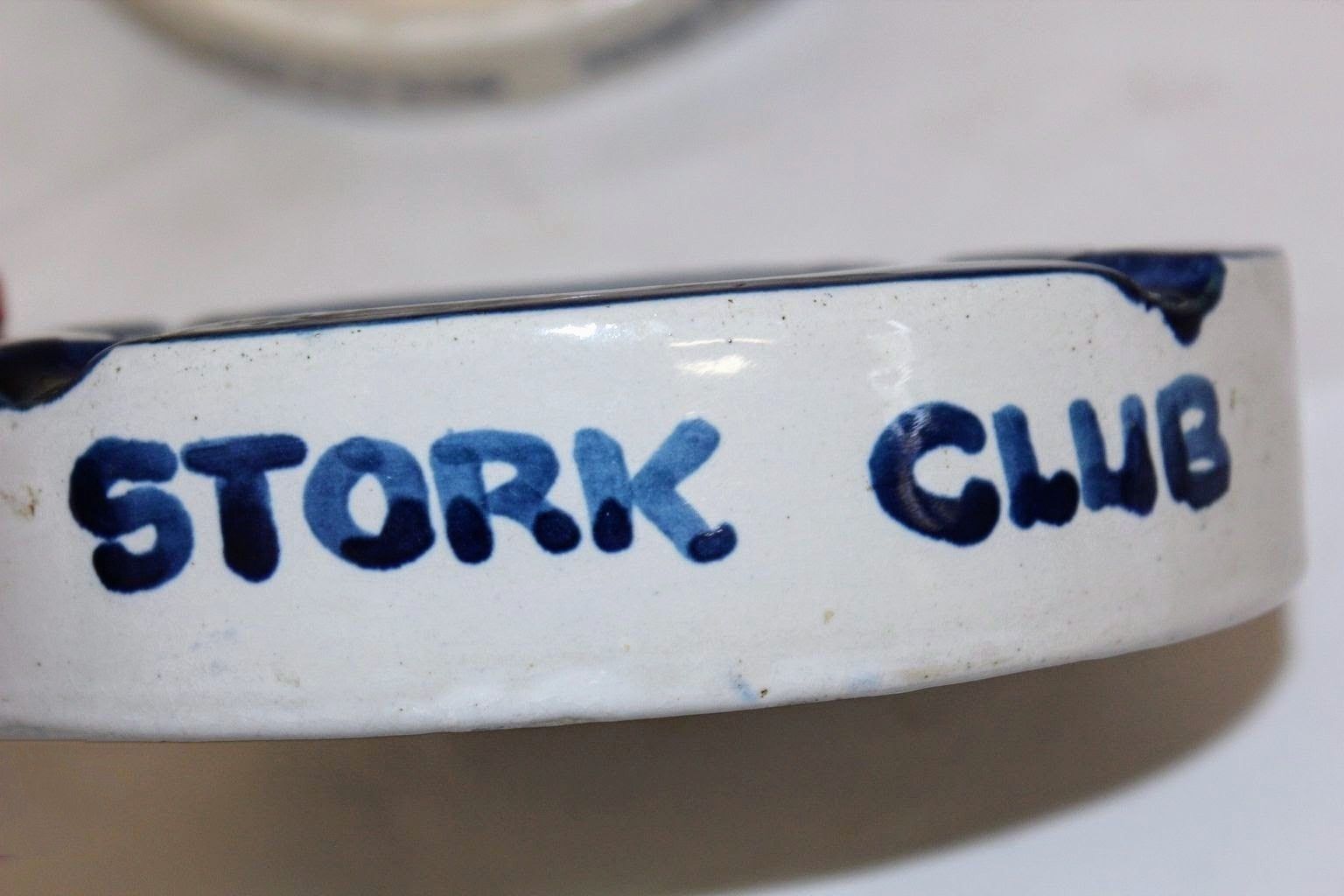 Two blue and white glazed stoneware ashtrays. Each ashtray has "STORK CLUB" written on the side and includes a drawing of a stork in a top hat, the logo for New York City's Stork Club, in the bowl.