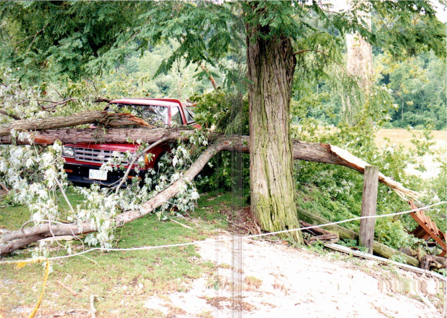 A storm in June of 1998 wreaked havoc on Blue Rock State Park. In this photograph, a tree has collapsed and fallen on a truck.