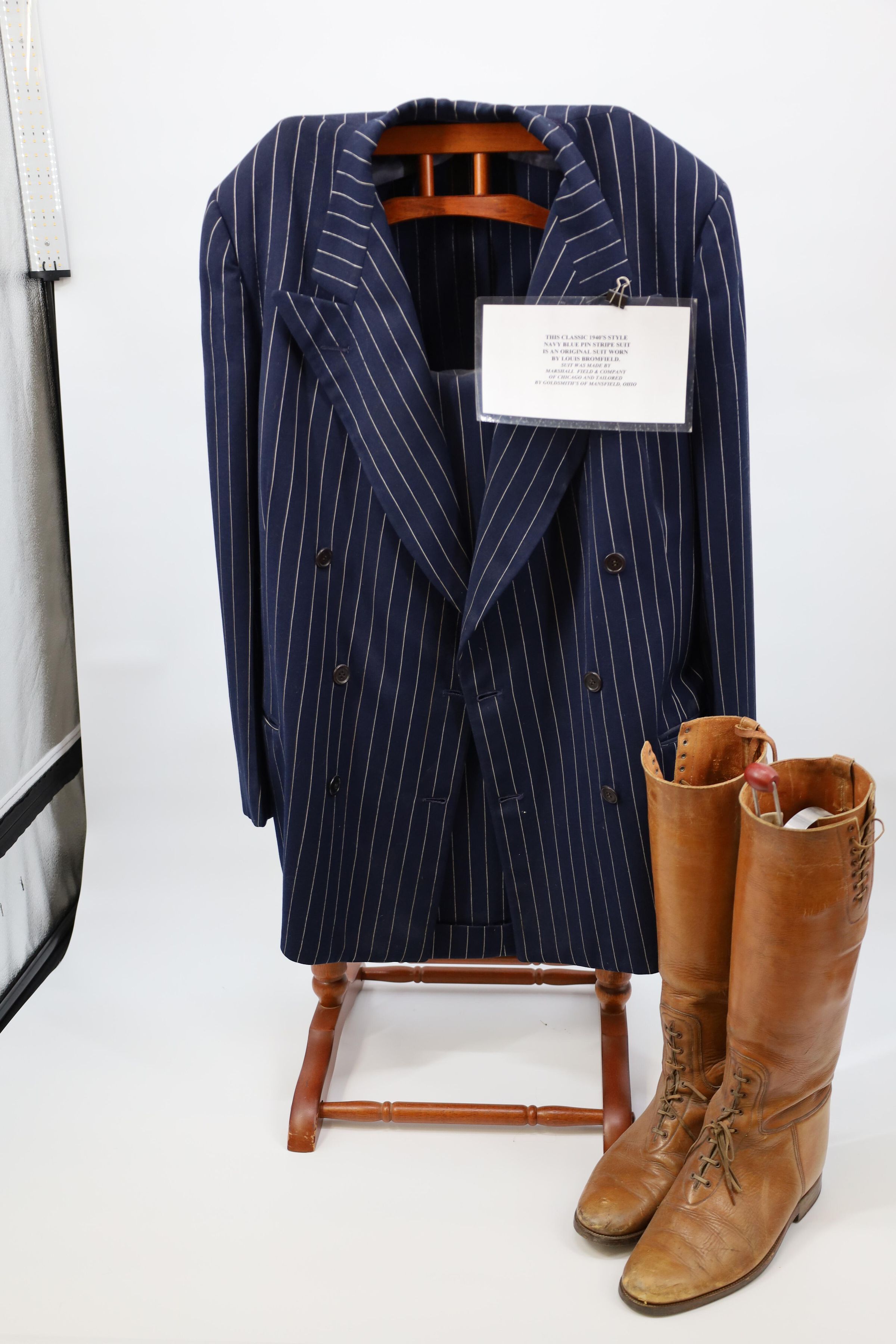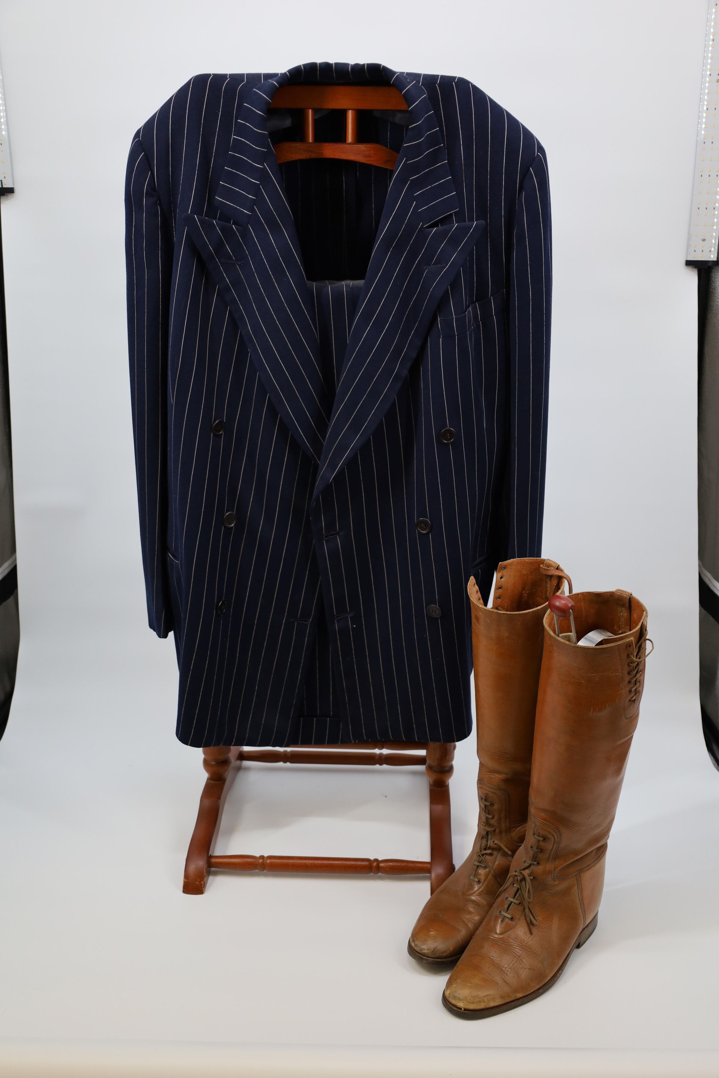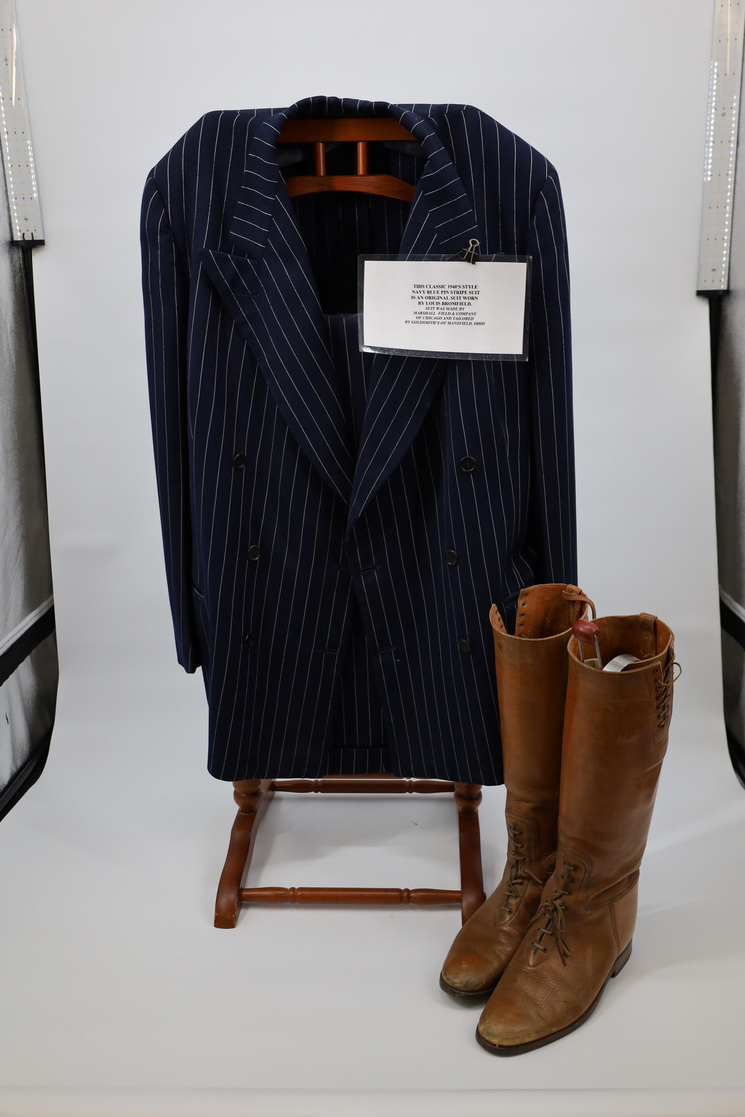 This classic 1940s-style navy blue pinstripe suit is an original suit worn by Louis Bromfield. The suit was made by Marshall Field & Company of Chicago and tailored by Goldsmith's of Mansfield, Ohio. Goldsmith's opened in 1924 at 54 North Main Street, and Bromfield was a frequent customer.Location