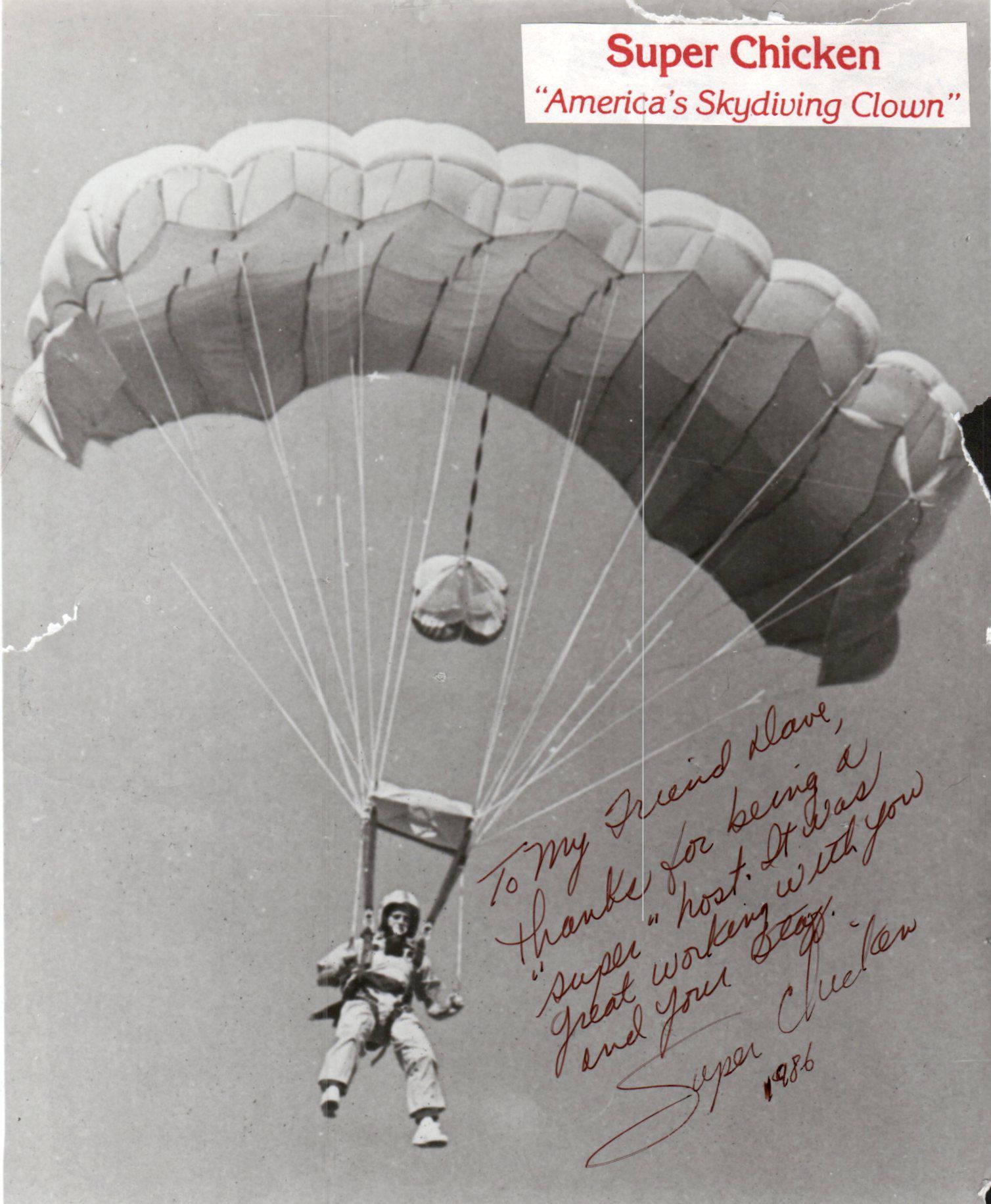 A picture of the skydiver "Super Chicken," with a handwritten message to Dave, his host during his outing at 1986 edition of the Poultry Days festival held in Versailles, Ohio. "Super Chicken" billed himself as "America's Skydiving Clown."Cataloged By