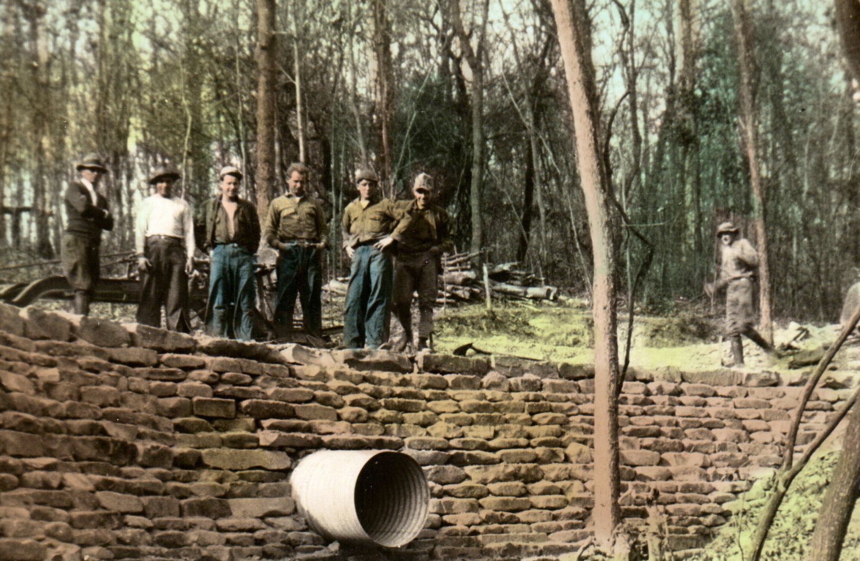 In this hand colored image, a group of men from Civilian Conservation Corps (CCC) Company 503 stand atop their recently completed drainage project. This embankment with piping will help keep their project-likely a road-dry and navigable during rainy periods.