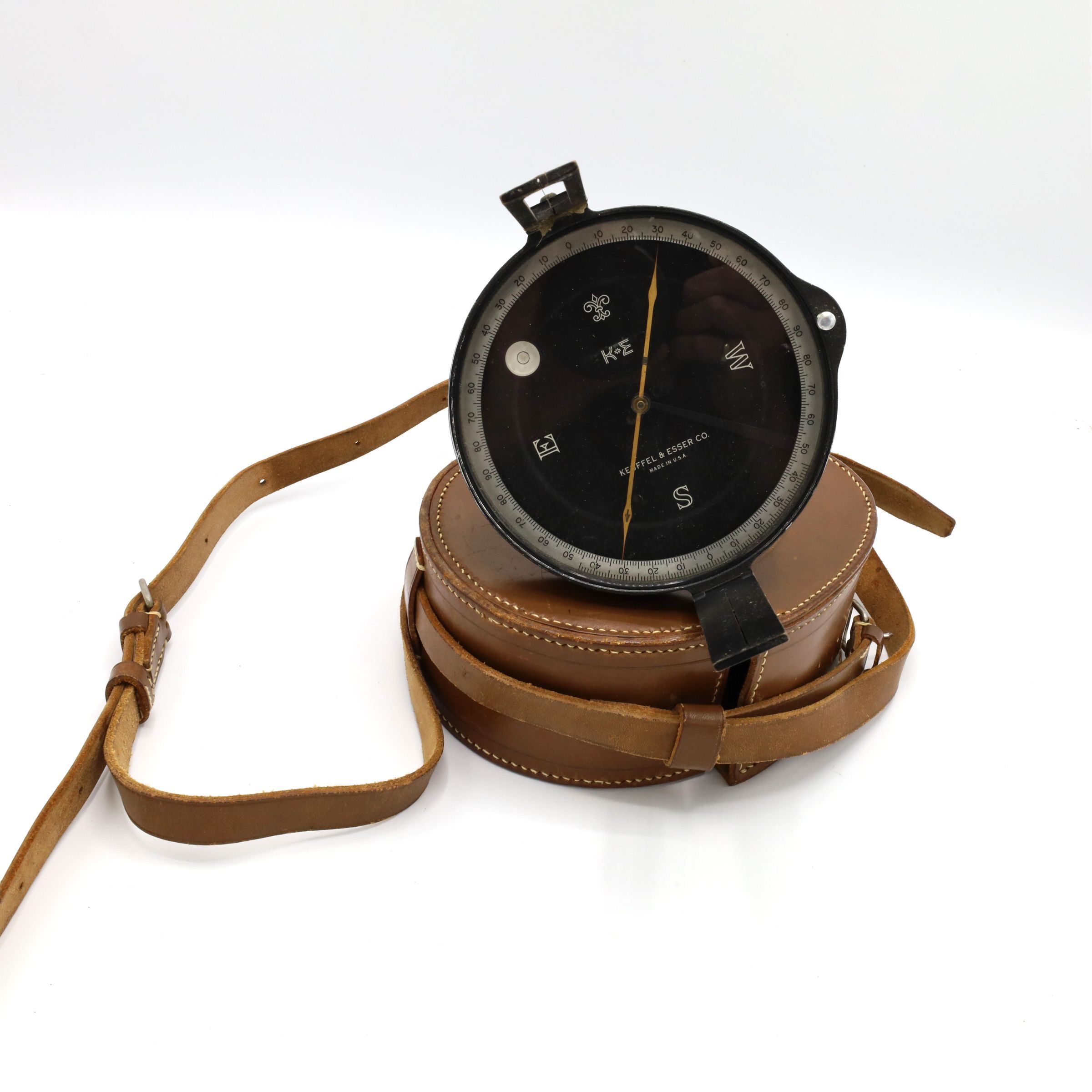 Large scale, black painted metal compass with a large face. Cardinal directions are marked with capital 'E,' 'W,' and 'S' with the north station filled by a stylized flourish. The face is marked with Keuffel & Esser Co. Made in the U.S.A. The compass needle is brass-tone, and there is a spirit level on the front of the compass.Collection