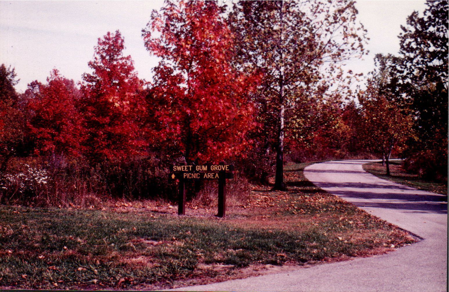 A sign at Delaware State Park indicates that the Sweet Gum Grove Picnic Area is ahead. The road is surrounded by trees with brilliant autumn colors.