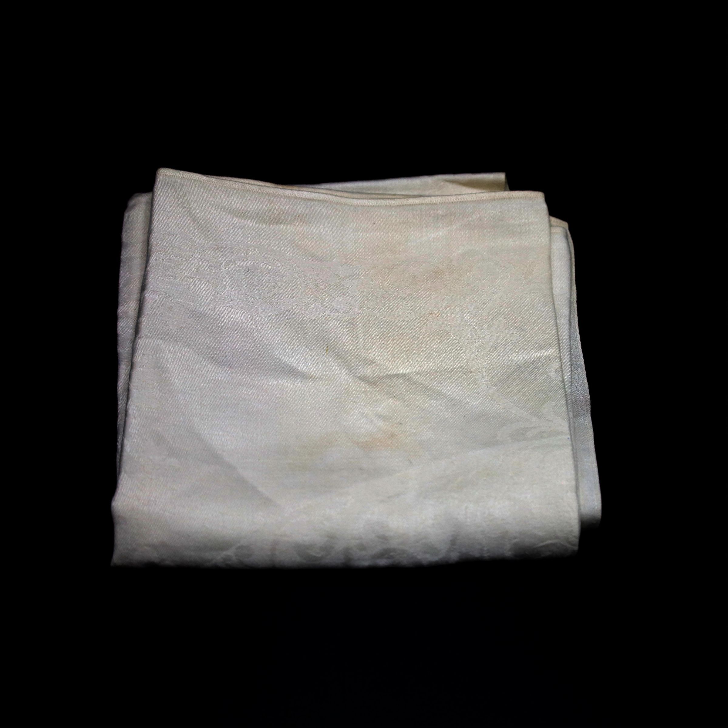White damask table runner, likely of a cotton blend. Table runners covered the middle of a table while placemats would have been used under individual place settings. This allowed for more of the table top to show. There appears to be a central medallion design, and there are some stains of unknown origin.Location