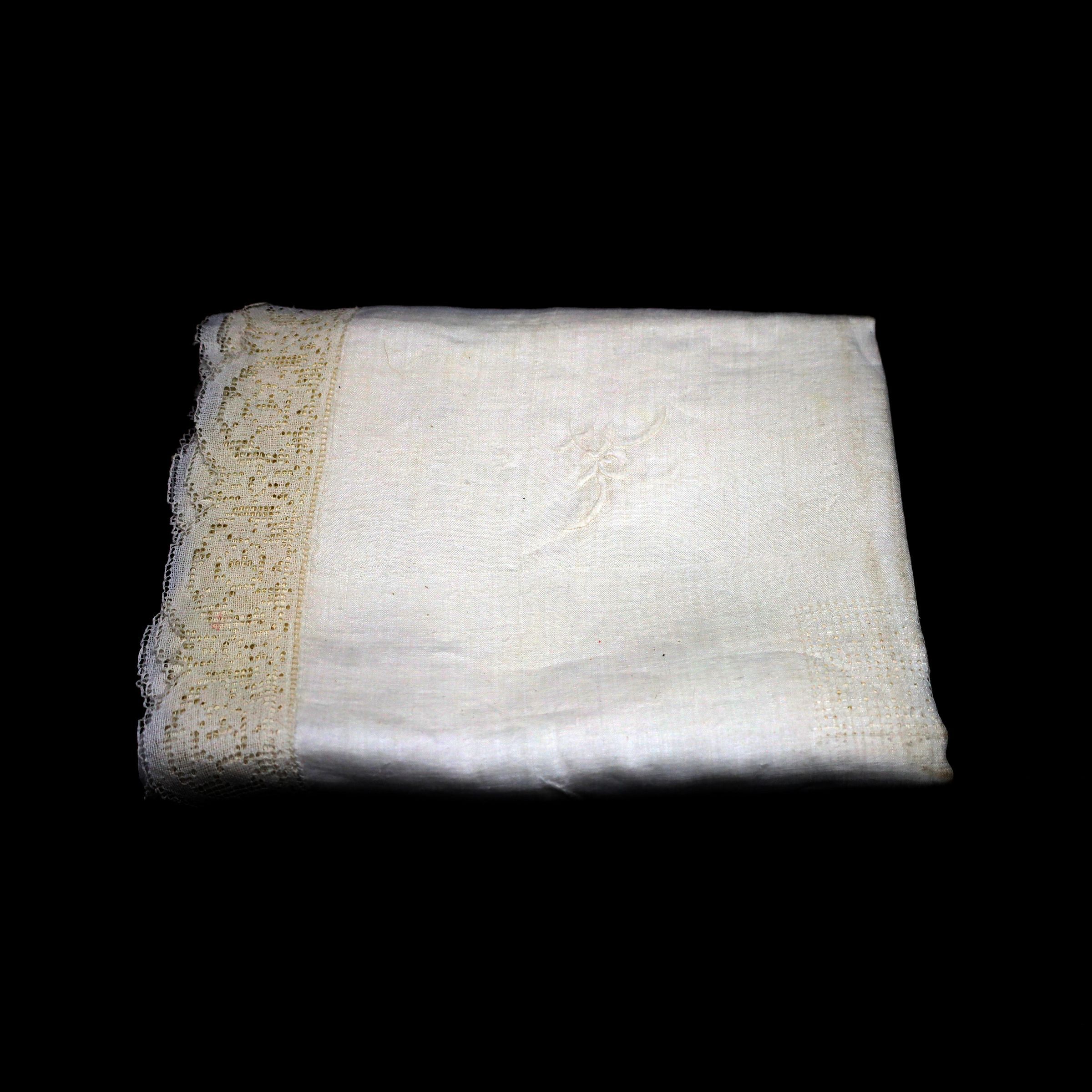 White cloth tablecloth with an embroidered pattern and lace edge.
