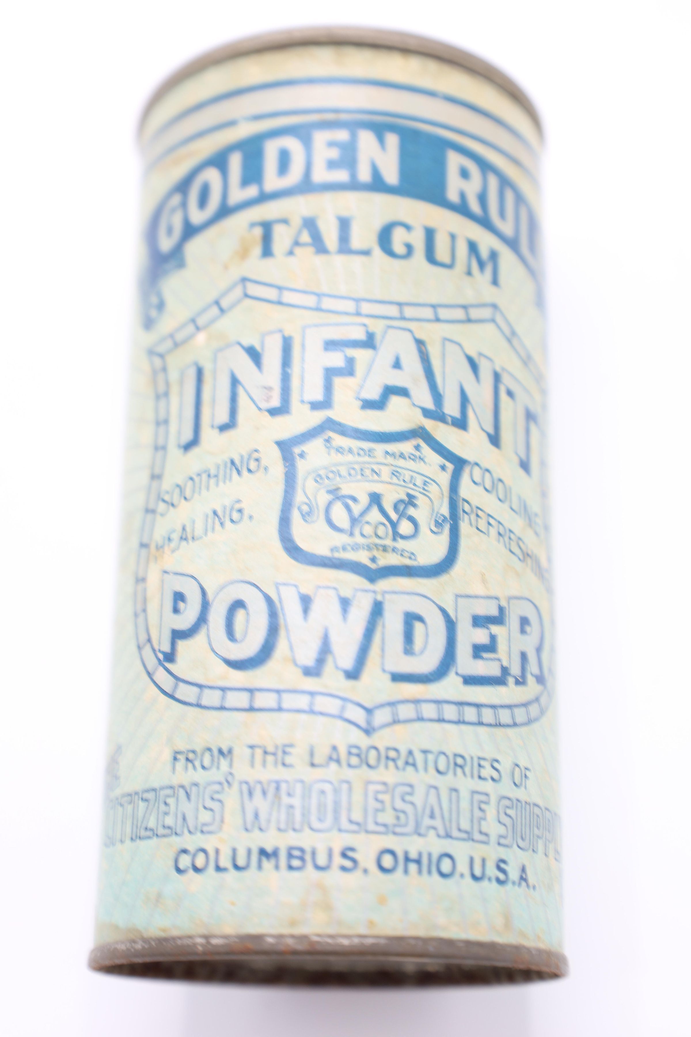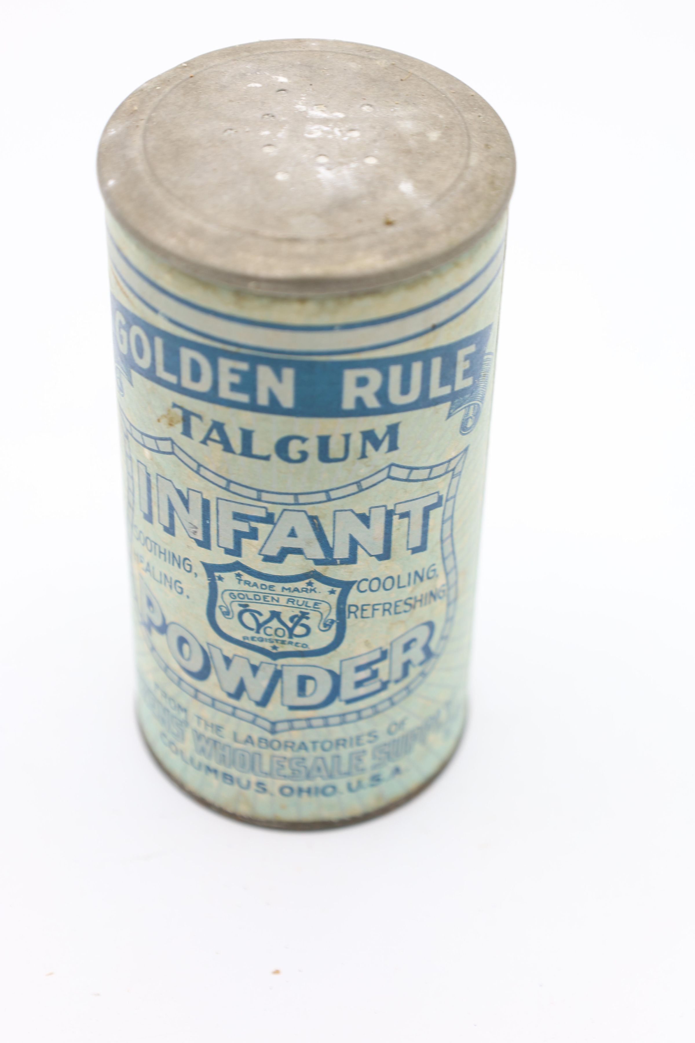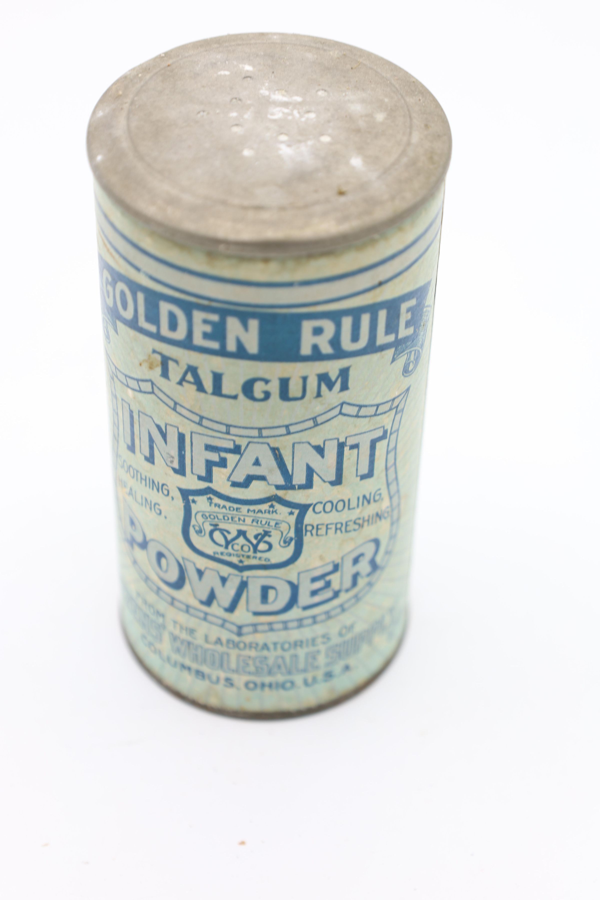 This can of Golden Rule Talcum Infant Powder likely dates back to the early twentieth century. The bottom of the can includes the text “From the Laboratories of The Citizen's Wholesale Supply, Columbus, Ohio, U. S. A. 'A Sanitary Powder Par Excellence'." The Citizens Wholesale Supply Company began in Columbus in 1895 and sold a wide variety of items, often under the Golden Rule name.Location