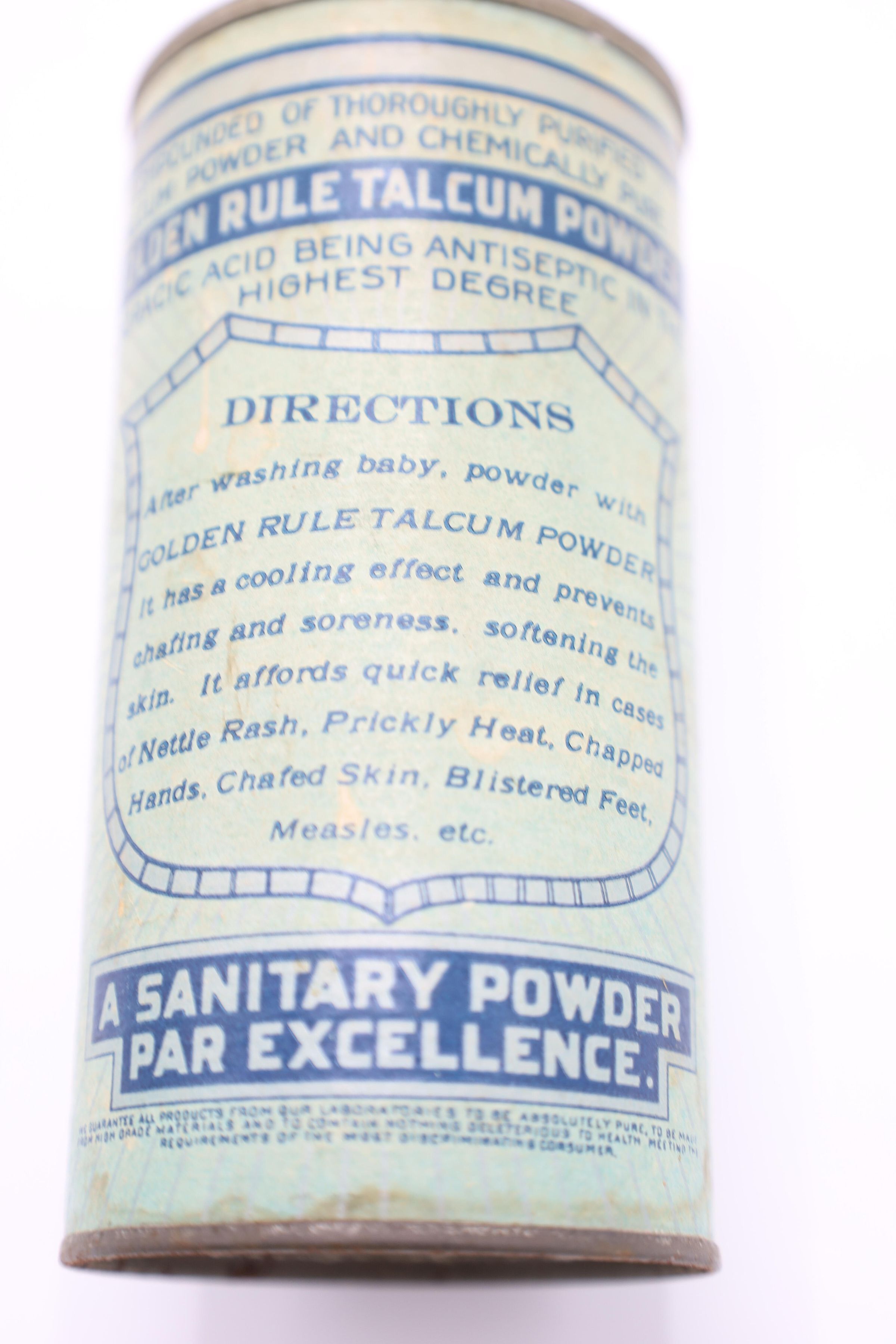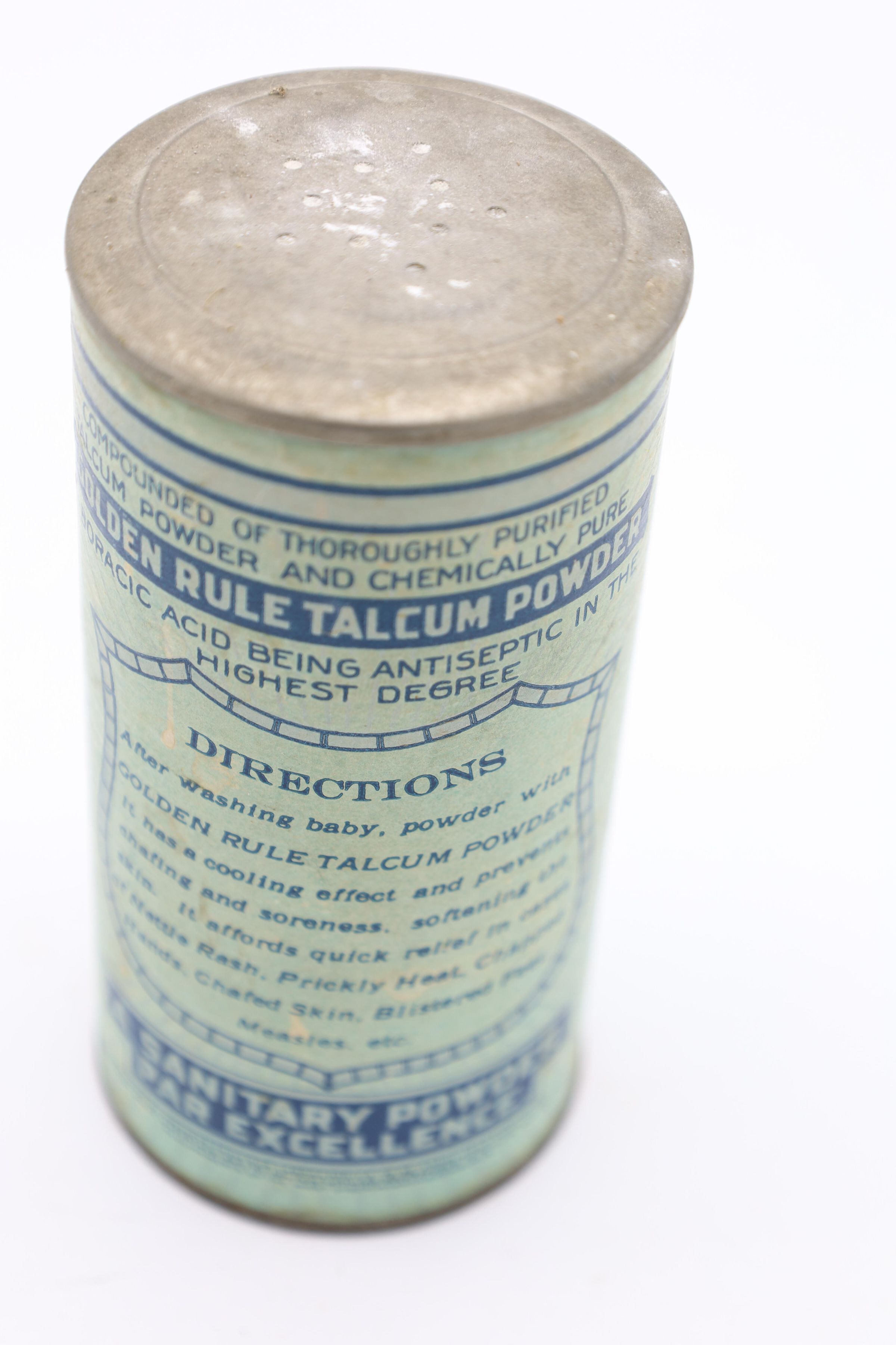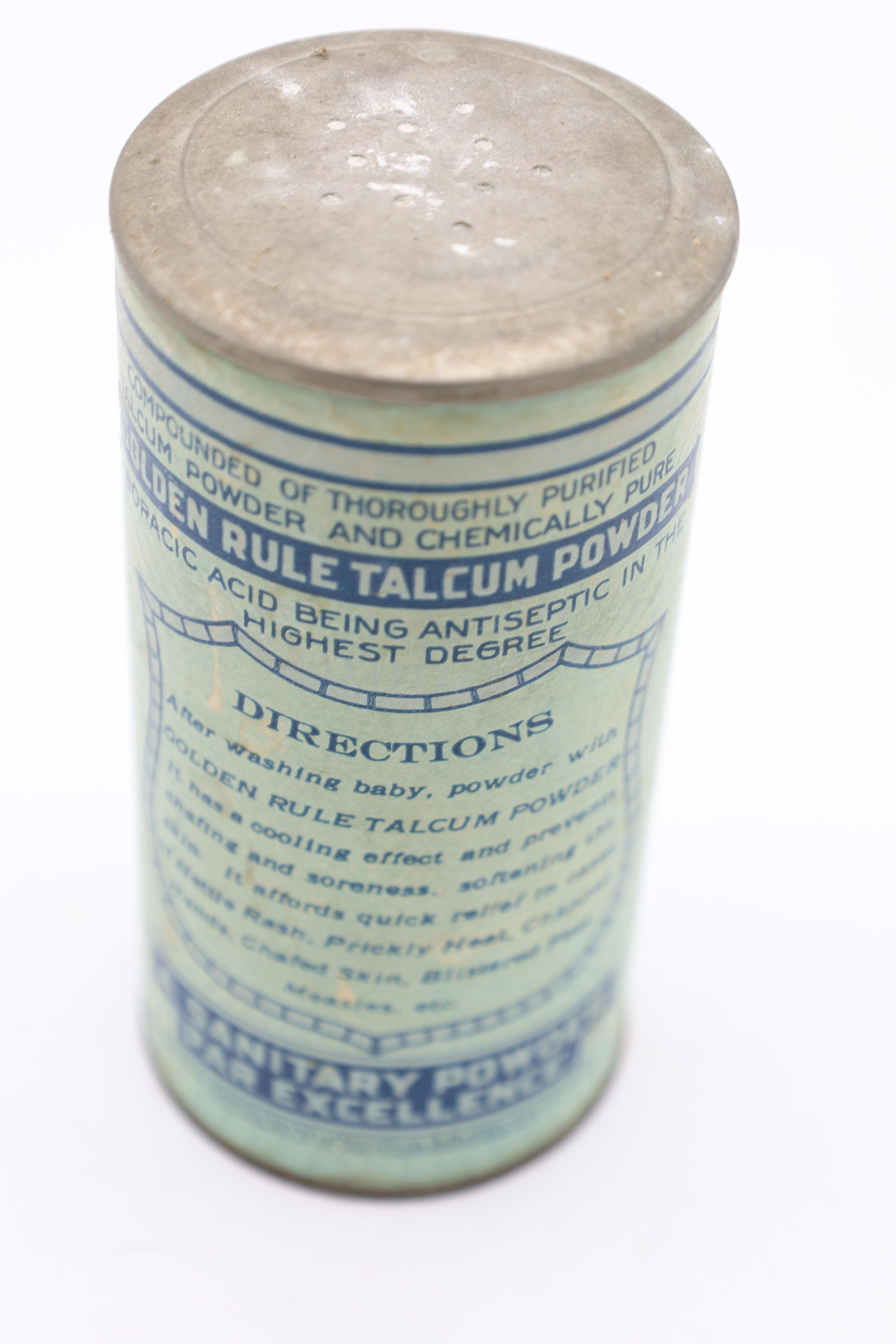 This can of Golden Rule Talcum Infant Powder likely dates back to the early twentieth century. The bottom of the can includes the text “From the Laboratories of The Citizen's Wholesale Supply, Columbus, Ohio, U. S. A. 'A Sanitary Powder Par Excellence'." The Citizens Wholesale Supply Company began in Columbus in 1895 and sold a wide variety of items, often under the Golden Rule name.Location