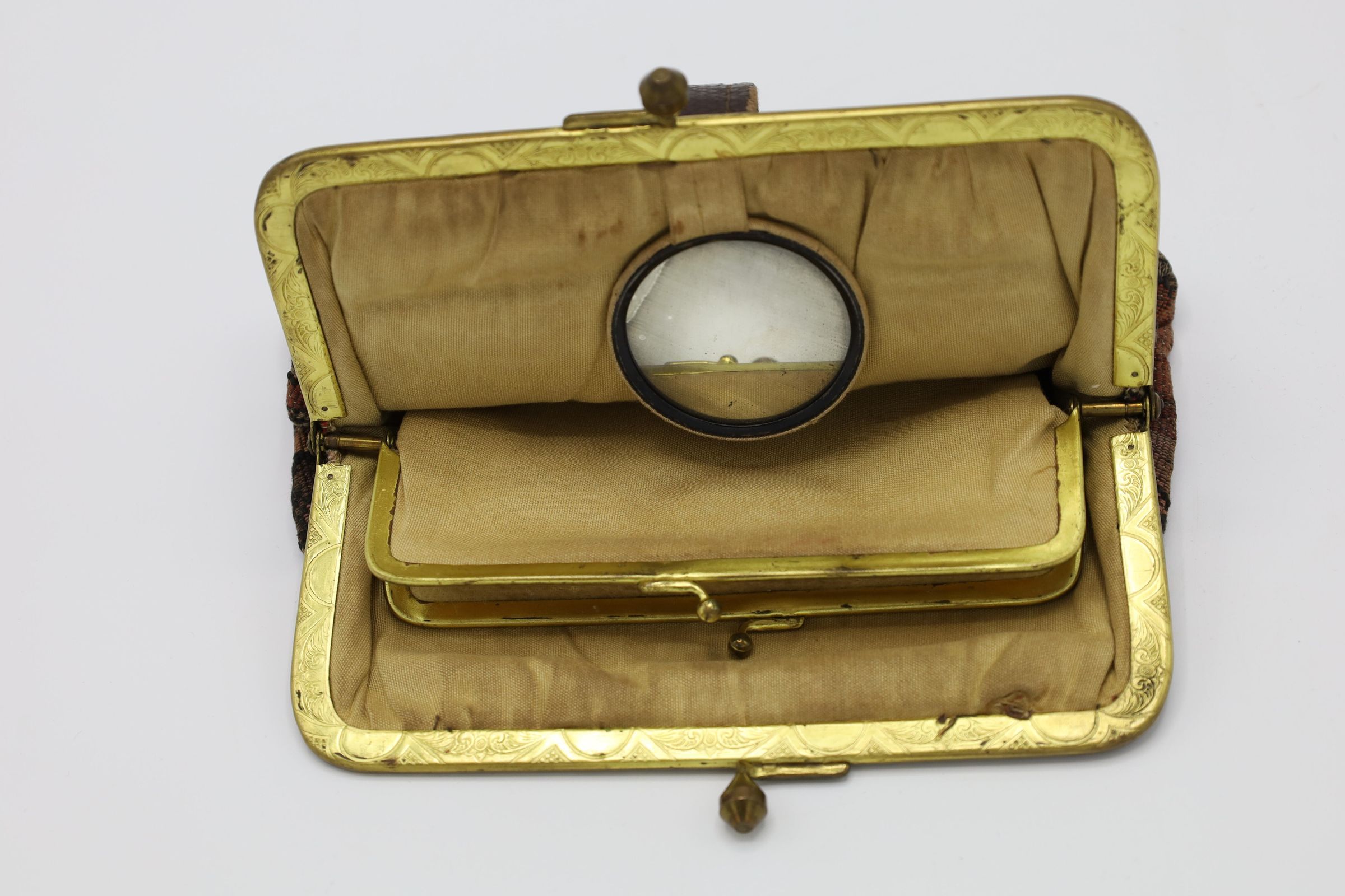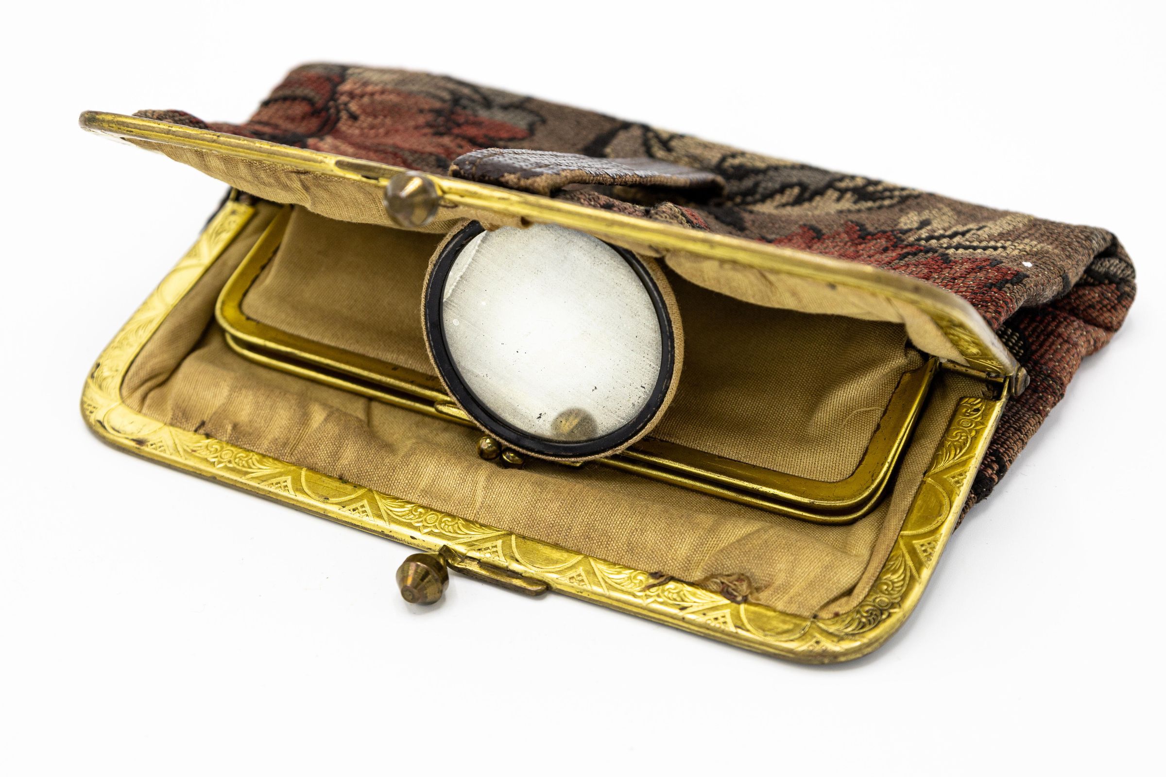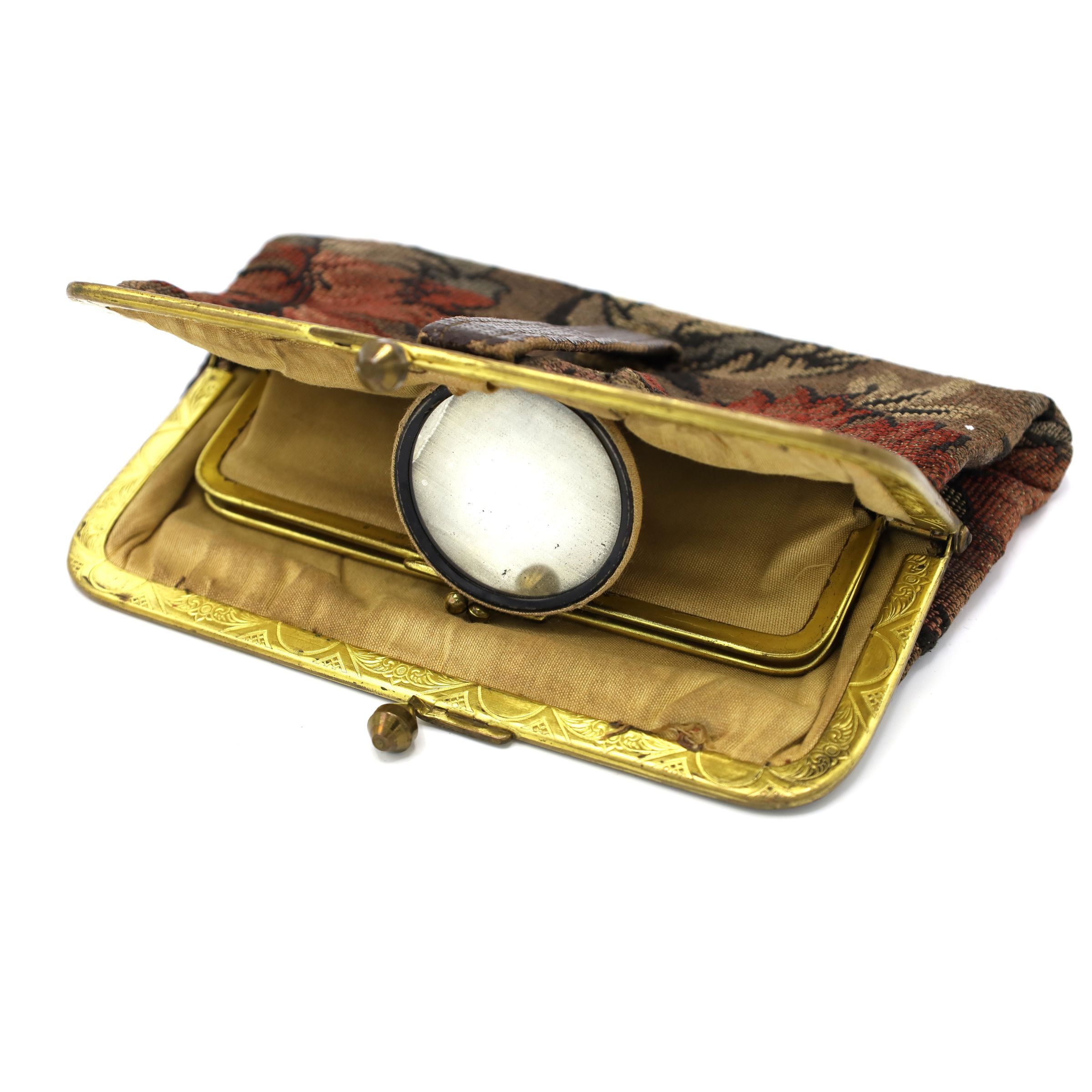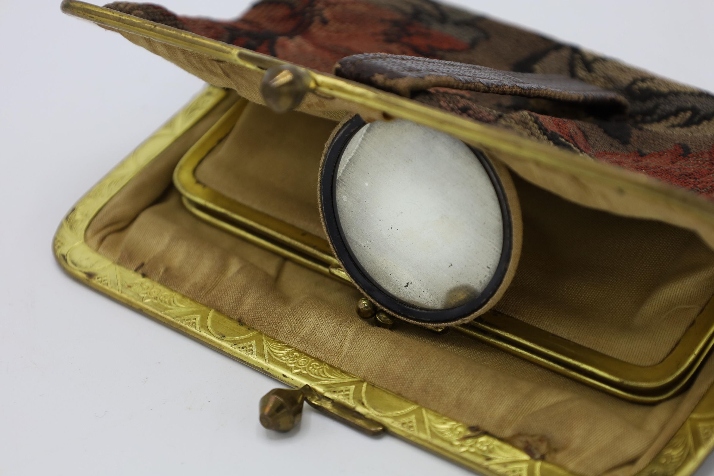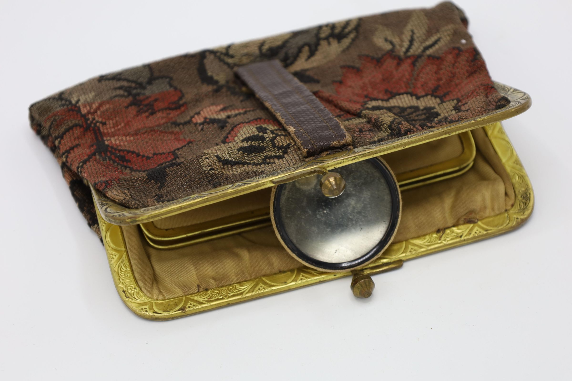 This is a floral-etched cloth tapestry clutch with brass-hinged framework and a mirror inside. Circa 1930-40.Location