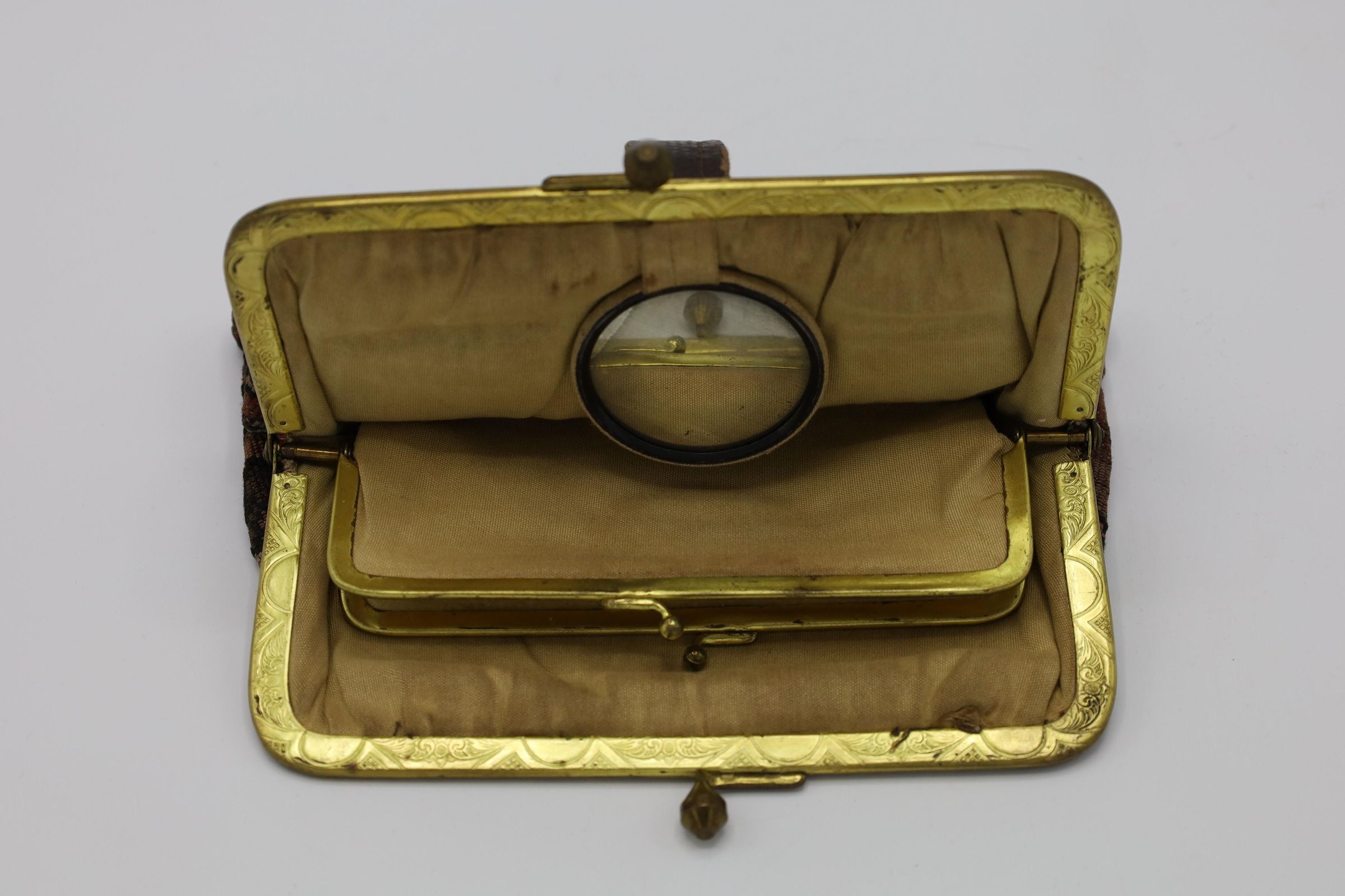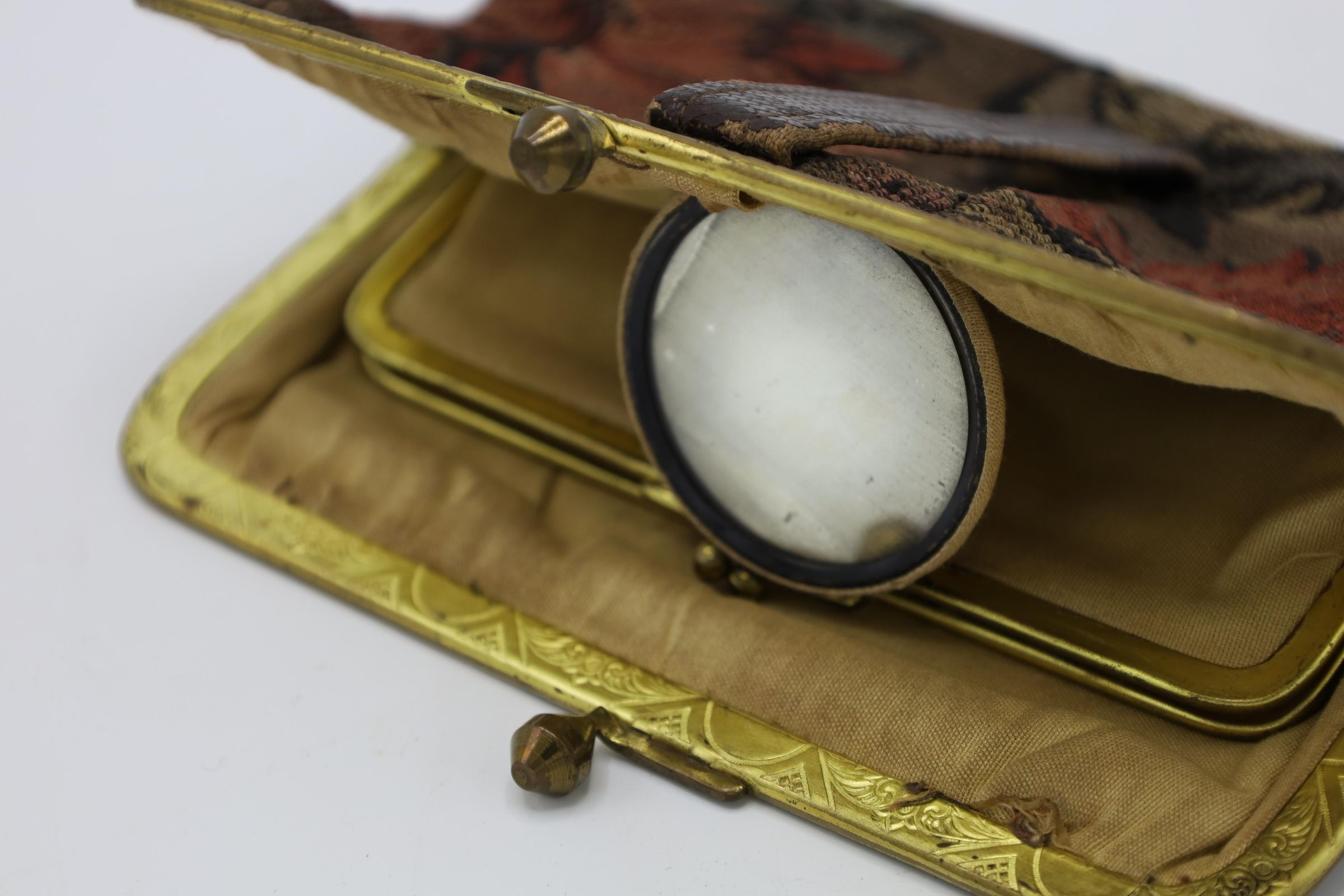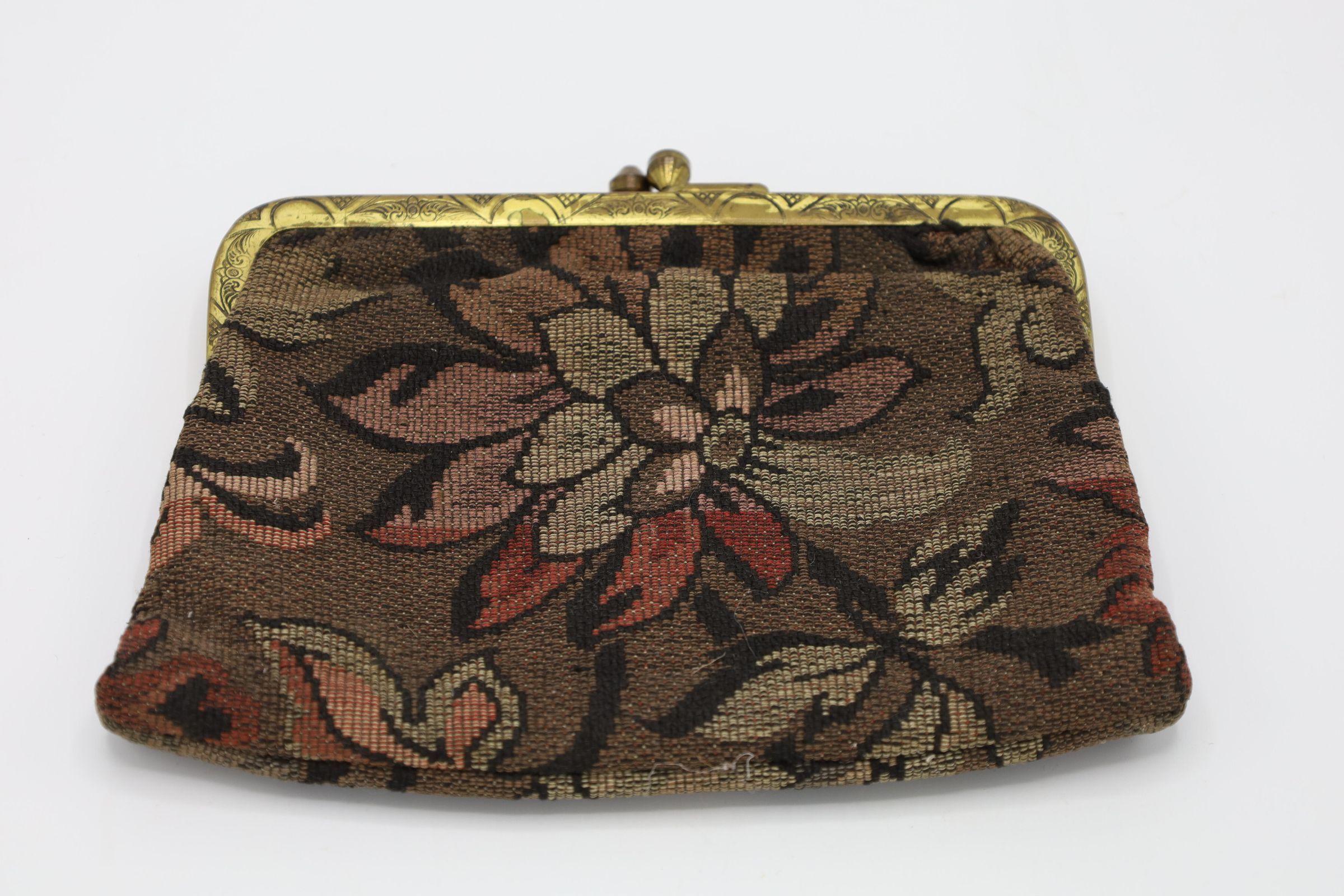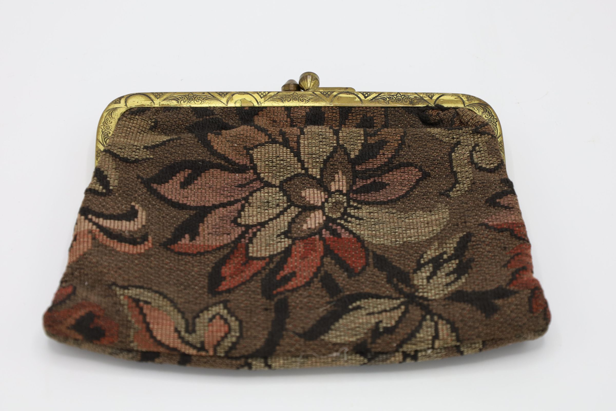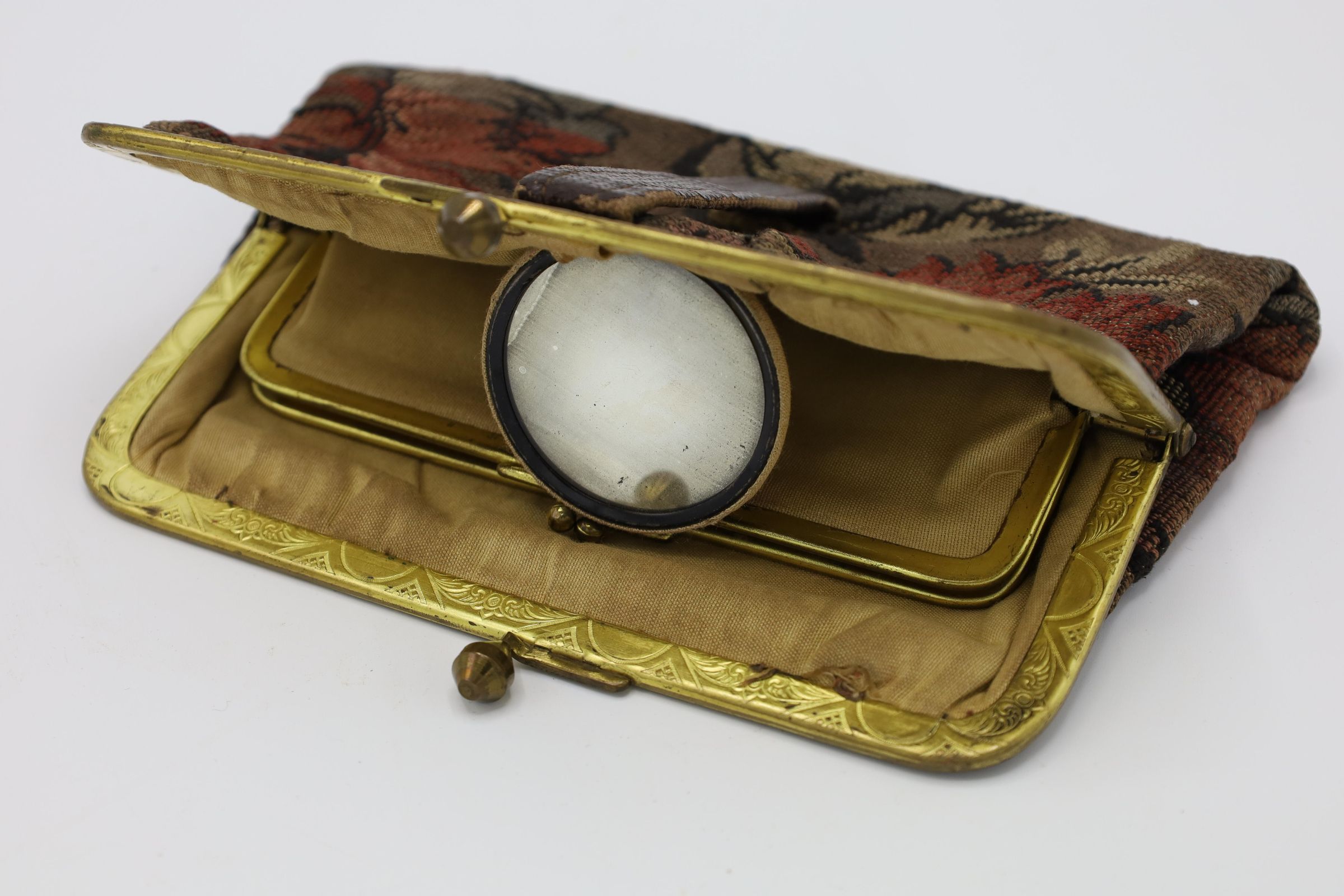This is a floral-etched cloth tapestry clutch with brass-hinged framework and a mirror inside. Circa 1930-40.Location