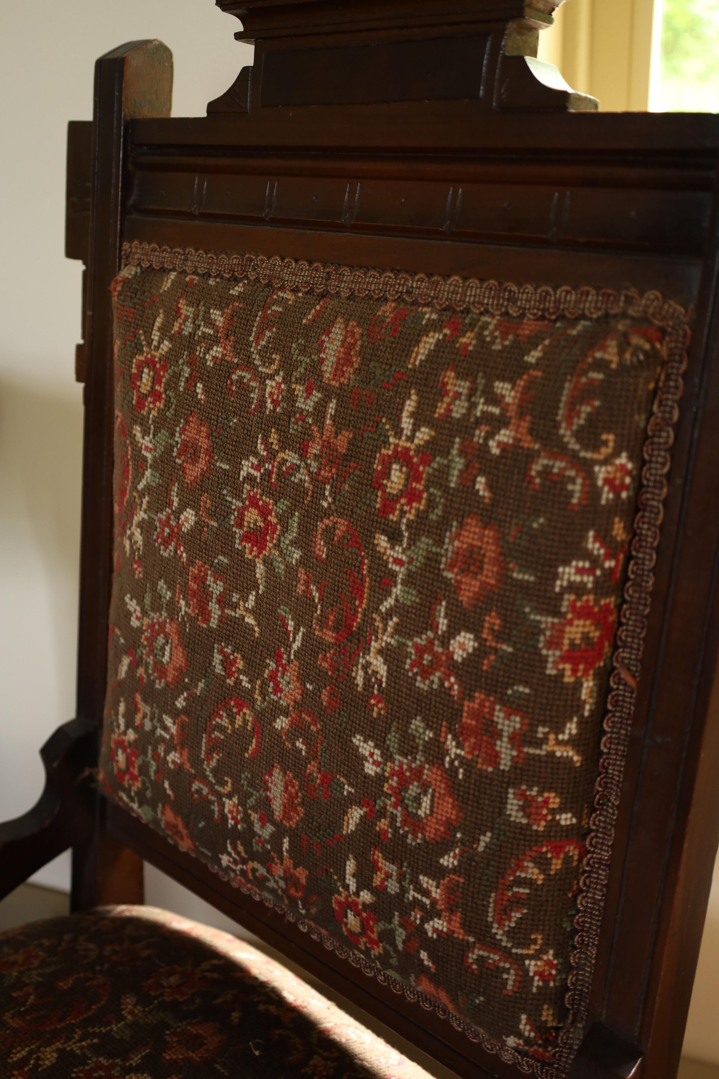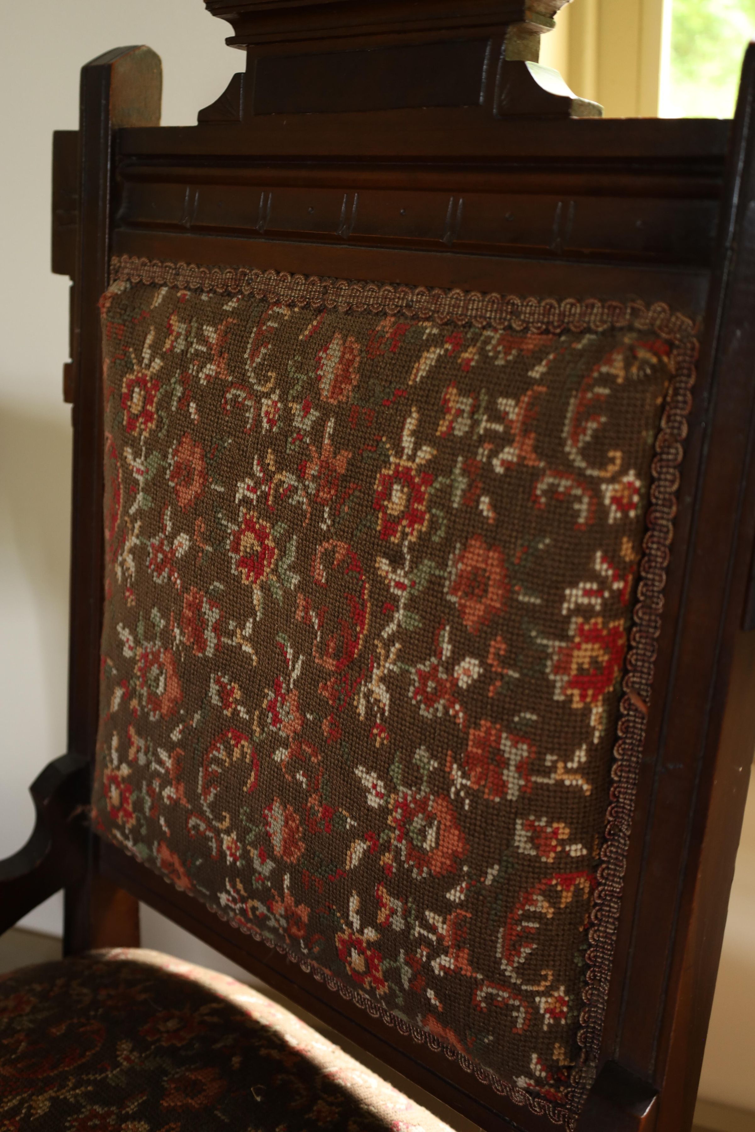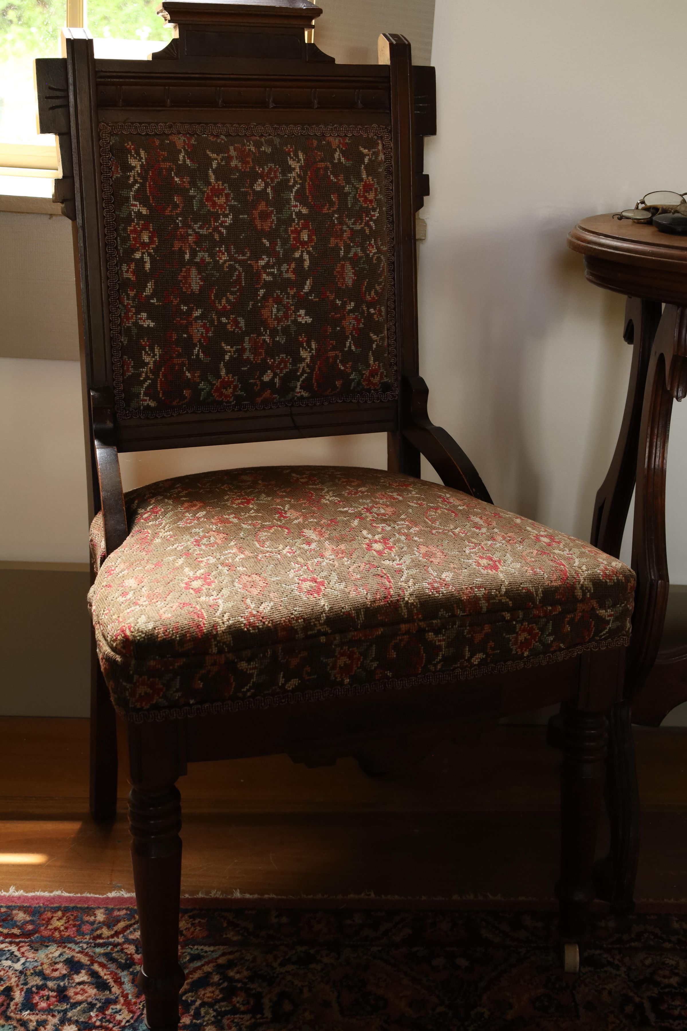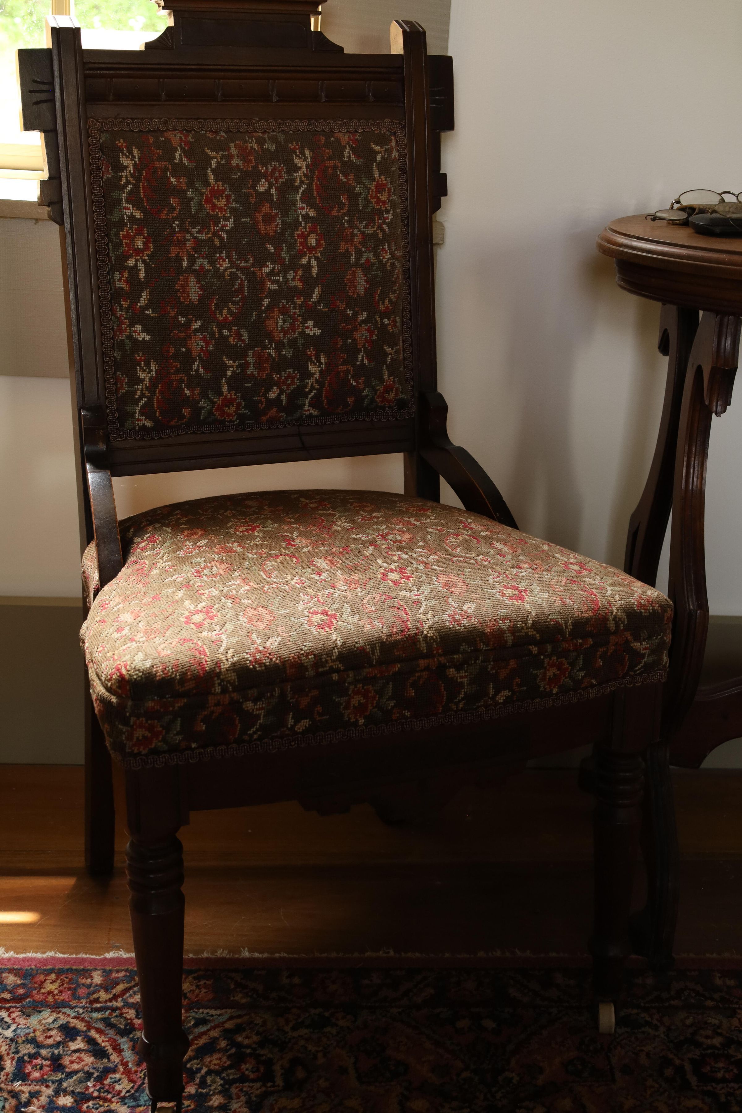 These late 18th or early 19th century wooden chairs have a tapestry needlepoint design on the back and seat. The chairs are set on casters. The green tapestry background spotted with red, maroon, and orange colored flowers resembles furniture made during the Eastlake movement, (19th century household design reform movement).Location