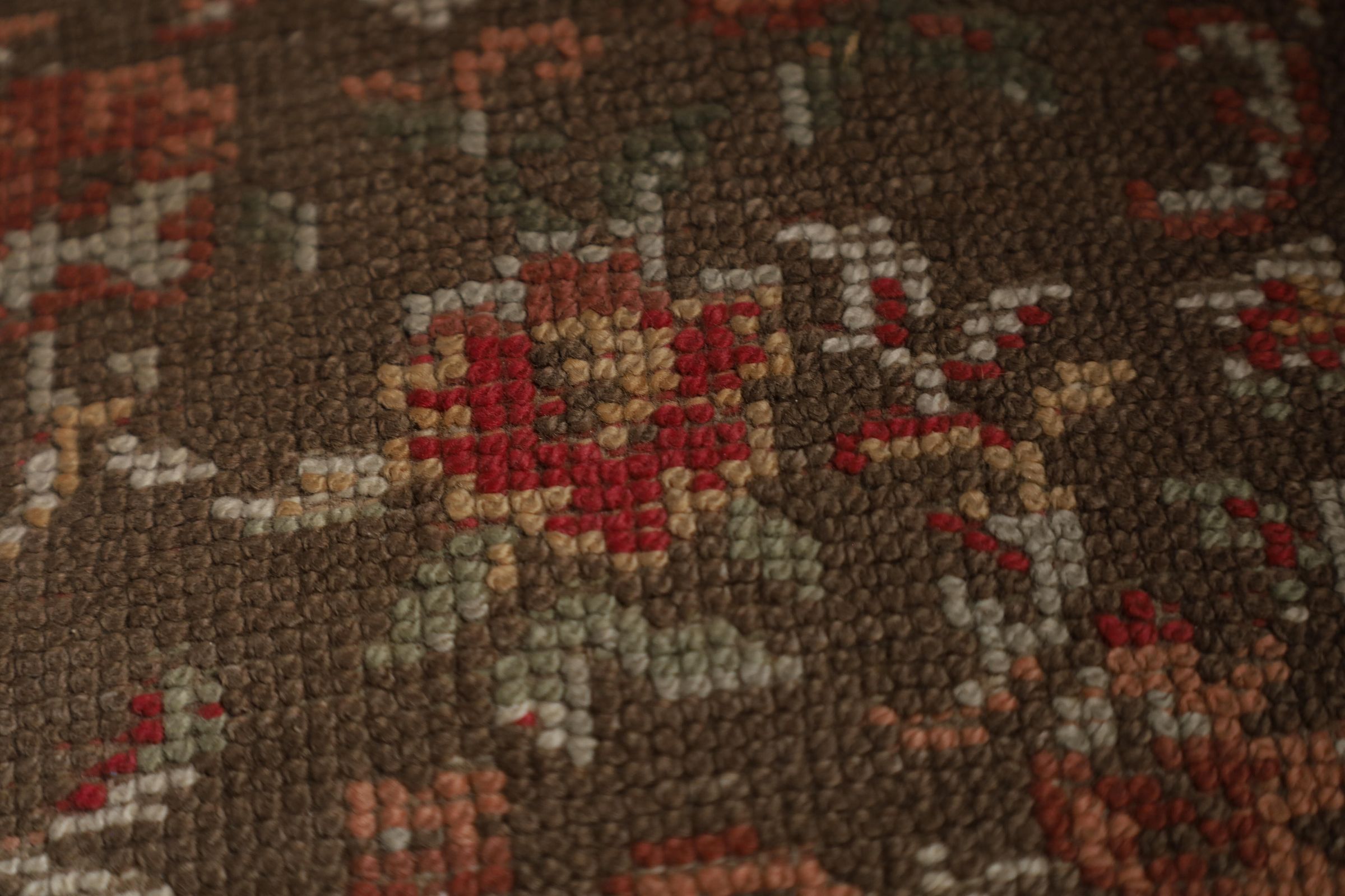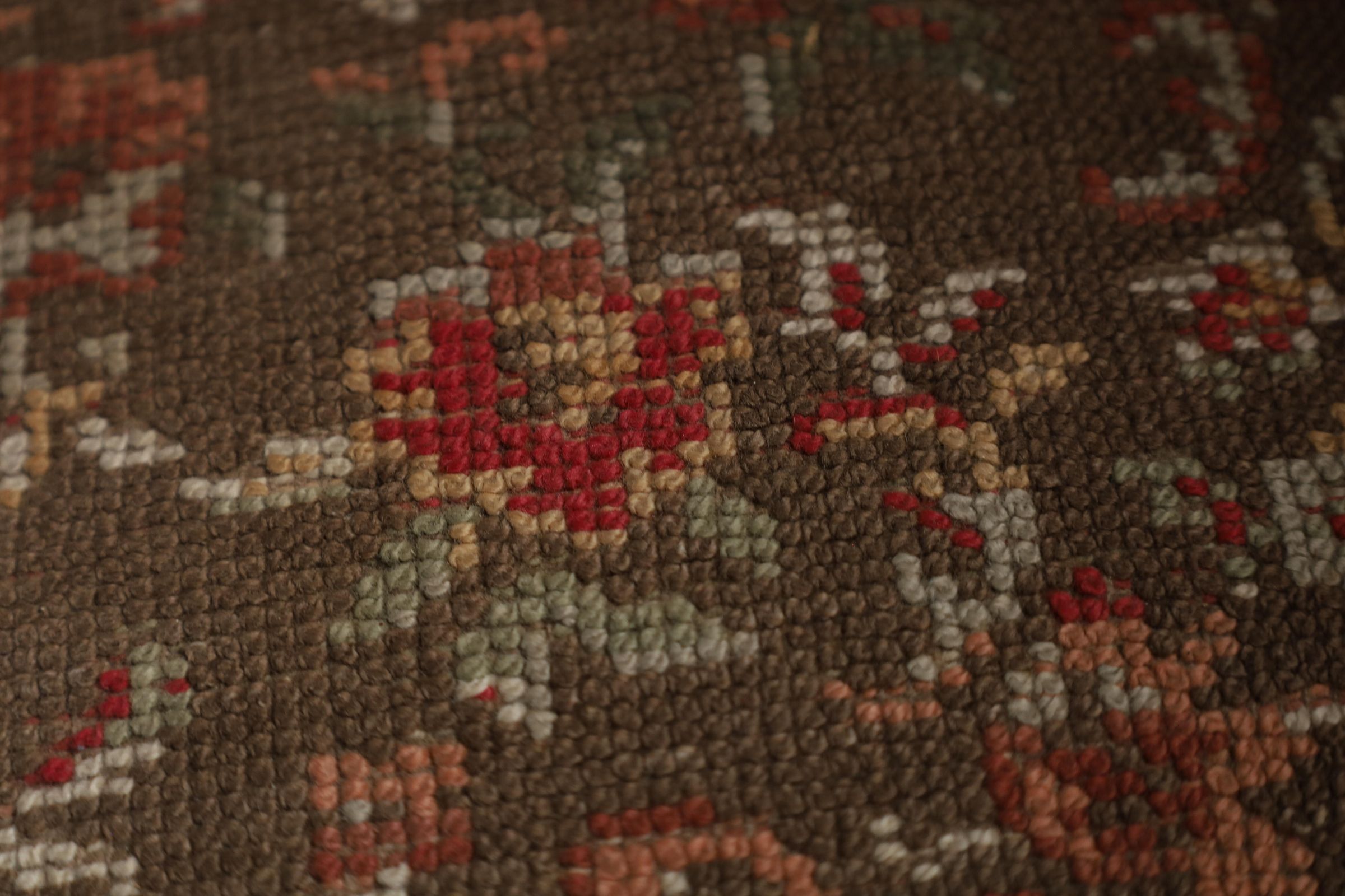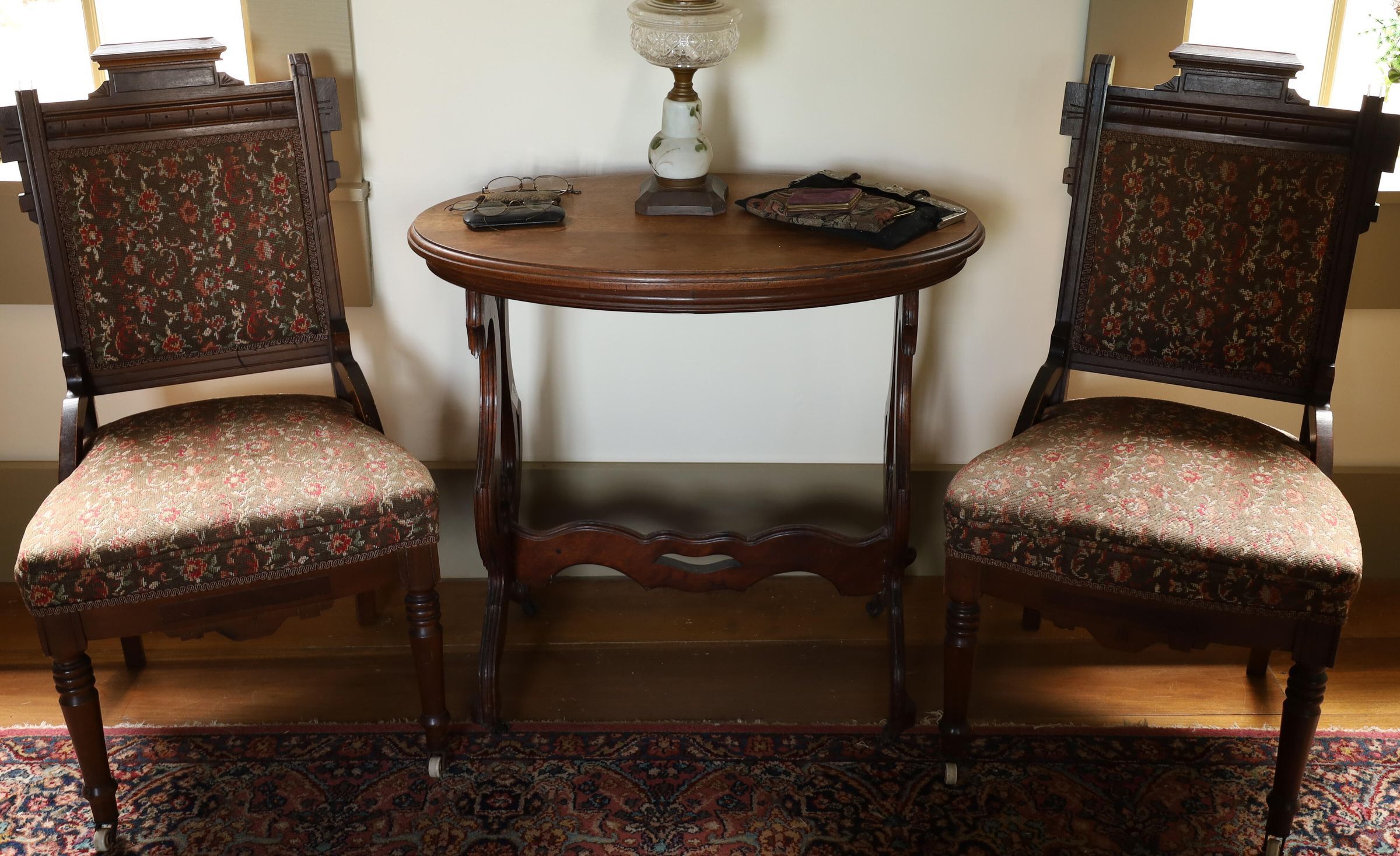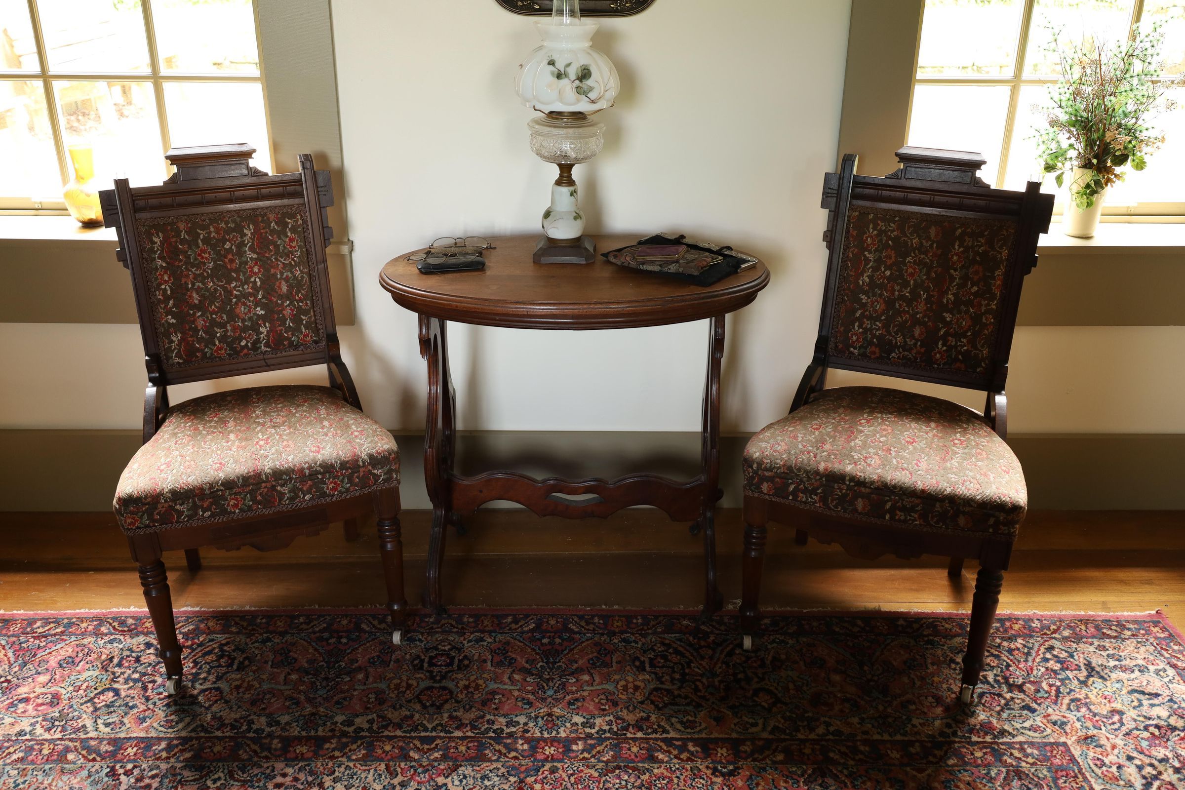 These late 18th or early 19th century wooden chairs have a tapestry needlepoint design on the back and seat. The chairs are set on casters. The green tapestry background spotted with red, maroon, and orange colored flowers resembles furniture made during the Eastlake movement, (19th century household design reform movement).Location