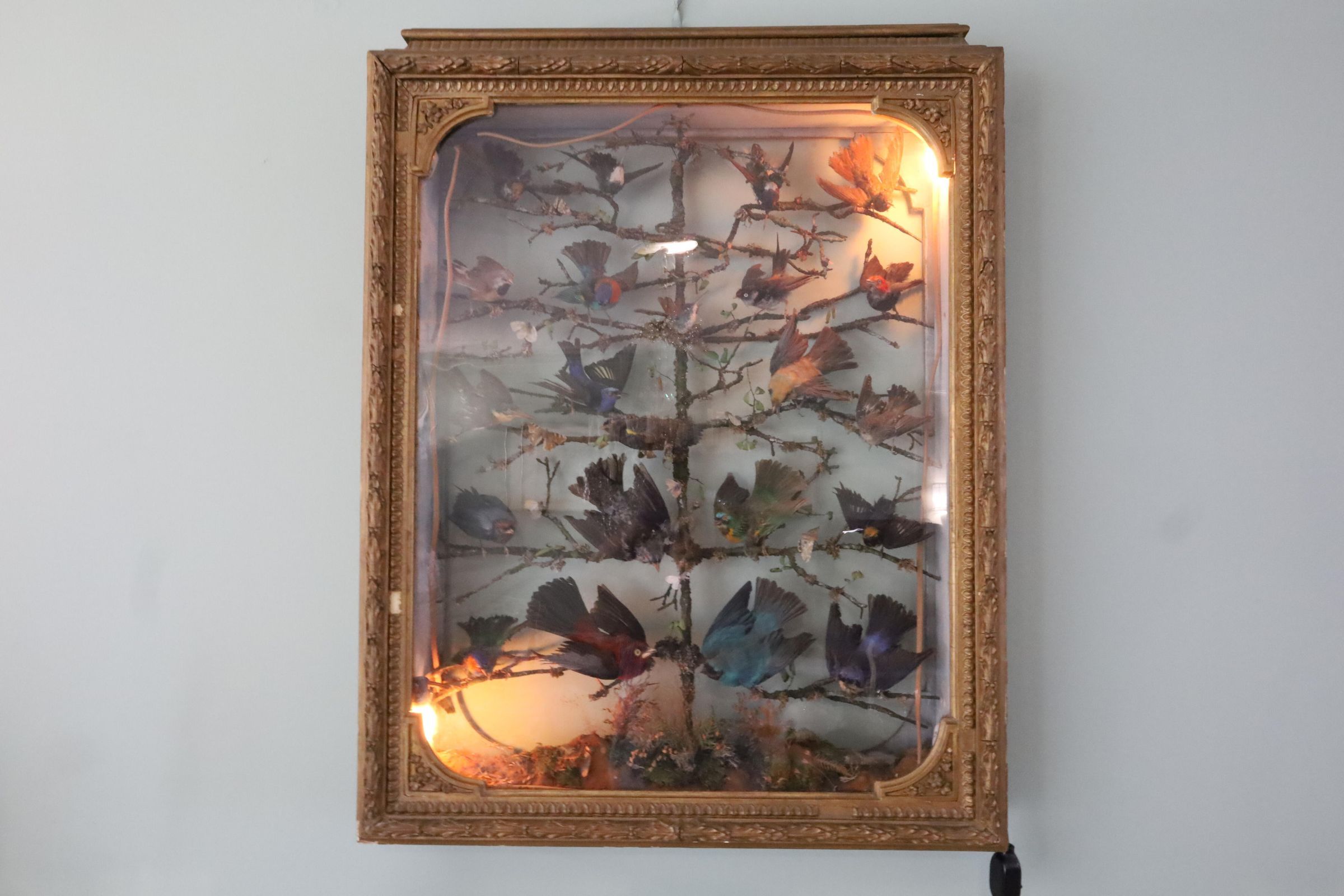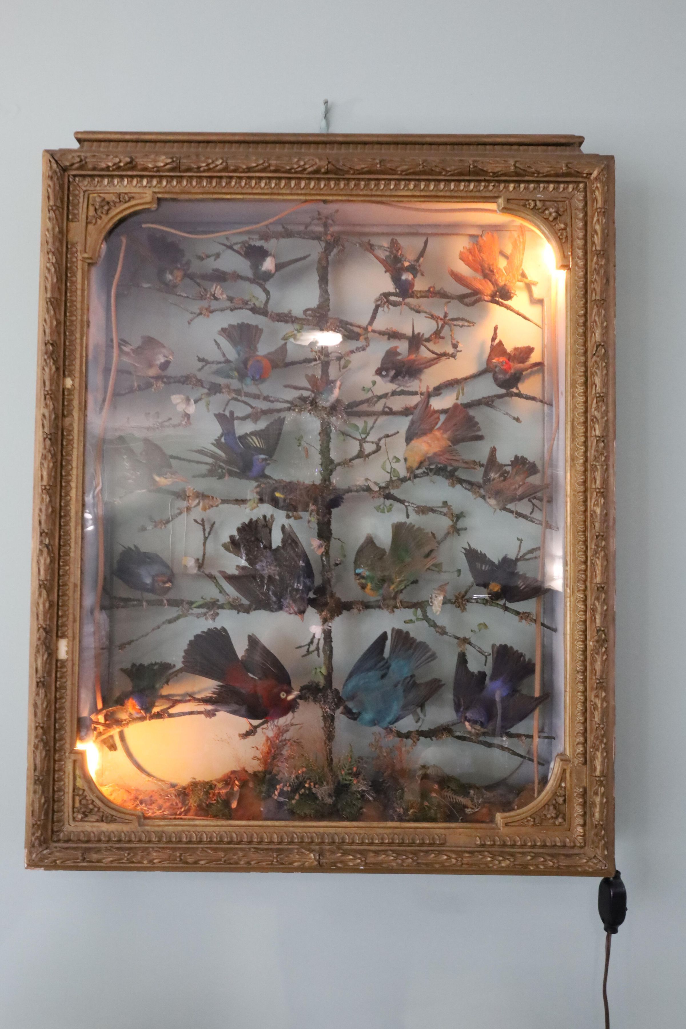Framed and illuminated taxidermy birds mounted on branches with moths on some leaves. This specimen cabinet features birds arranged in 'flight' posture with wings opened. There are hummingbirds on the top row with perching birds and song birds perched on lower branches. The ornate gold leaf frame on the shadowbox does not conceal the wiring or light bulbs. This might have been rewired for electric lights as these sorts of displays were popular in the 1800s.Location