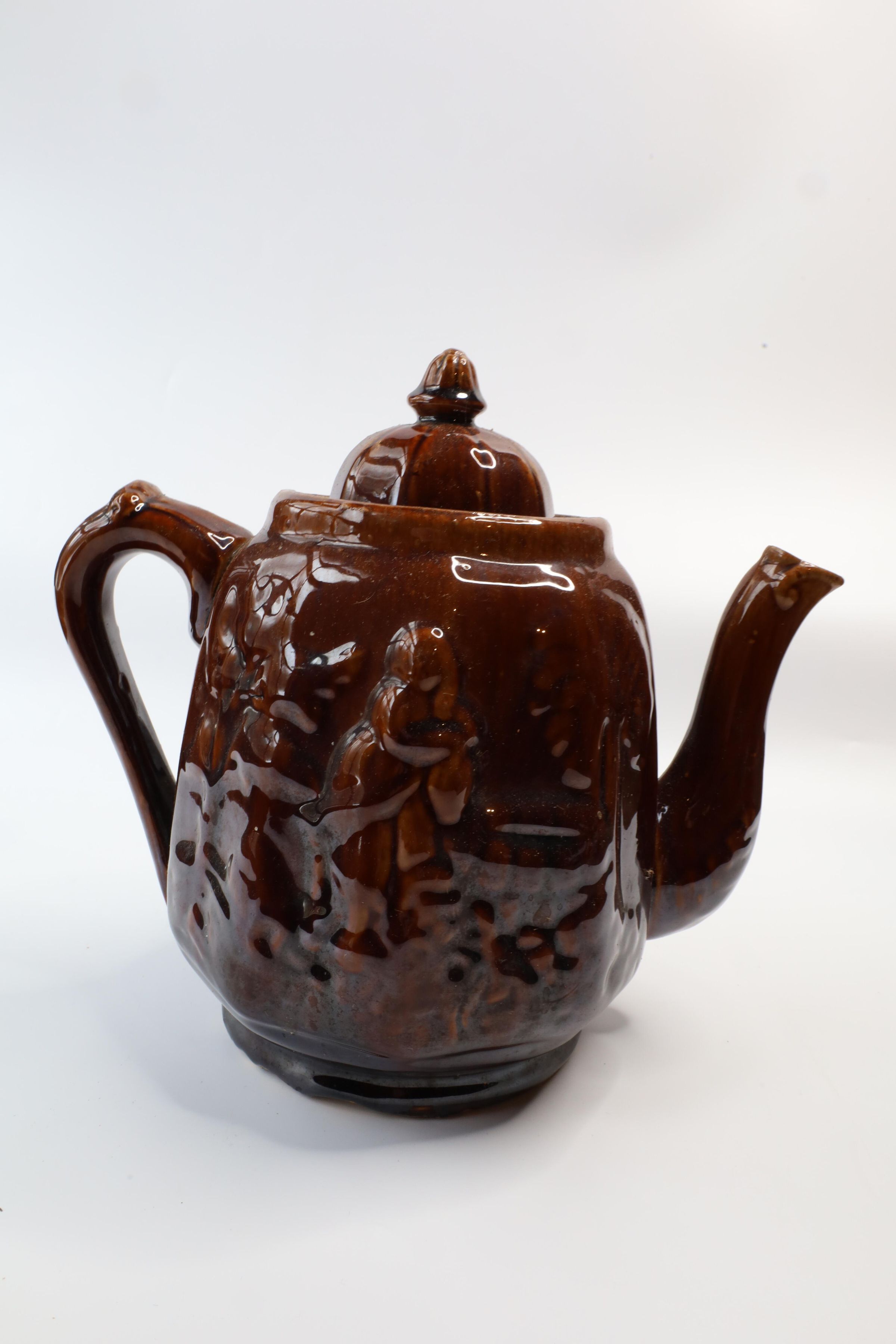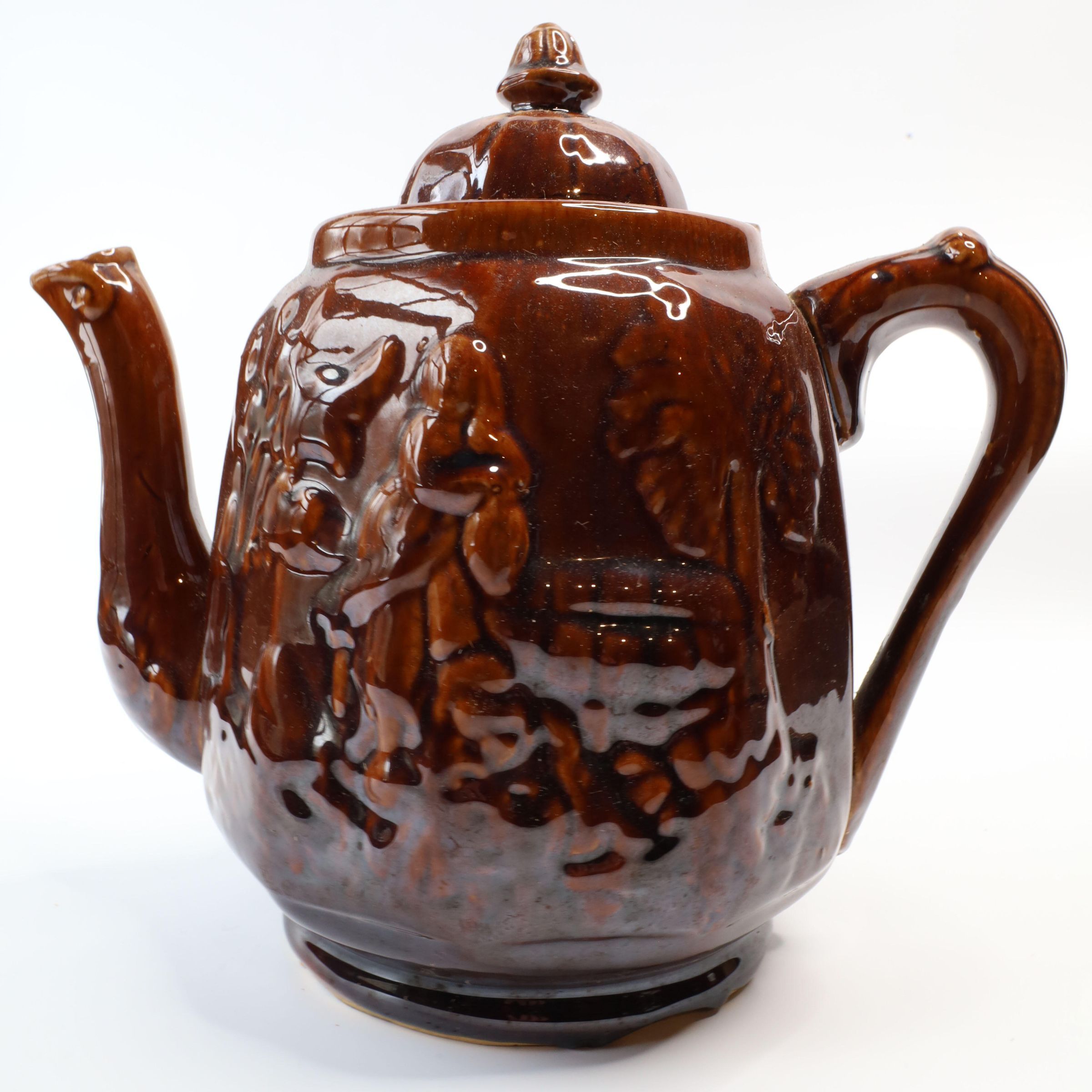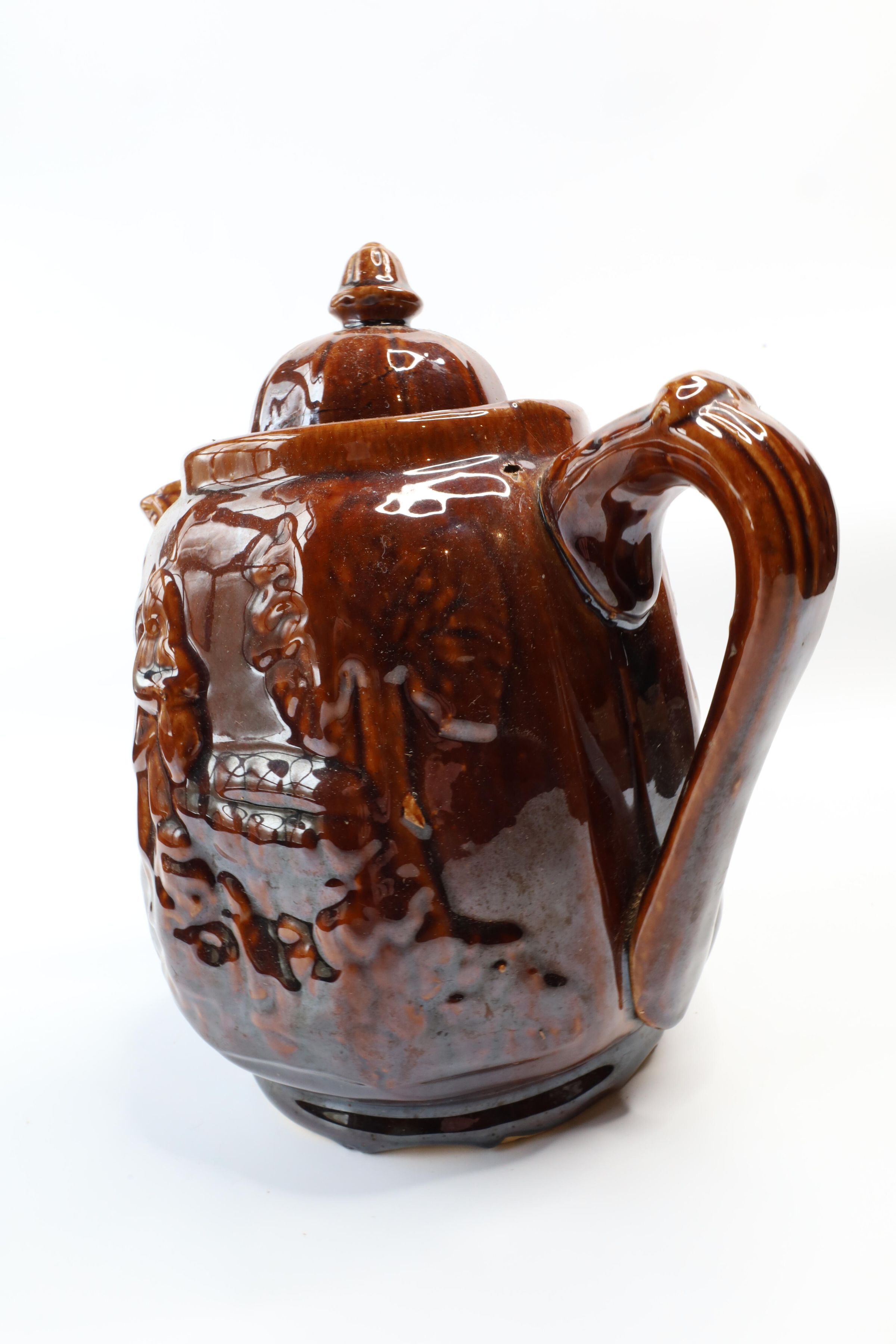 This ceramic teapot with a Rockingham glaze with a raised design of a woman retrieving water from a well. It is often referred to as "Rebekah At The Well."