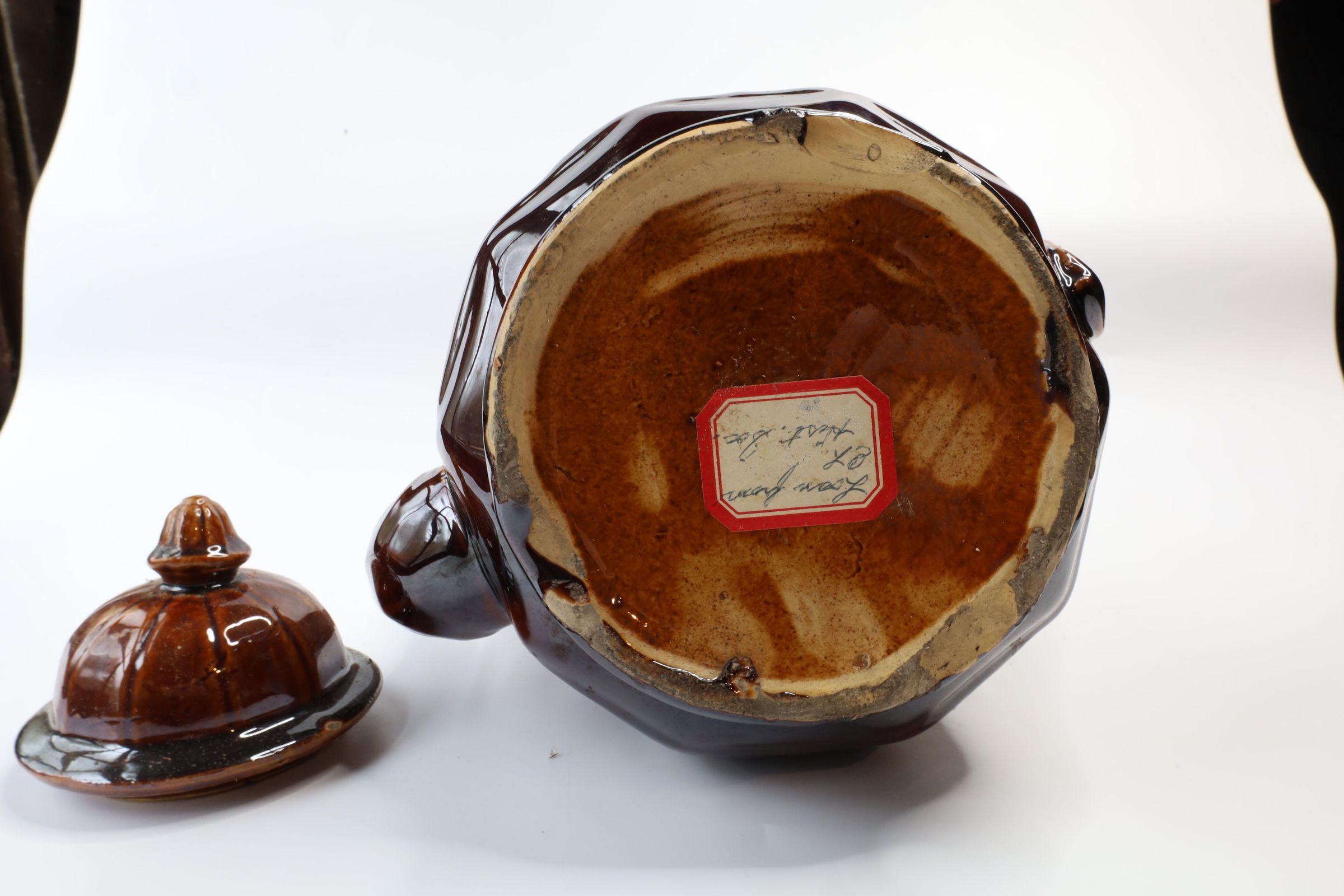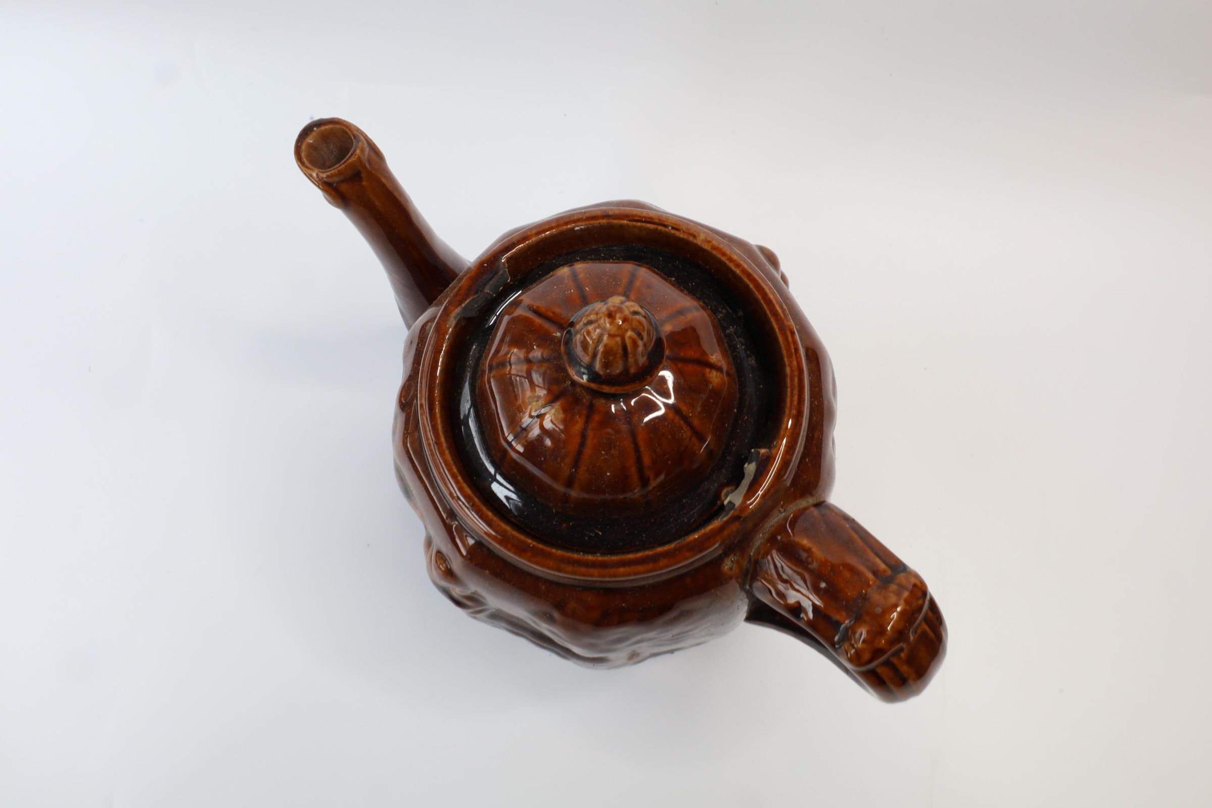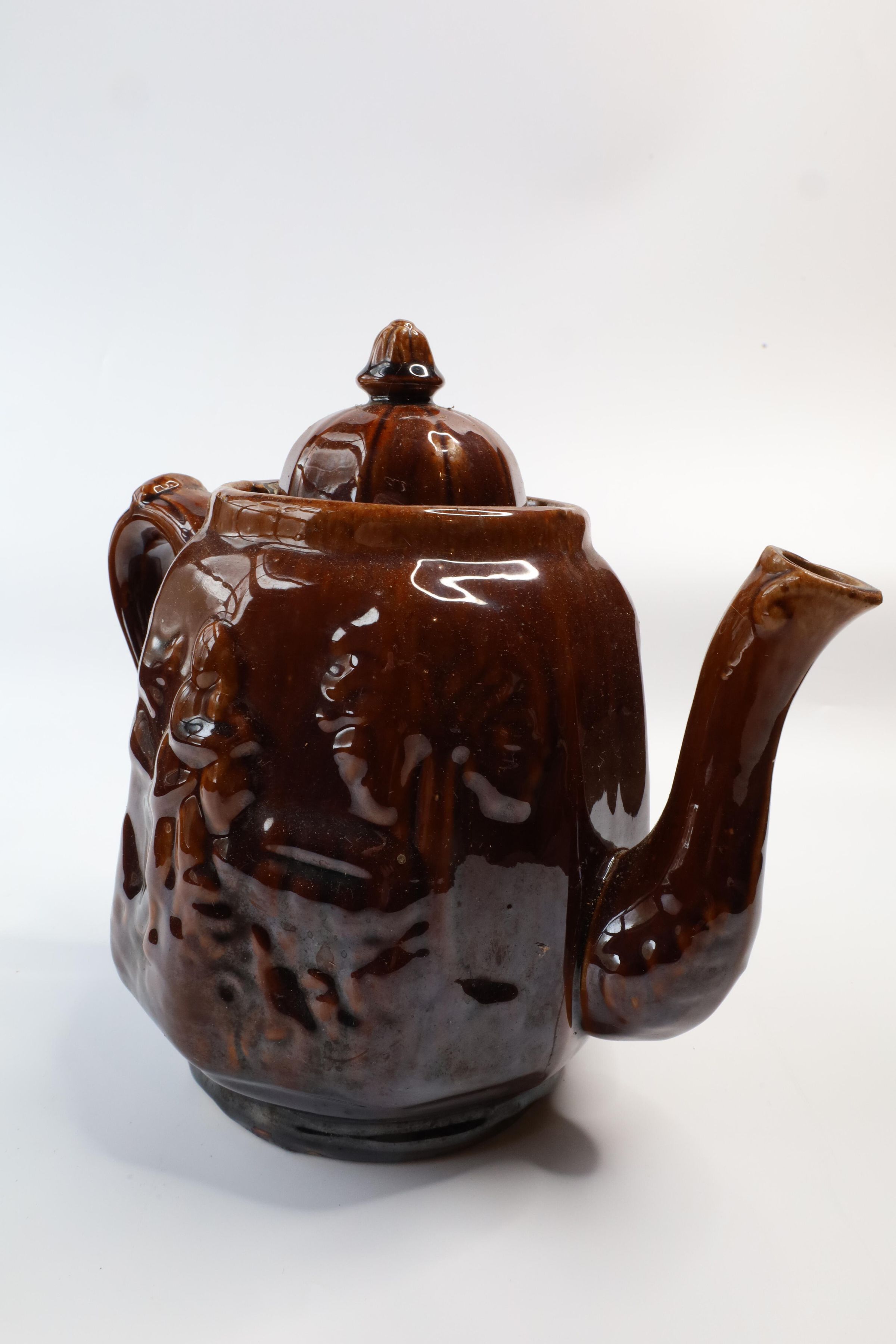 This ceramic teapot with a Rockingham glaze with a raised design of a woman retrieving water from a well. It is often referred to as "Rebekah At The Well."