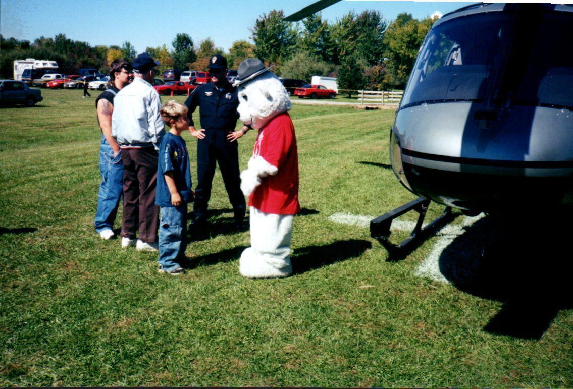 A child interacts wit the Ohio Highway Patrol's mascot, Teddy Trooper, in autumn of 2021 during an event at Indian Lake State Park.