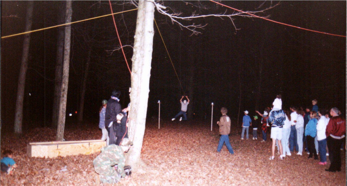Someone wearing a hockey mask emerges on a zipline to frighten parkgoers attending a haunted Halloween hike at Pike Lake State Park.