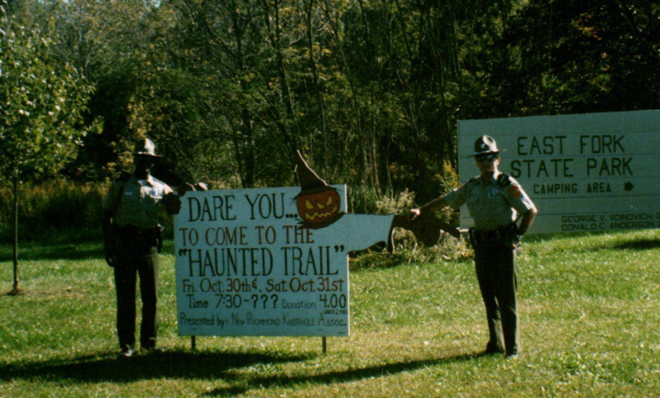 Two parks rangers stand on either side of the sign urging visitors to take a hike on their haunted Halloween trail.