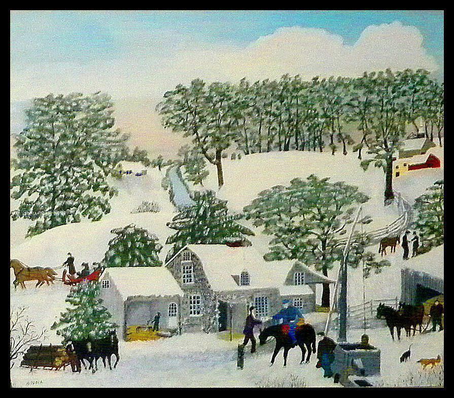For years, busy with children and grandchildren, Anna had limited her creative efforts to embroidered yarn pictures. Then, in her mid-seventies, when arthritis in her hands made fine needlework increasingly tricky, she began painting pictures of her memories of growing up on farms. In these paintings, Grandma Moses presented a somewhat romanticized version of farm life in the mid-nineteenth century, with images of harvests, sugar maple time, barn dances, Christmas dinners, and beautiful bucolic landscapes, among others, the primary subjects of her work.