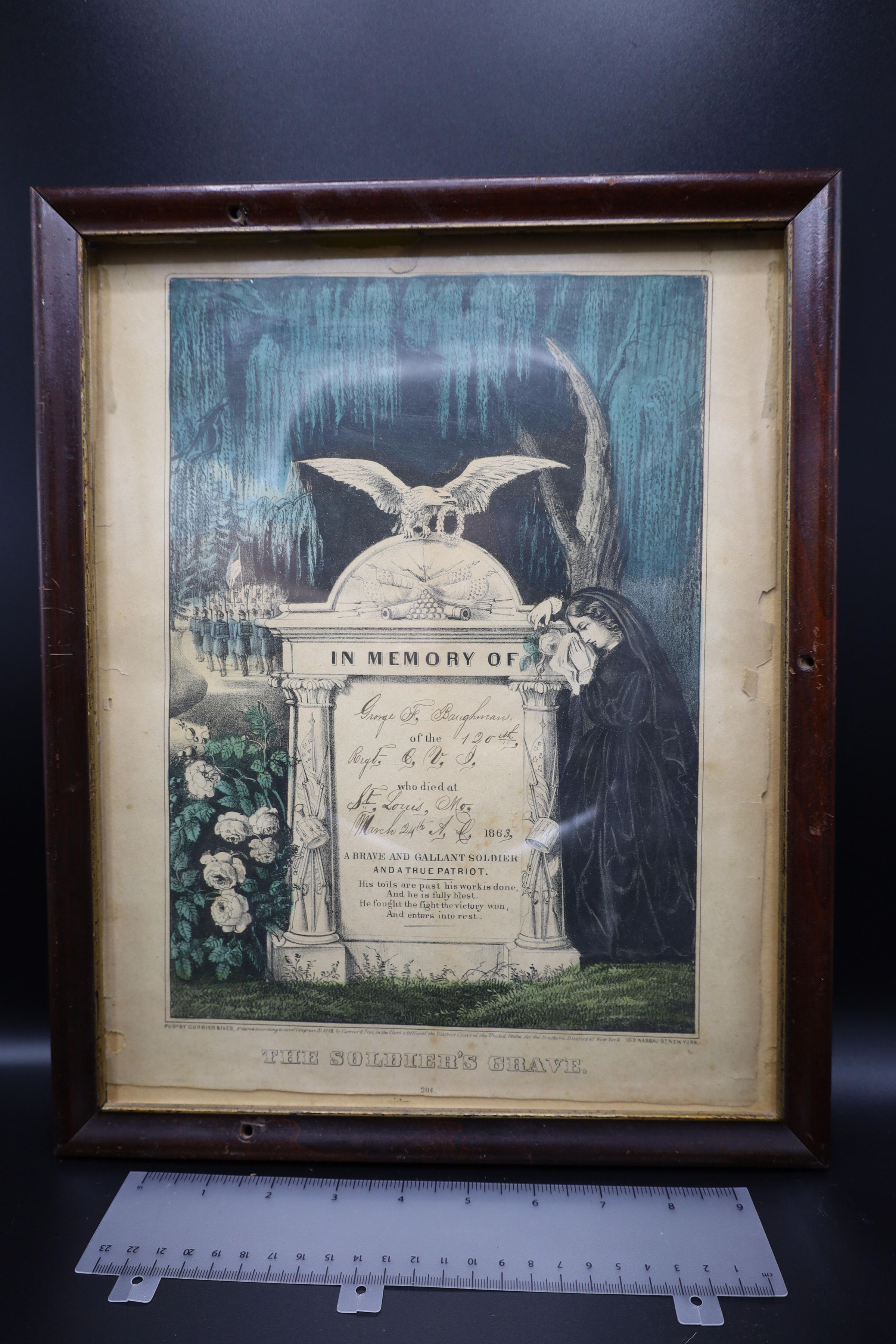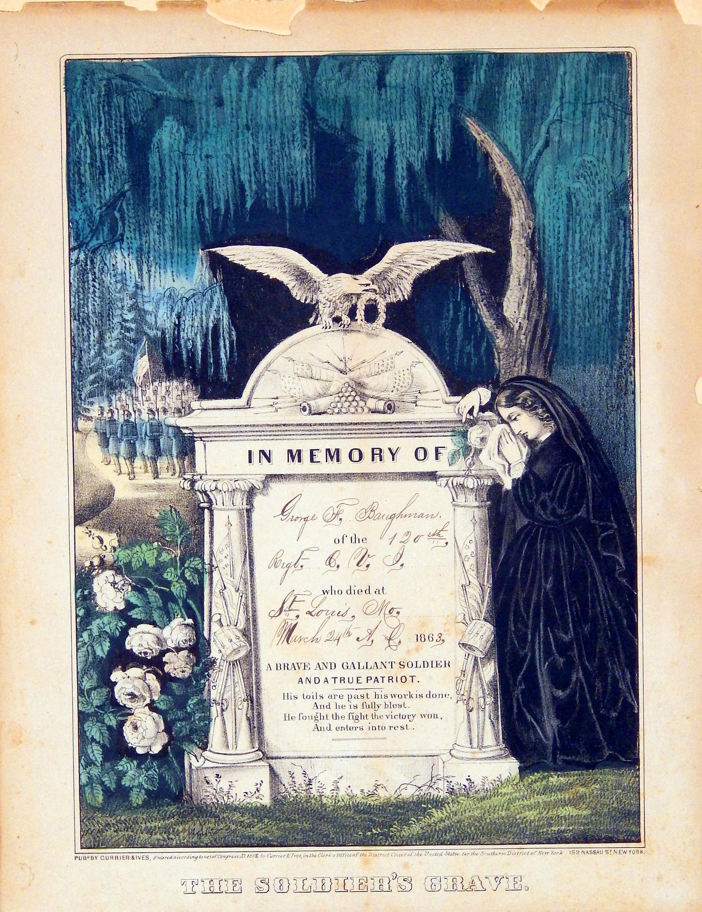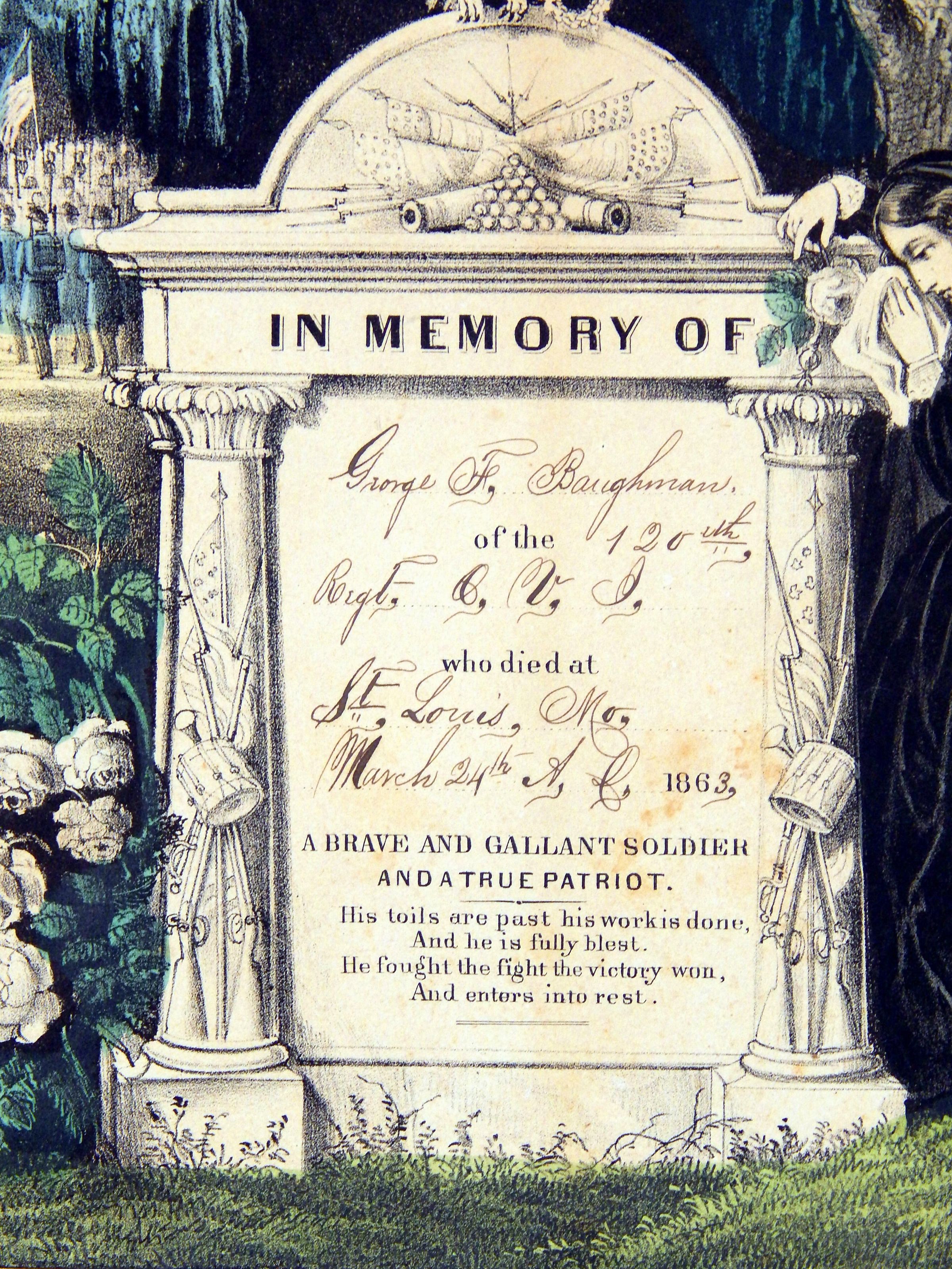 "The Soldier's Grave," a Currier and Ives Civil War memorial lithographic certificate, is framed in dark wood with a gold accent border along the inside. The certificate shows a headstone surrounded by trees. A mourning woman leans against the headstone. The name and dates are filled in by hand. This certificate commemorates George Baughman, of the 120th Ohio Volunteer Infantry, who died in St. Louis on March 24, 1863. He is currently buried in Mount Olivet Cemetery on the grounds of Malabar Farm State Park.Context