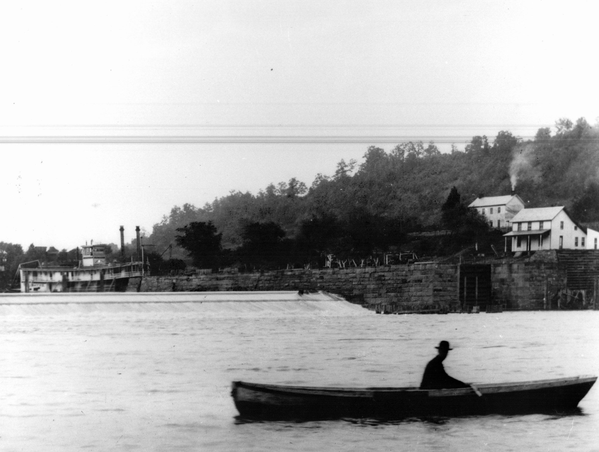 A man in a rowboat crosses in front of Muskingum River's Lock #6 in Stockport. In the photograph's background, the steamboat T. M. Bayne enters the lock to avoid the low head dam. Built in 1890 at Brownsville, Pennsylvania, the T. M. Bayne was a packet boat that hauled mail, cargo, and people. This vessel operated along two circuits during its working life: from Steubenville, Ohio to Wheeling, West Virginia and between Zanesville and McConnelsville. The steamboat sank near Steubenville in 1904 after being crushed by ice from the frozen Ohio River.