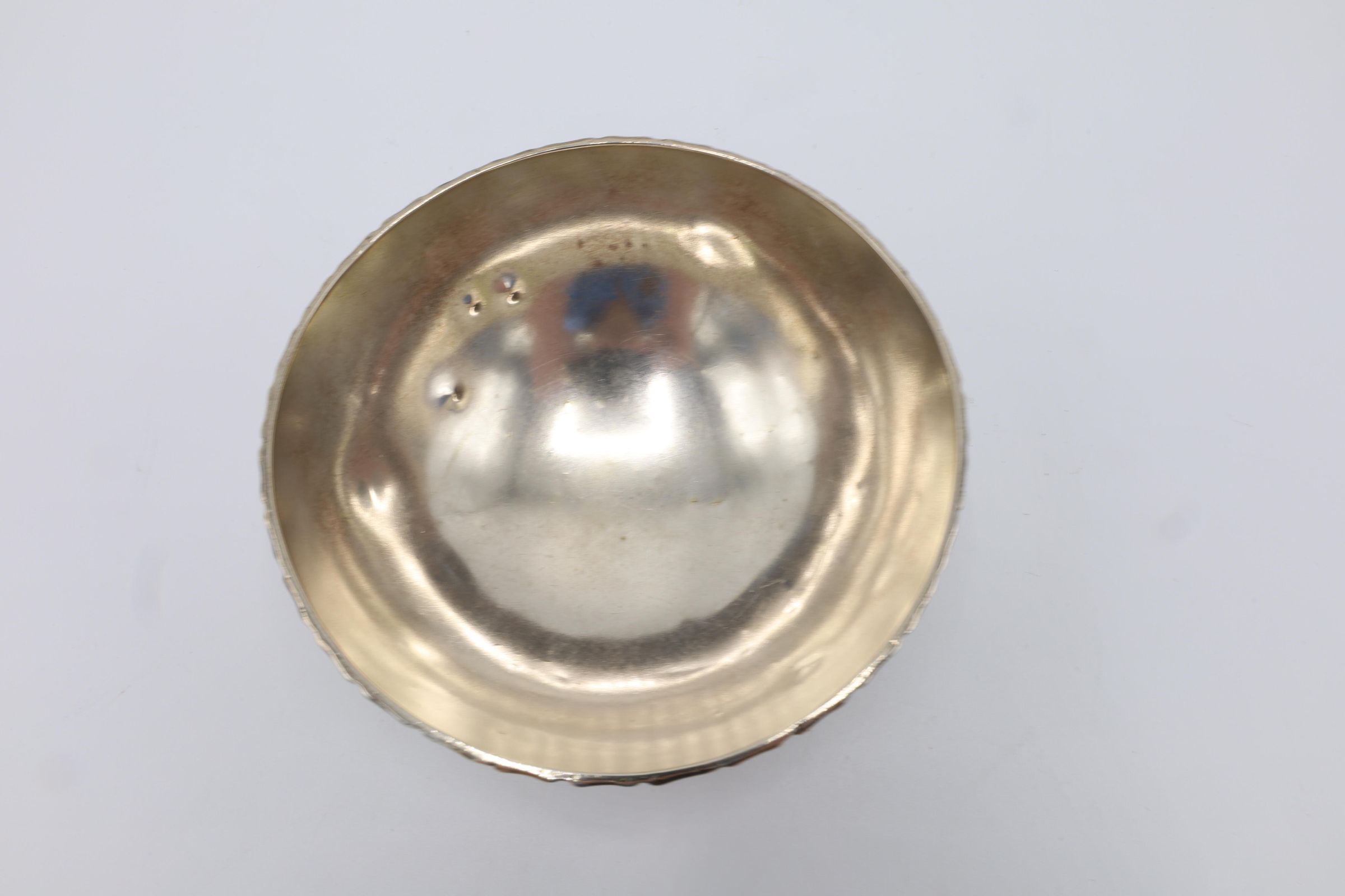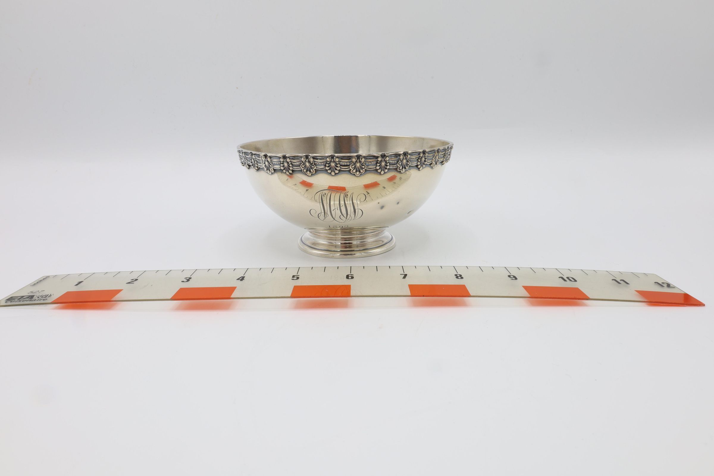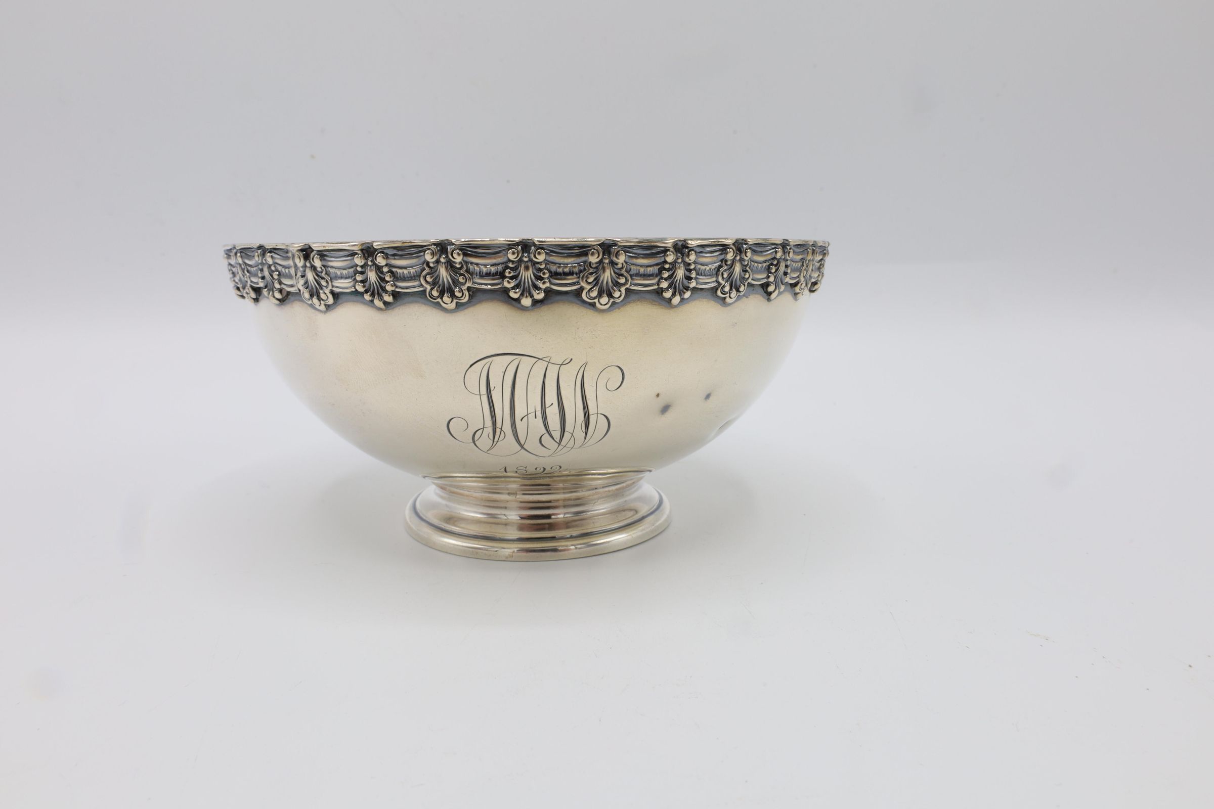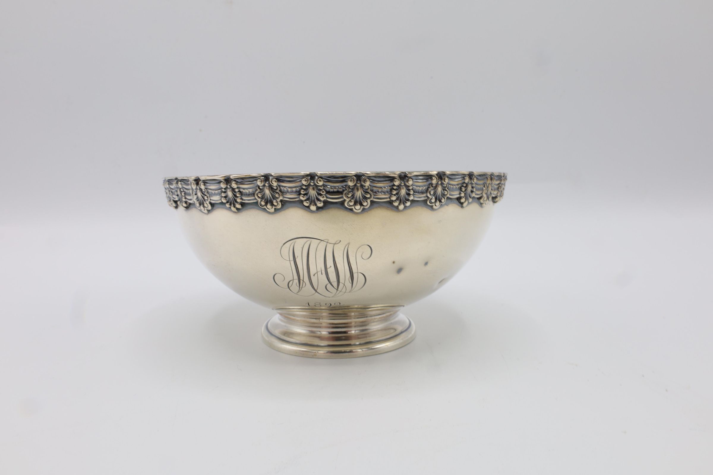 This small footed bowl has a decorated rim and is engraved with the initials MAW for Mary Appleton Wood. On the bottom it is inscribed Tiffany and Co sterling. 8374T3927. 3 gill. The T indicates that it was created under the leadership of Charles L. Tiffany from 1892-1902. A gill is a unit of liquid measurement equivalent to 4 ounces.Context