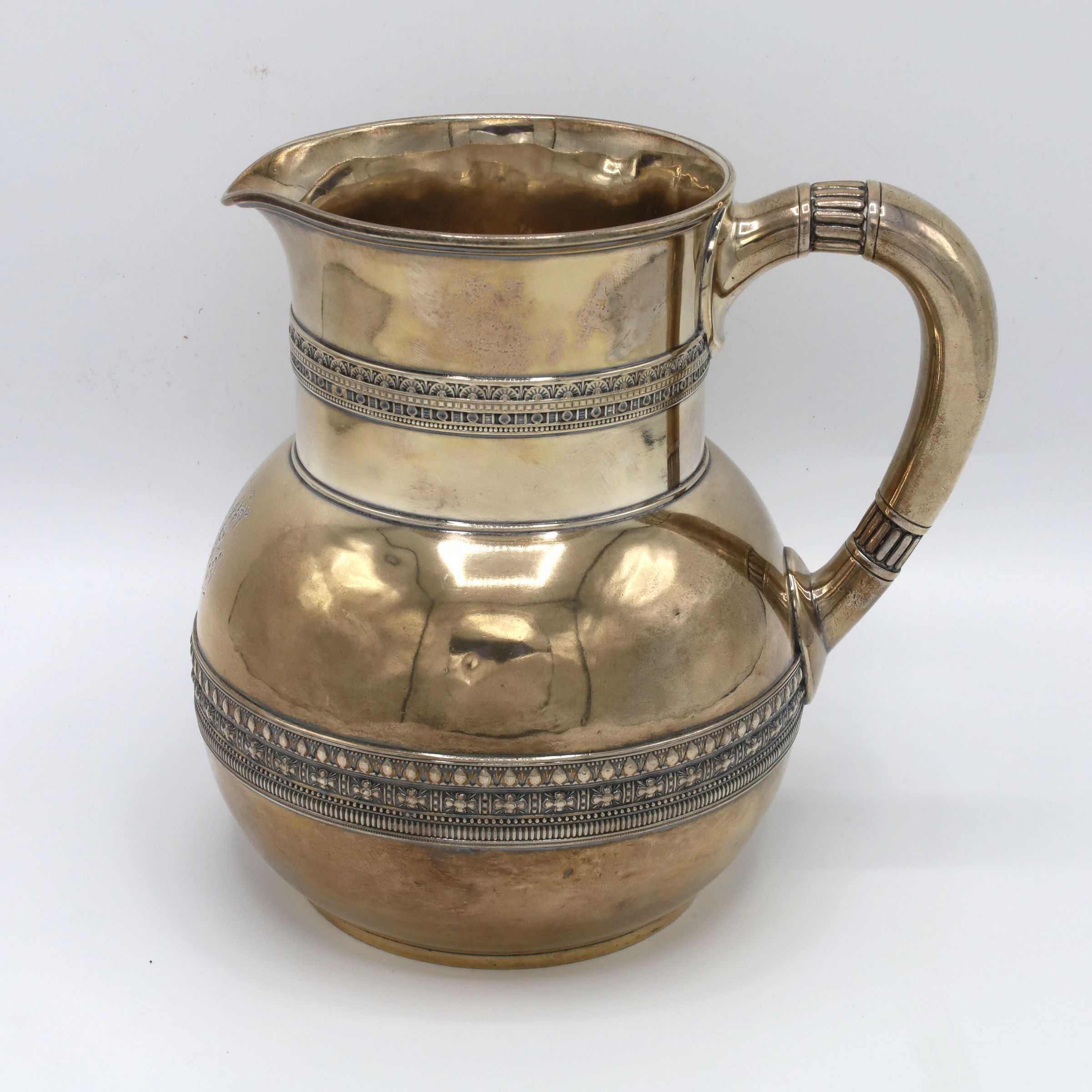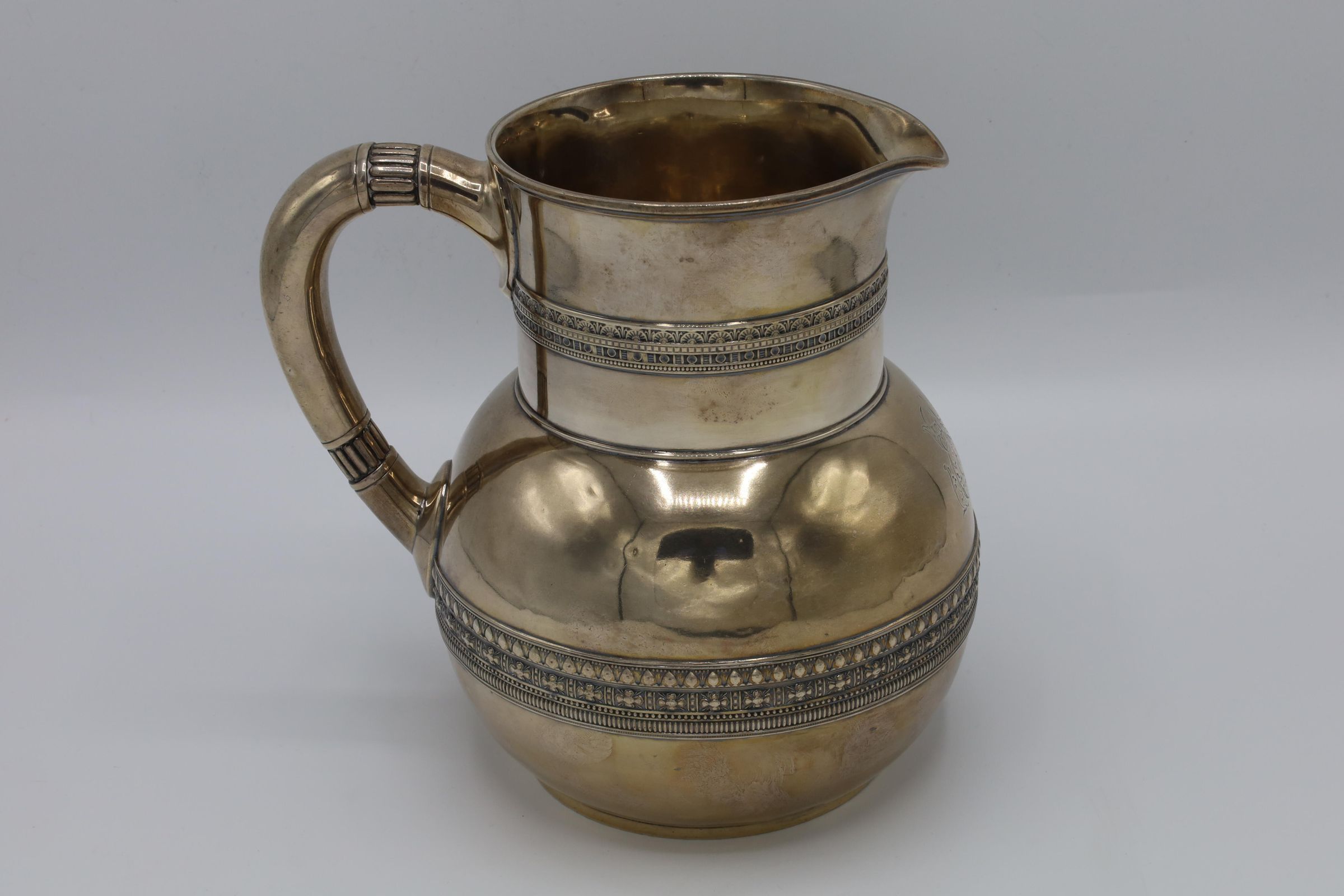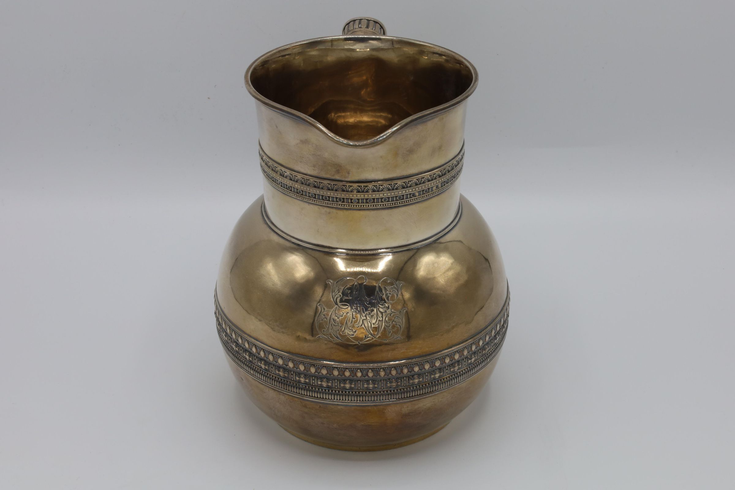 This is a sterling silver Tiffany & Co. water pitcher with a bulbous form, cylindrical neck, and a D-shape handle with applied bands of scroll decoration at the neck and belly. There is an illegible monogram on the pitcher.Context