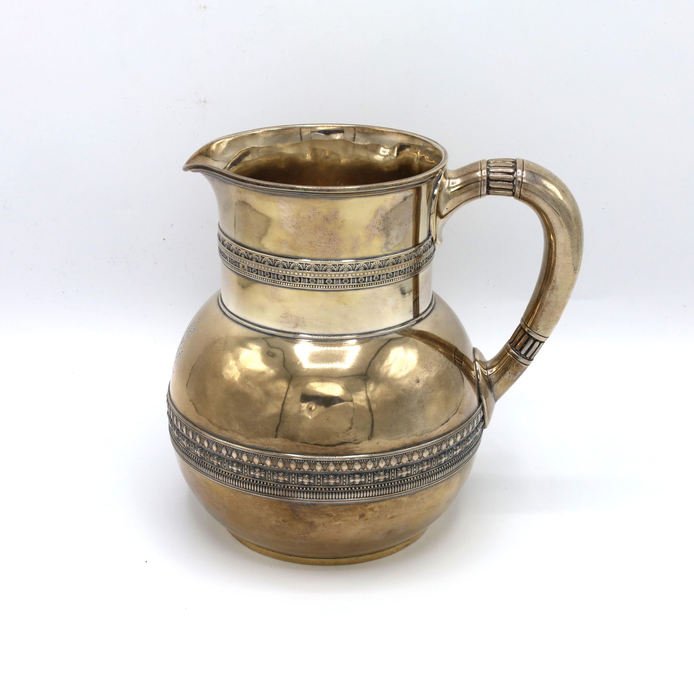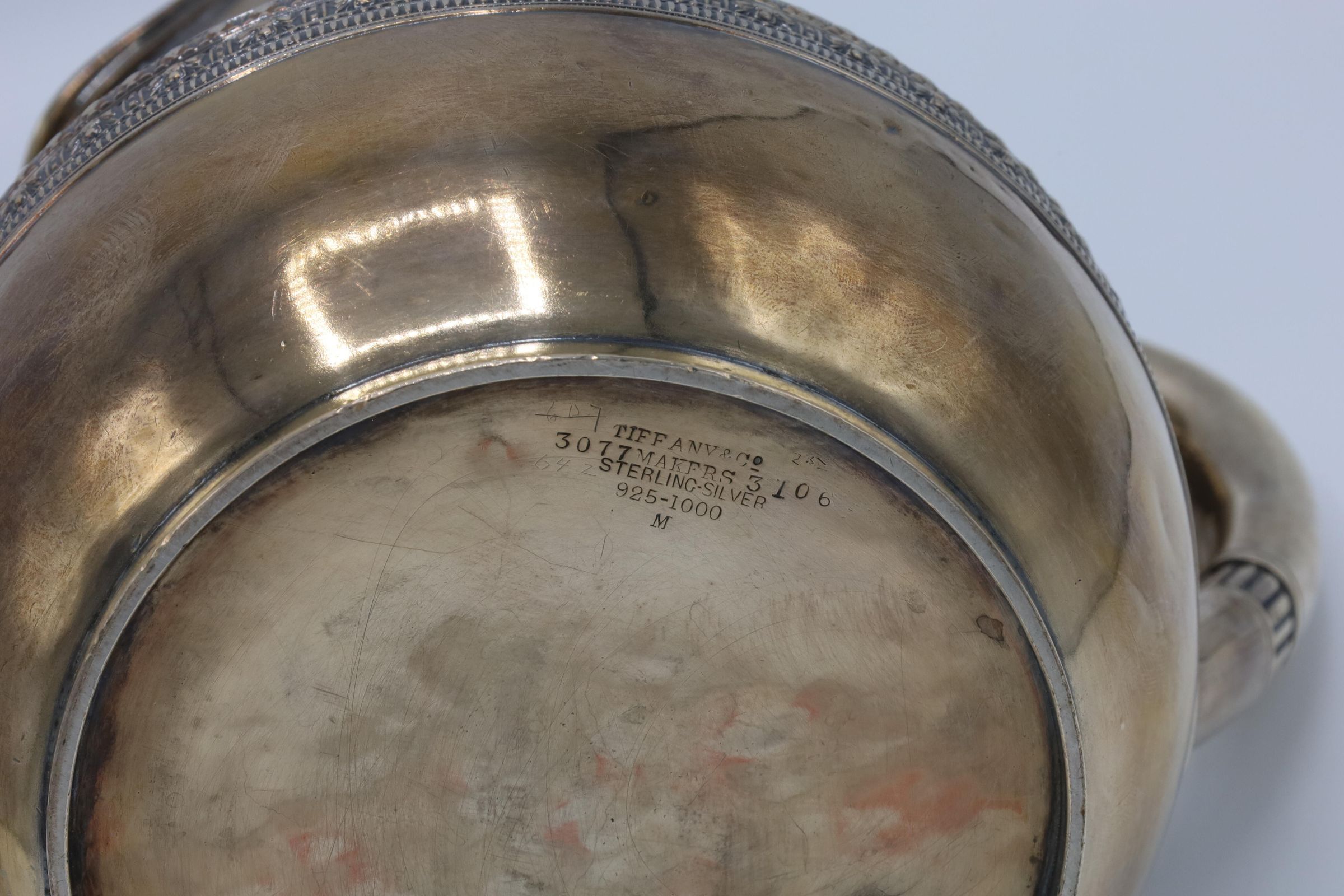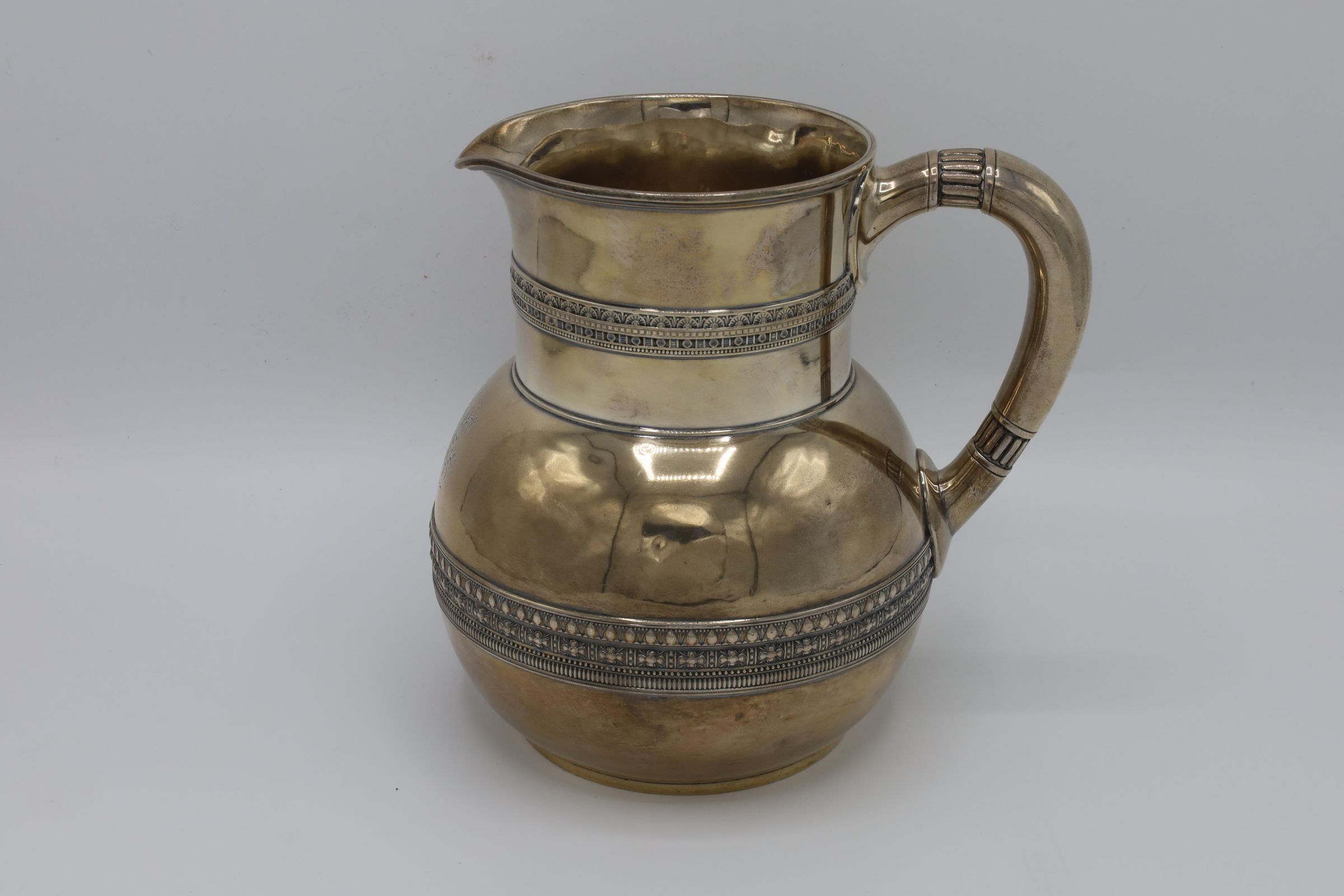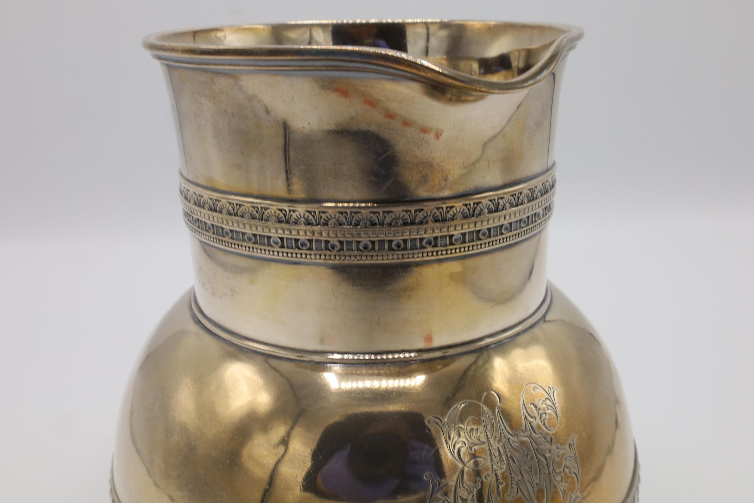 This is a sterling silver Tiffany & Co. water pitcher with a bulbous form, cylindrical neck, and a D-shape handle with applied bands of scroll decoration at the neck and belly. There is an illegible monogram on the pitcher.Context