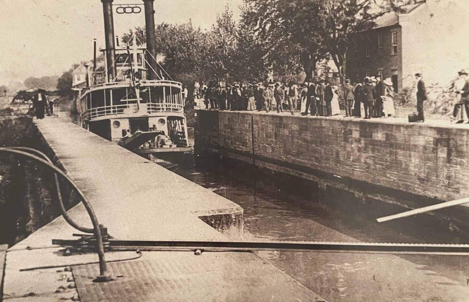 A sternwheeler enters a lock on the Muskingum River. People line up atop the lock ready to get onboard.