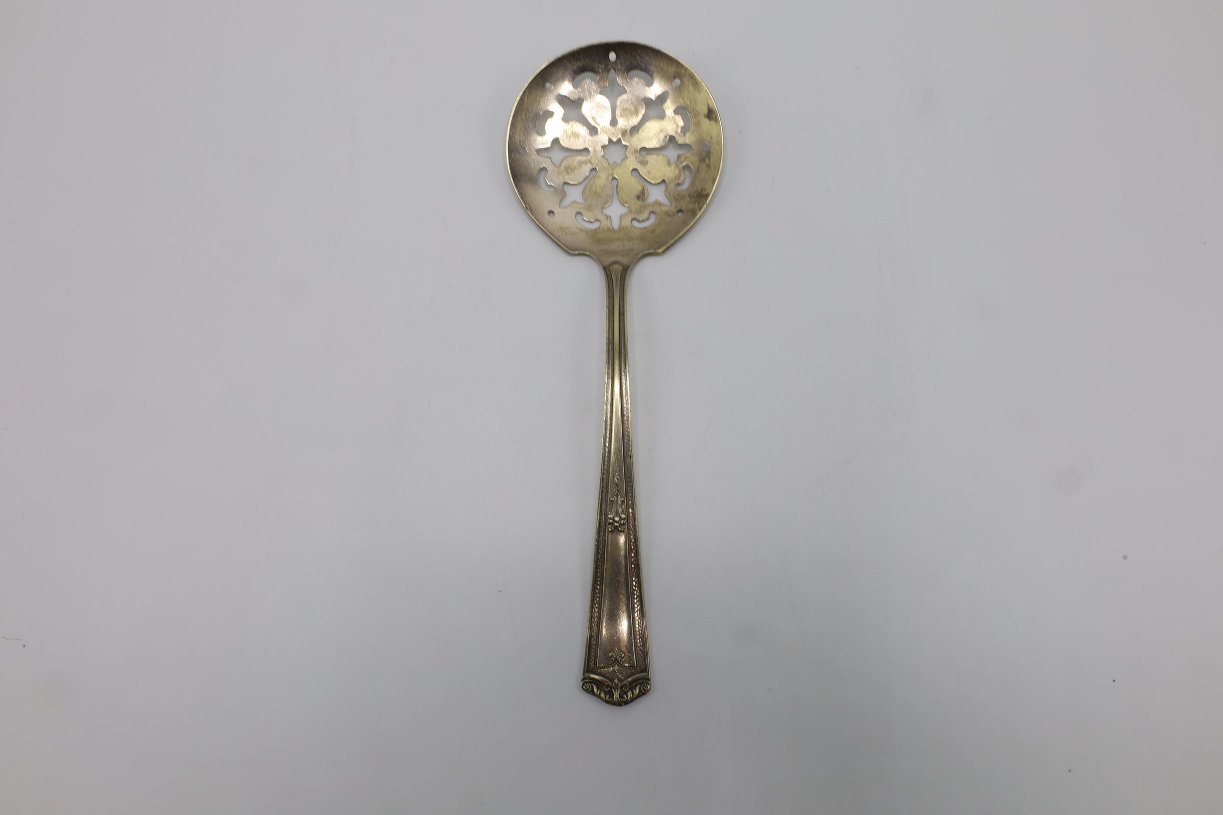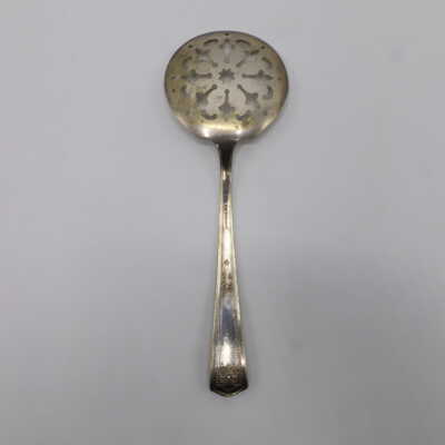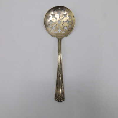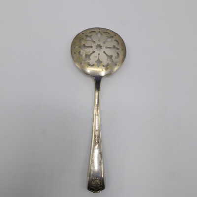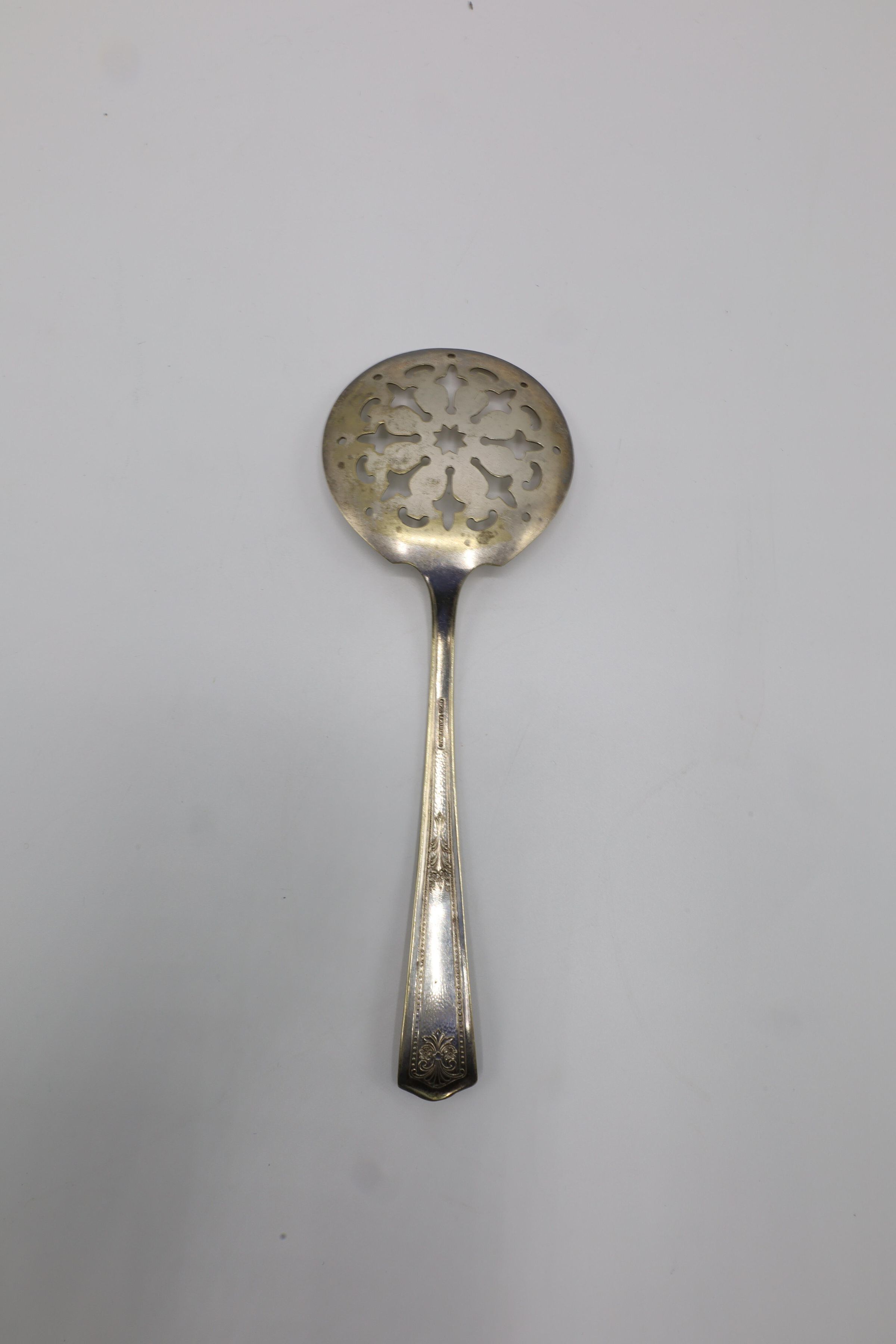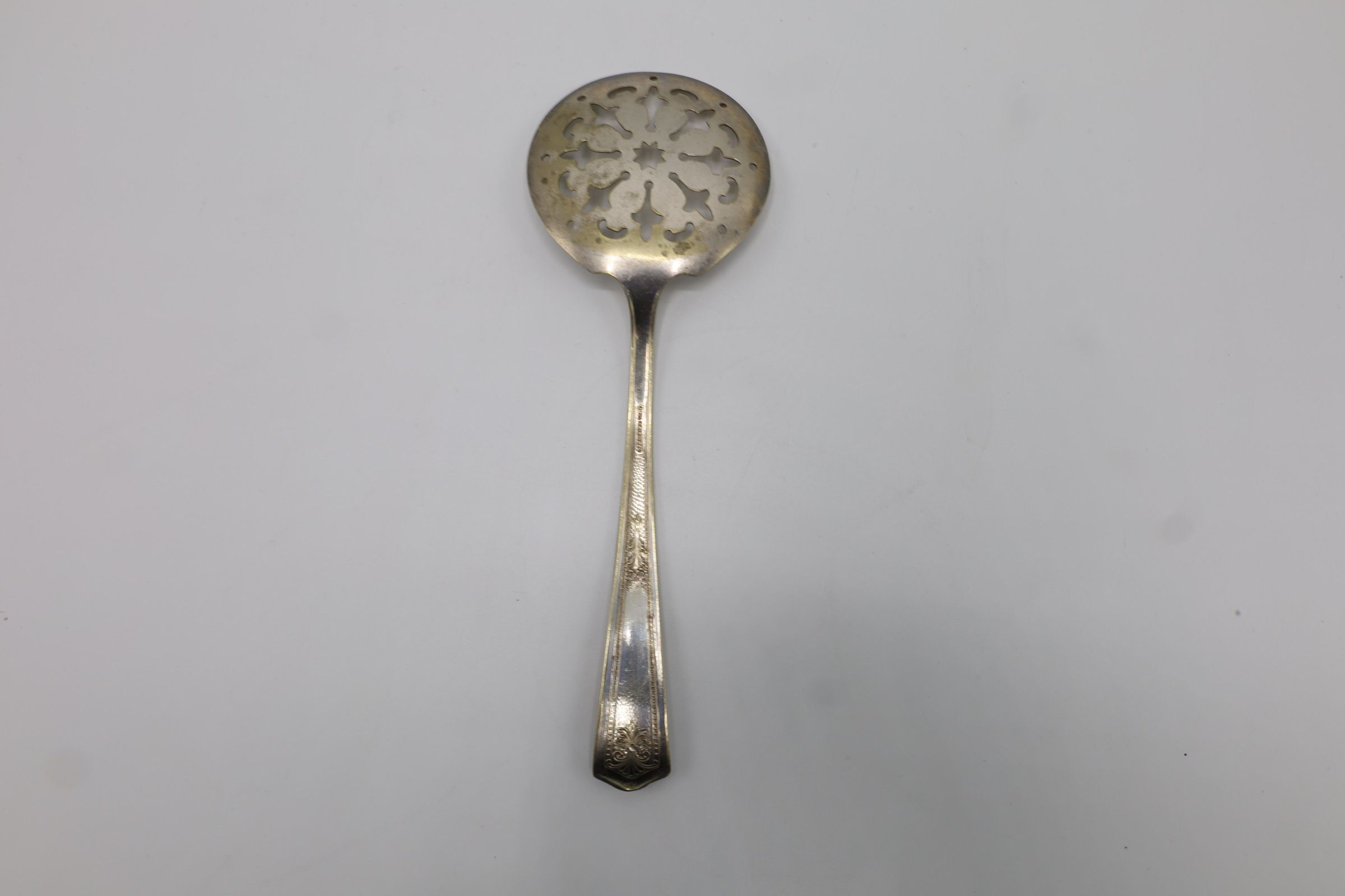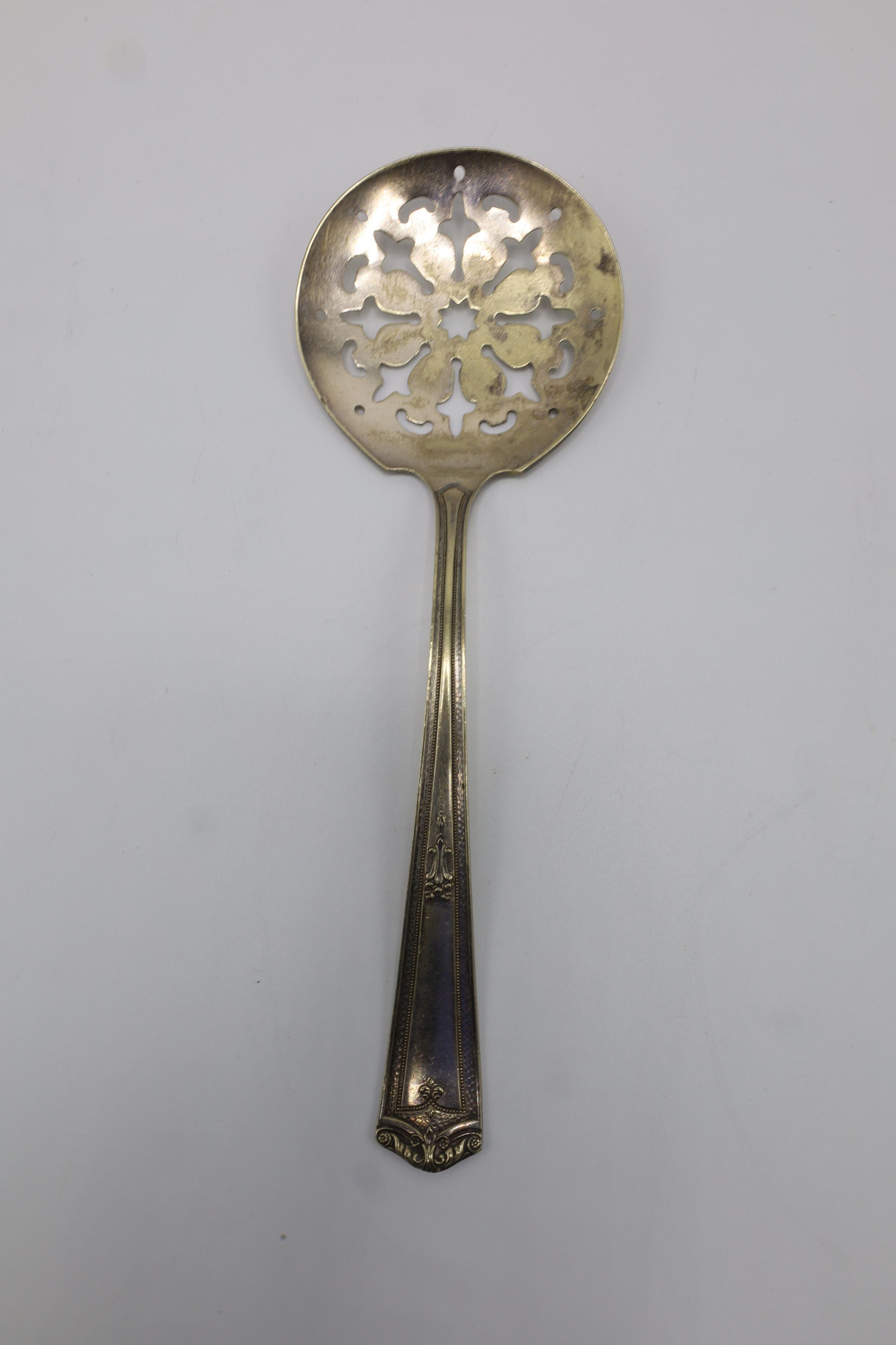 Silvertone perforated serving spoon, fleur de lys handle Fairfield inscription