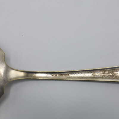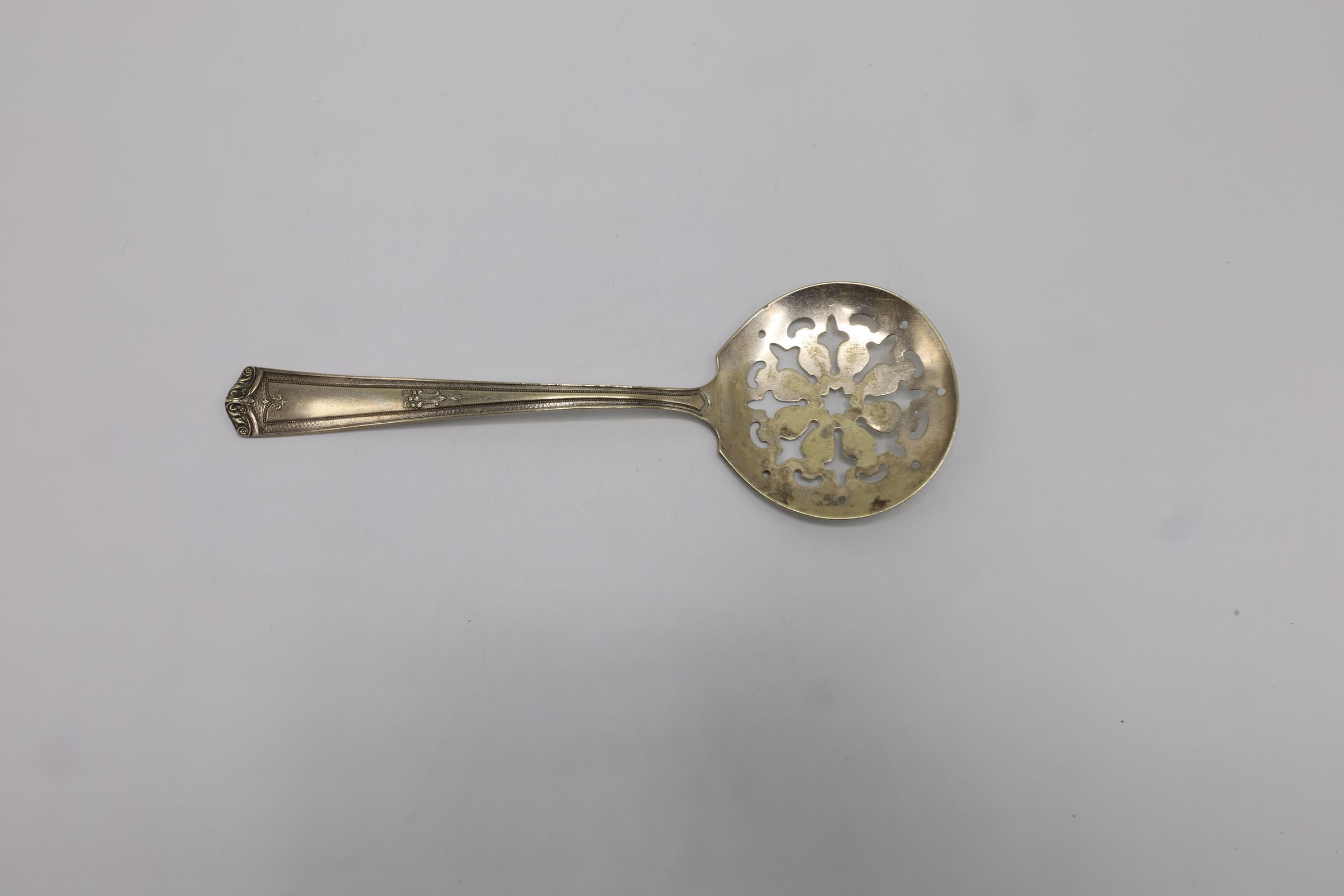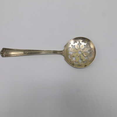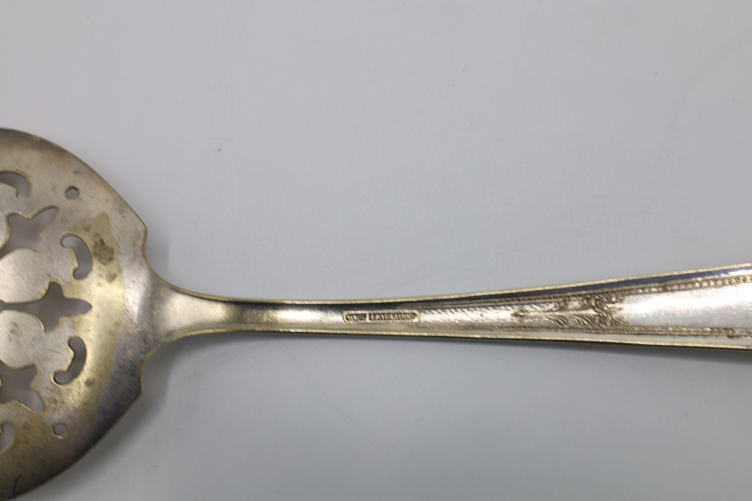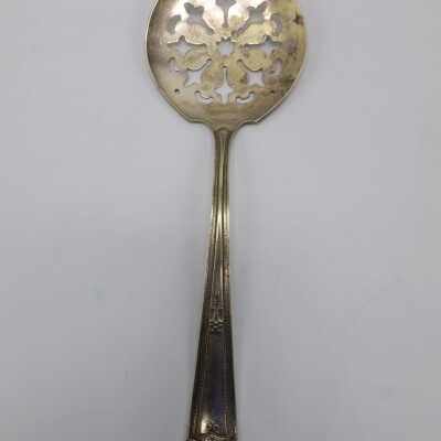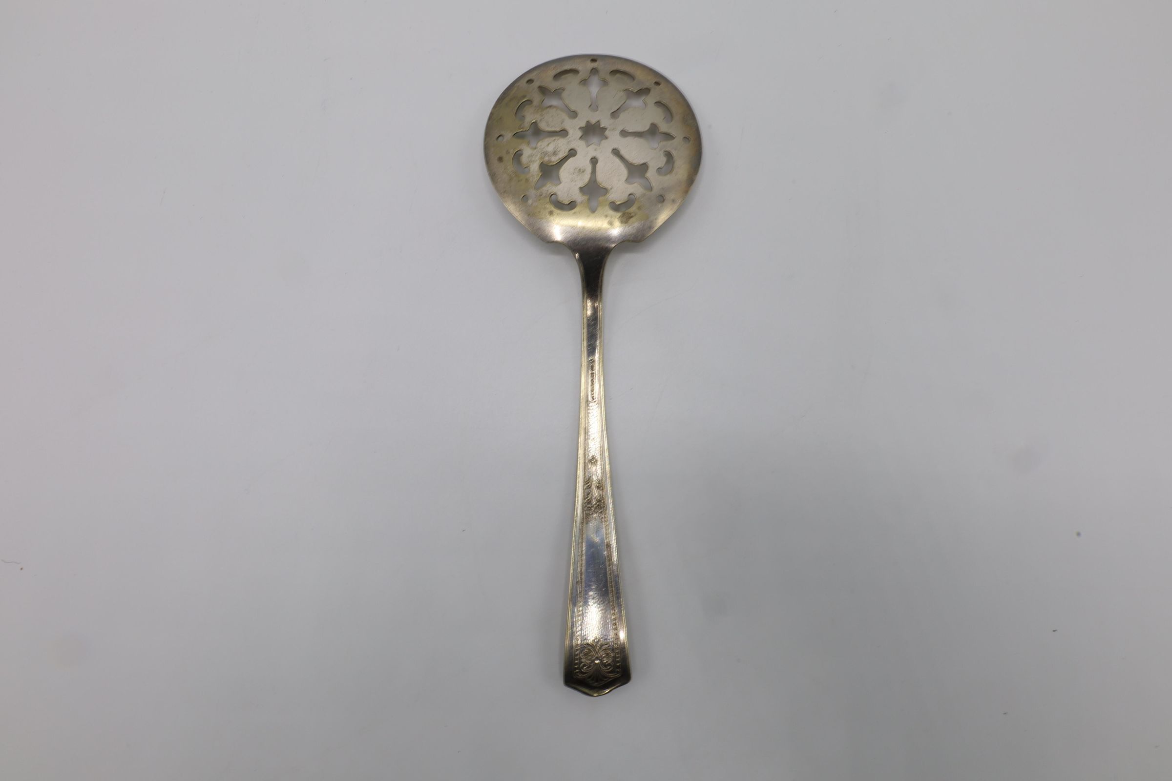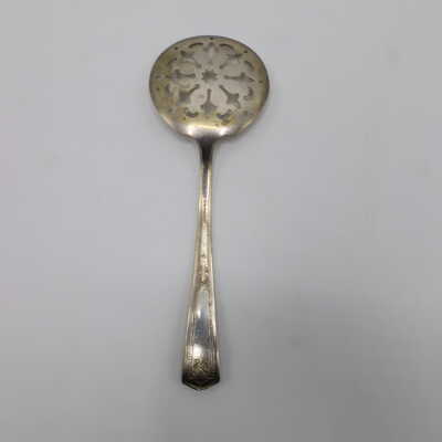 Silvertone perforated serving spoon, fleur de lys handle Fairfield inscription