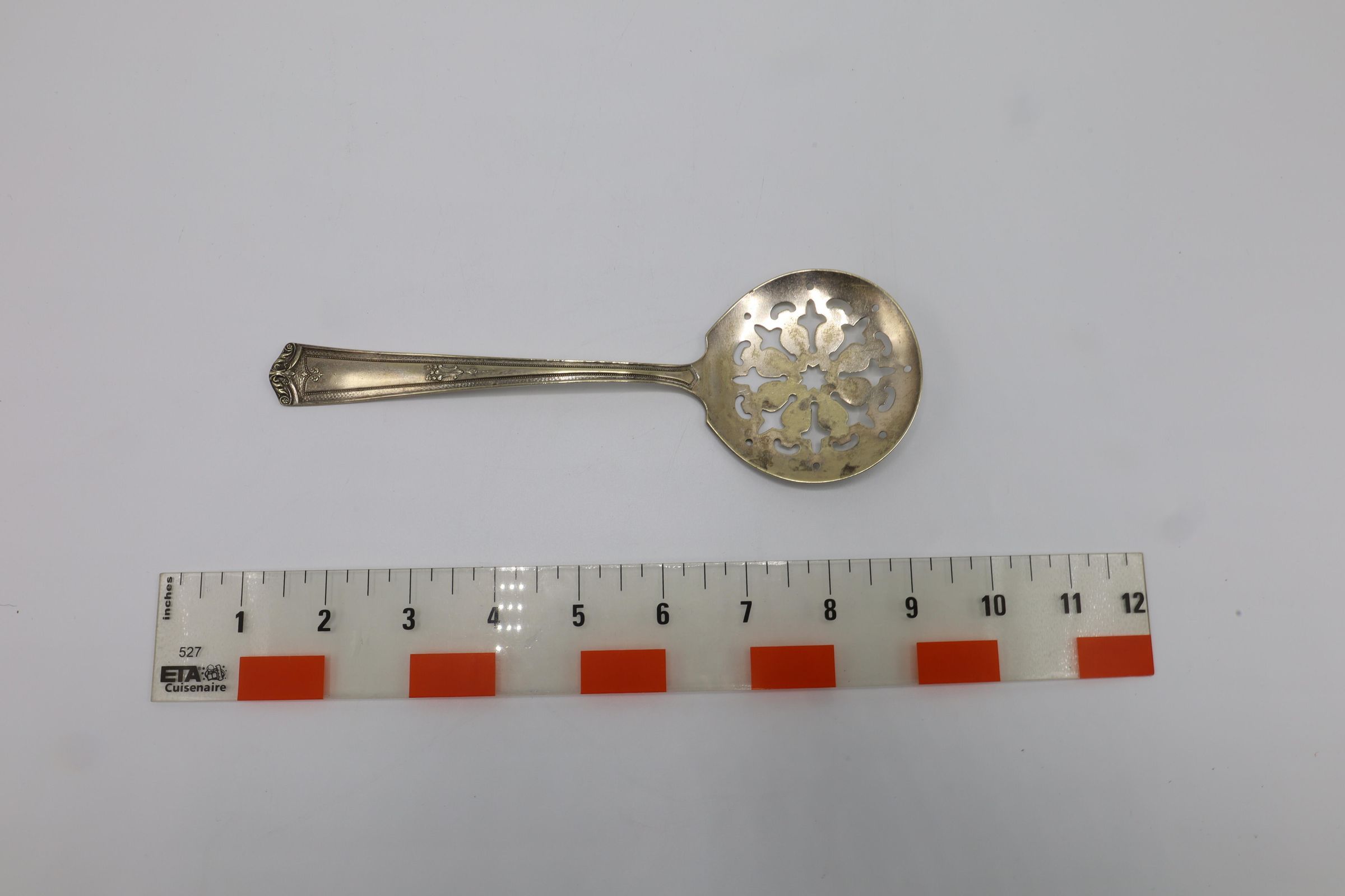 Silver plate tomato server. It has a simple floral pattern on the squared handle and a decorative cut out pattern in the bowl of the server. The pattern continues to the back of the handle, which is marked "Fairfield."Location