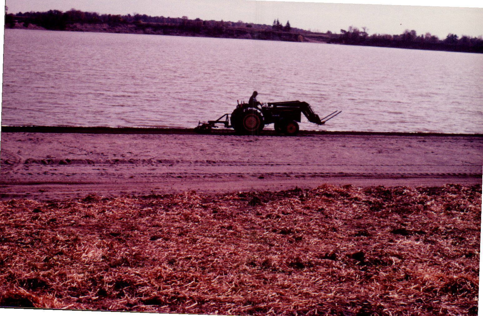 A park employee at Delaware State Park drives the park's tractor along the edge of Delaware Lake. The tractor's rear attachment is engaged and is perhaps grooming the sand on what might be a beach area.Cataloged By
