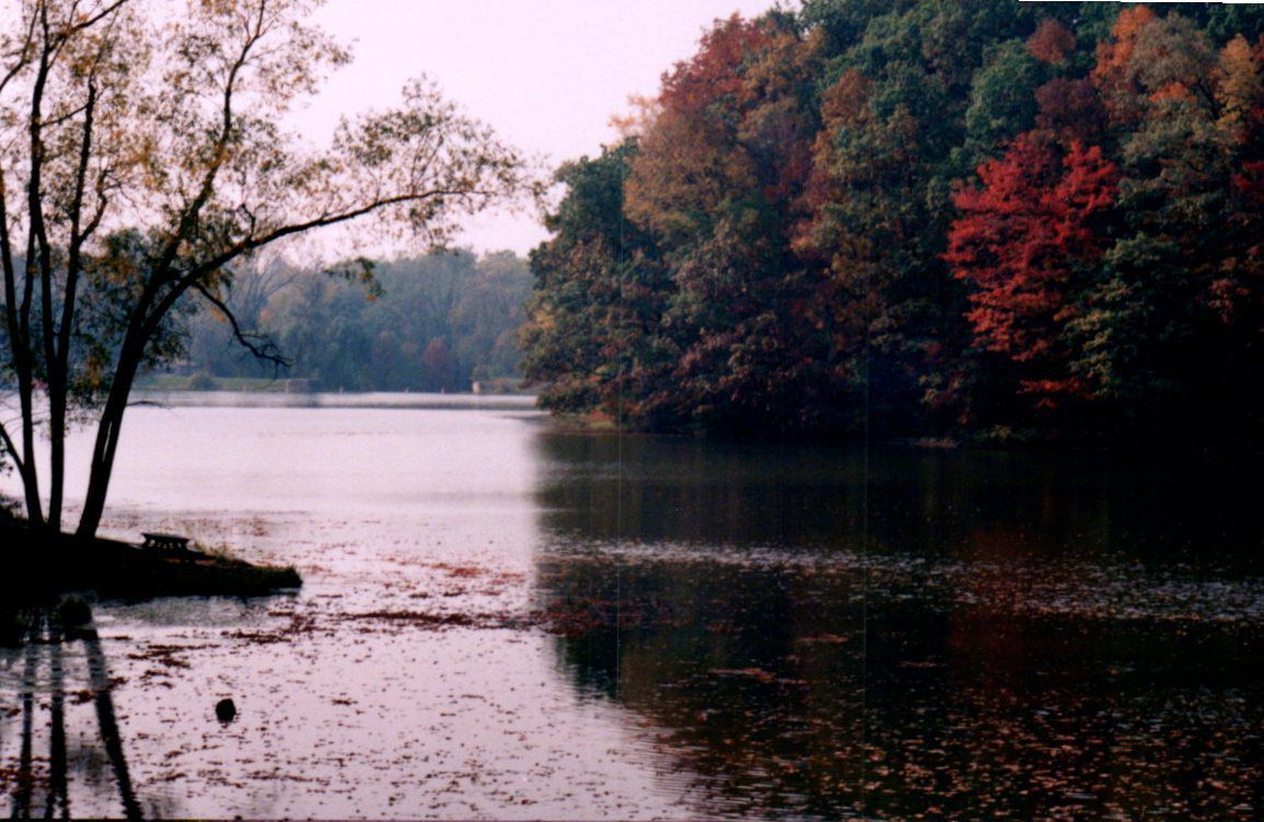 A photograph of fall color along the lake at Mt. Gilead State Park. A lone picnic table sits unused on the photograph's right. The top of the dam can be seen in the photograph's background.Cataloged By