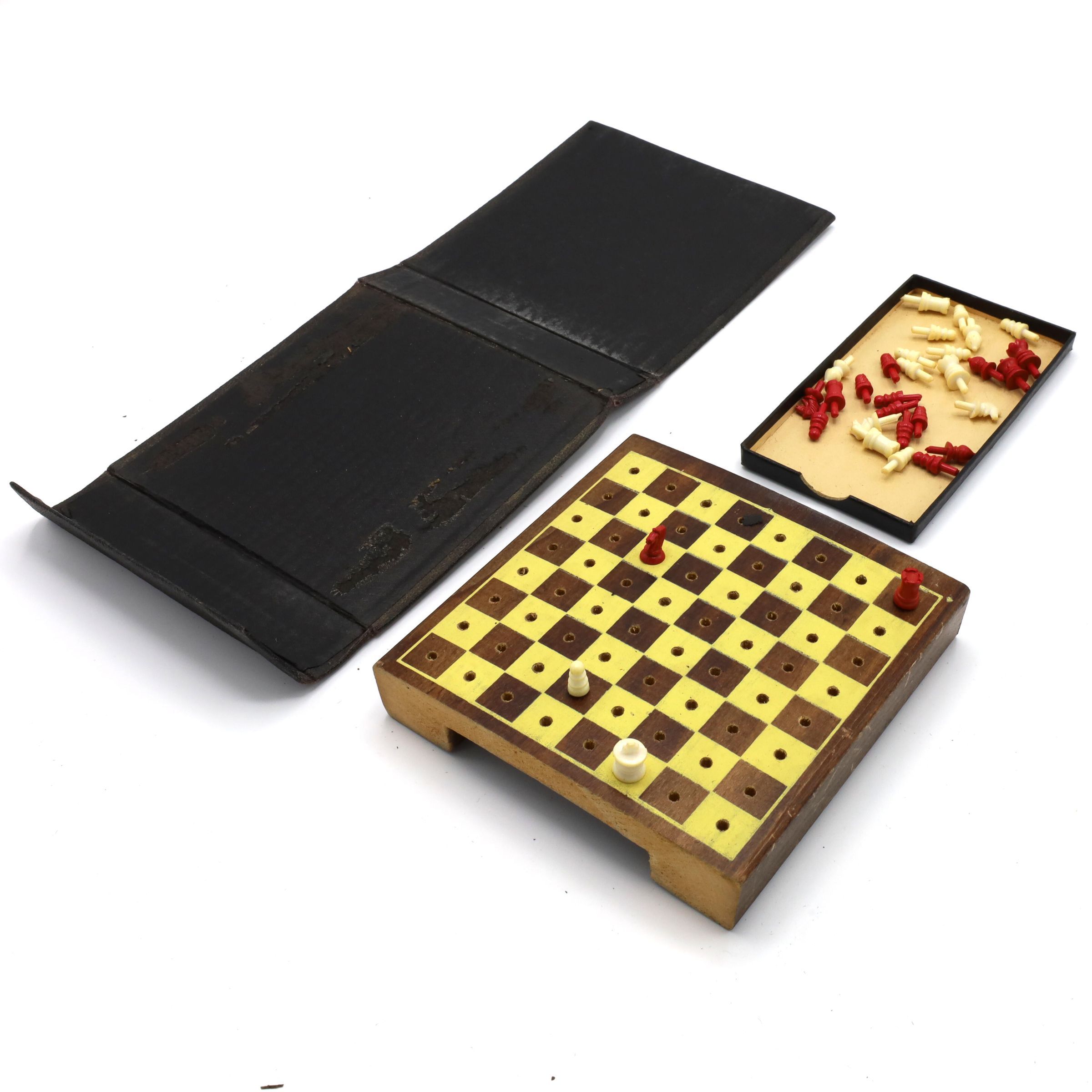Travel chess set with black leather cover. The top of the chessboard has alternating dark- and light-colored wood squares with holes in the center to securely hold the pieces while the chess set was in motion. A drawer under the chessboard opens to reveal small plastic chess piece pegs in red and white.