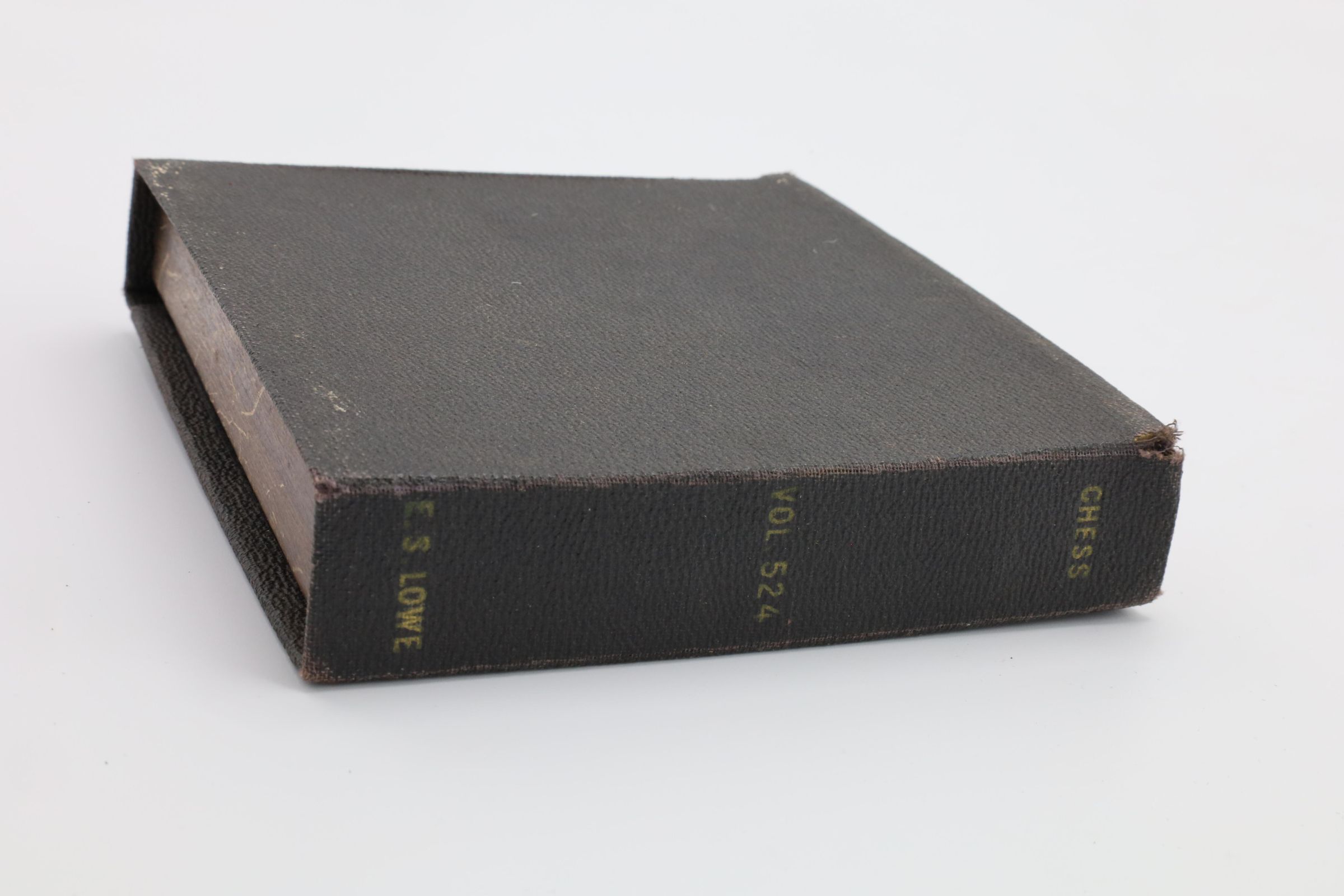 The leather cover is constructed to look like the cover of a book, with the inscription on the 'spine' reading: Chess; Vol 524; E.S. Lowe.Location