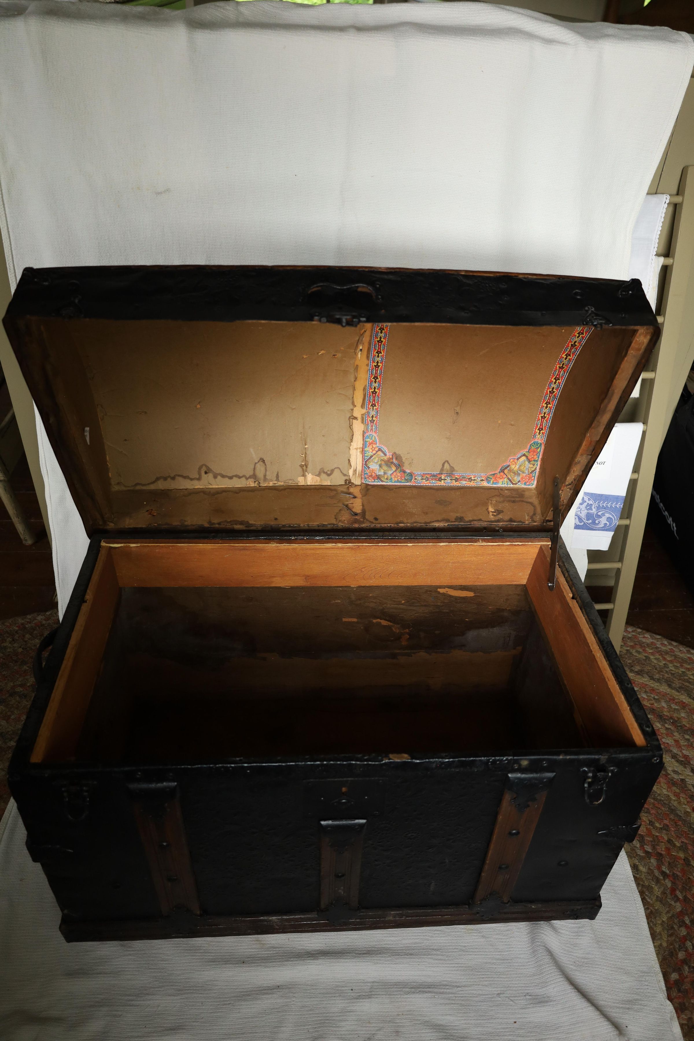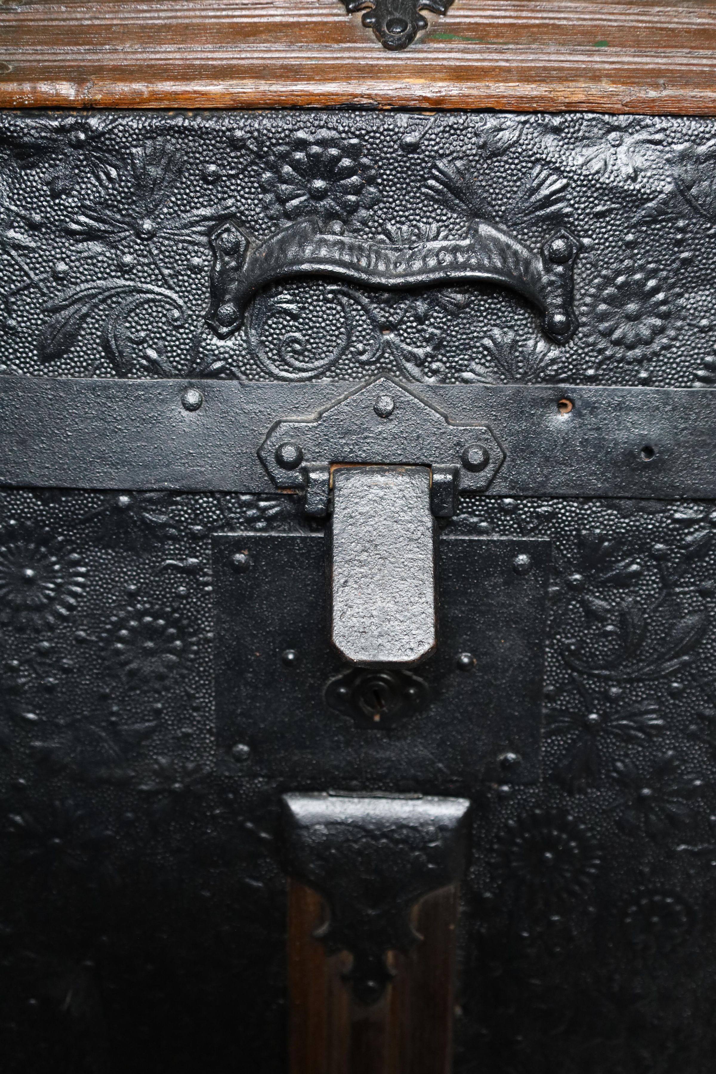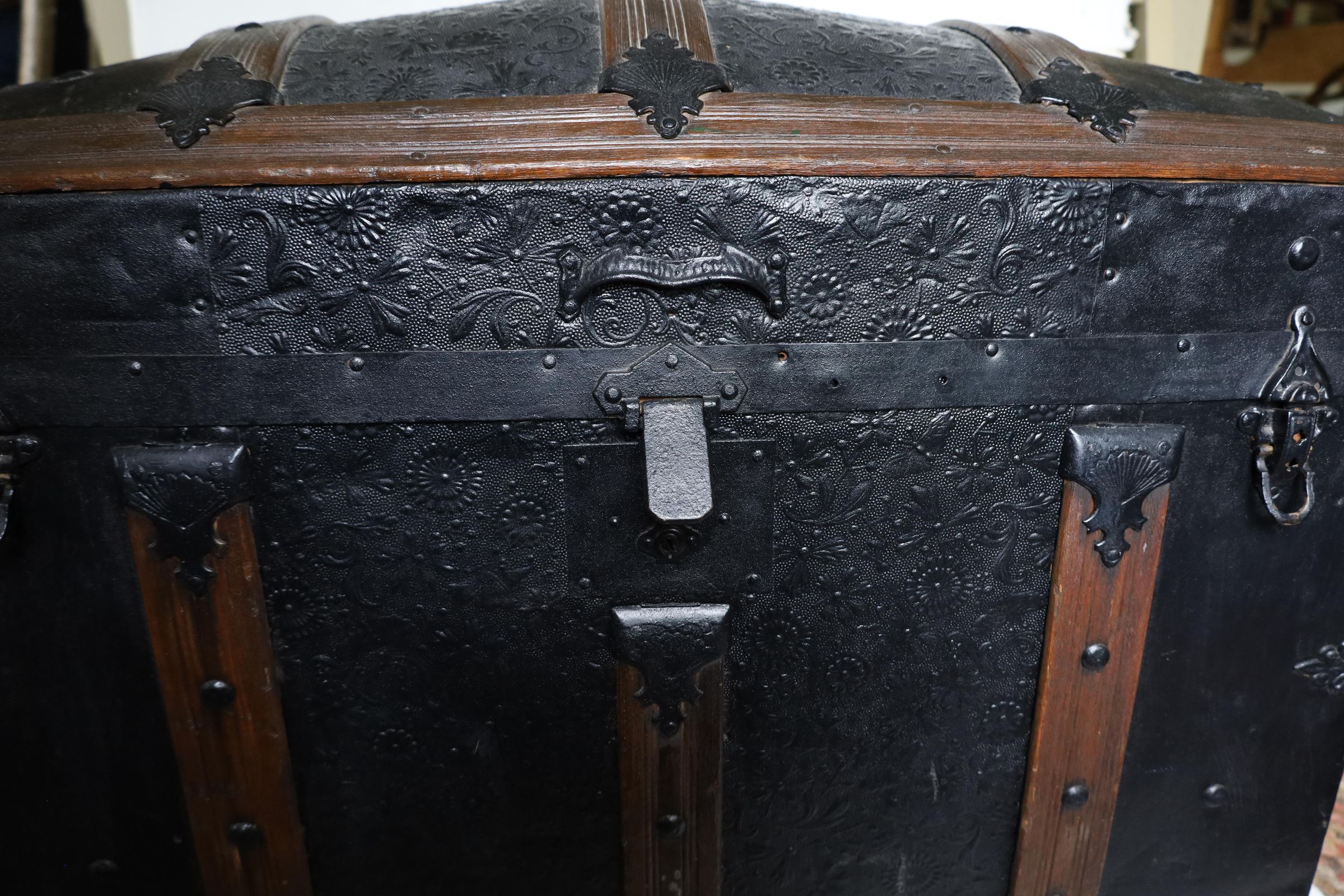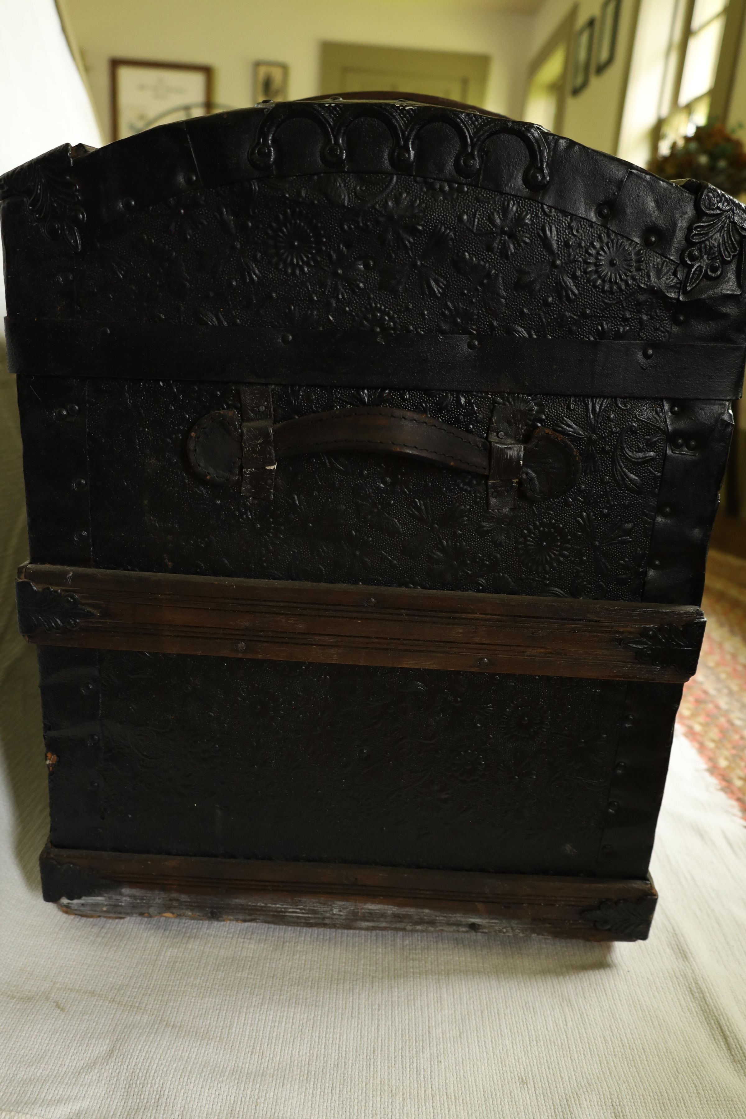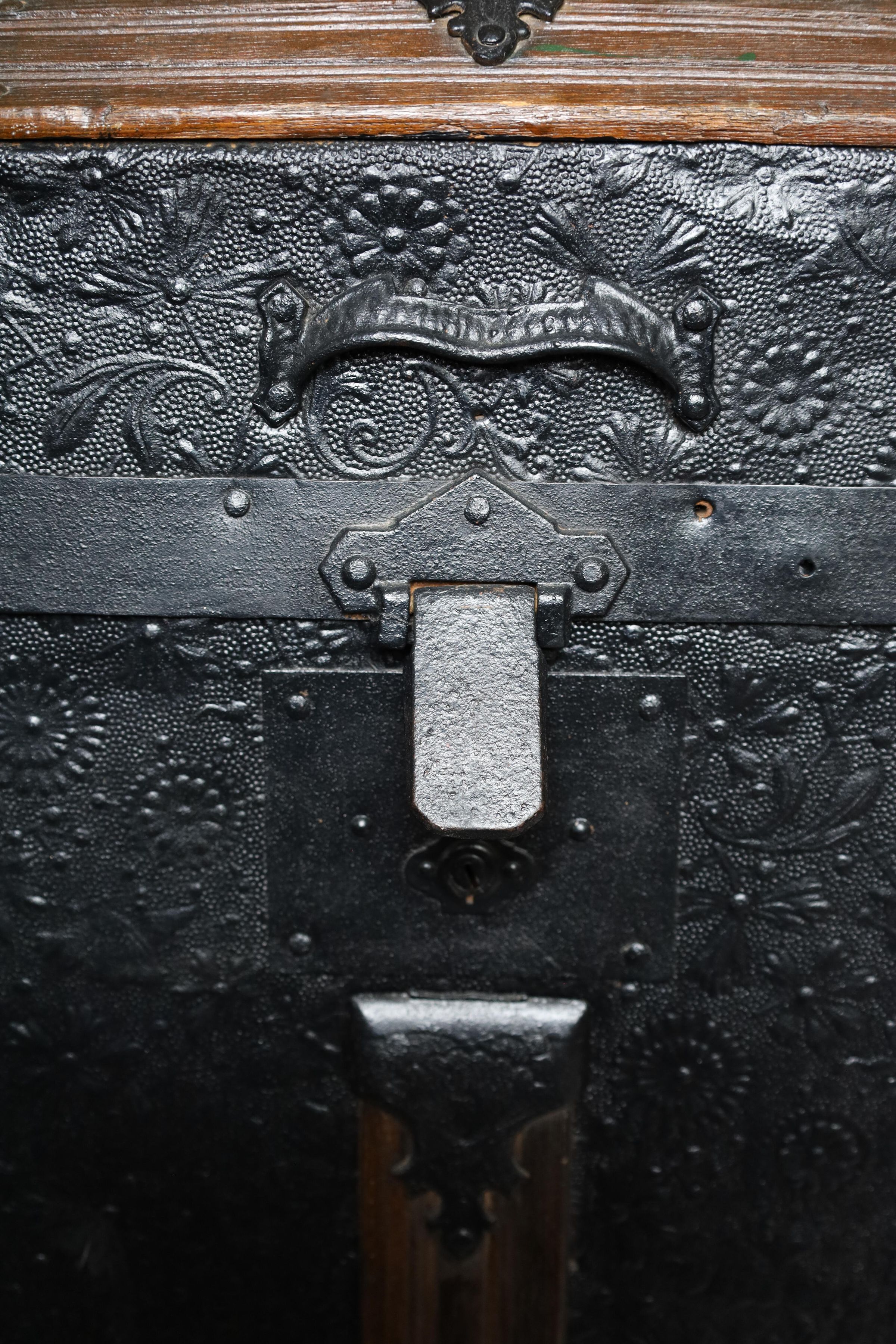 This black metal-covered dome top travel trunk has a floral design etched in the metal and three wooden slats on top and front of the trunk. This trunk could be a late 18th to early 19th century trunk. This type of trunk was used when traveling a long distance by water. A dome-shaped trunk could hold quite a bit of ones possessions.Location