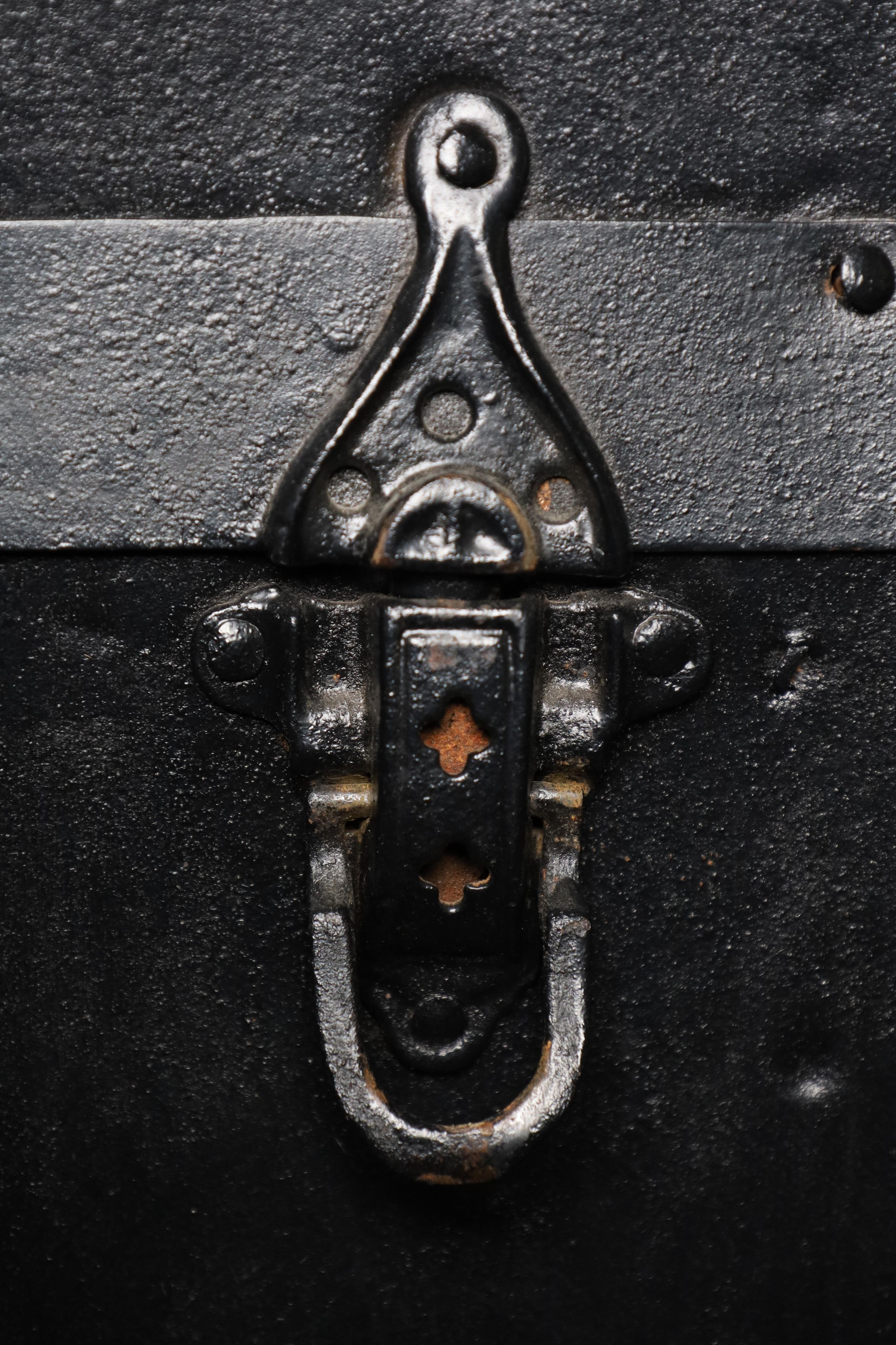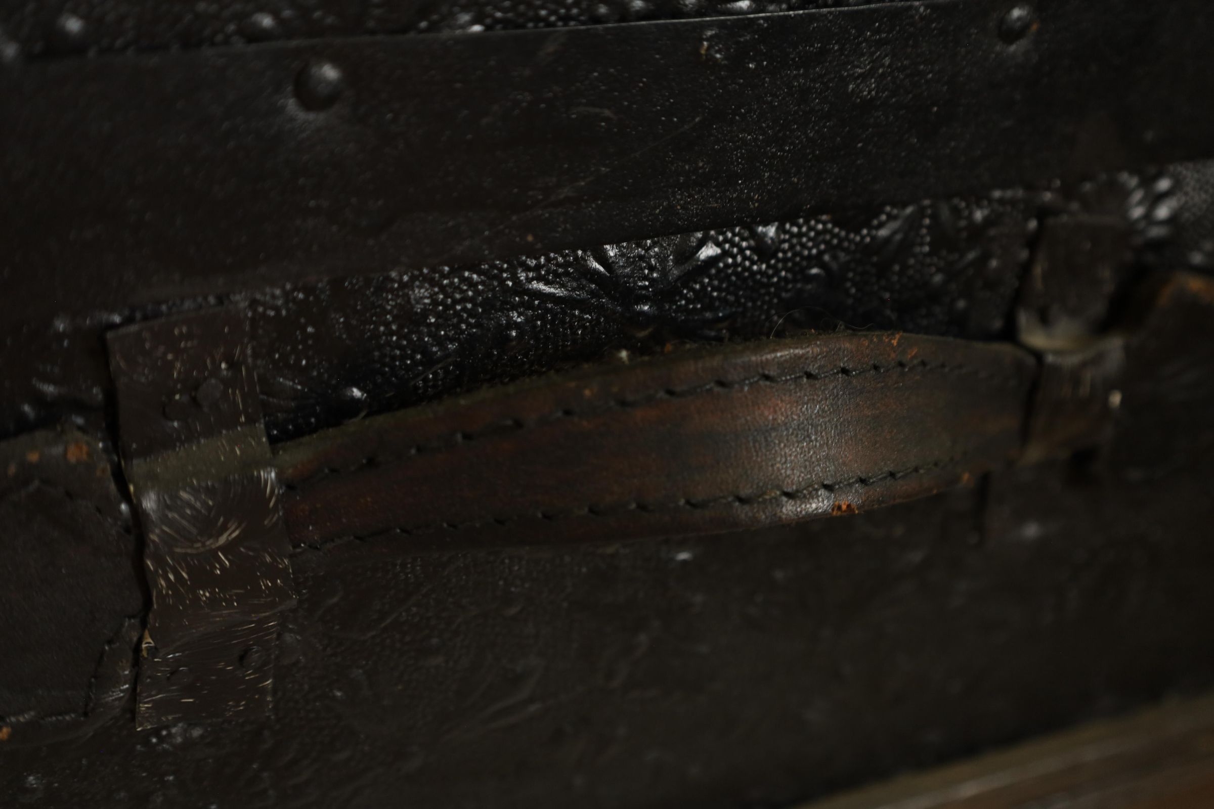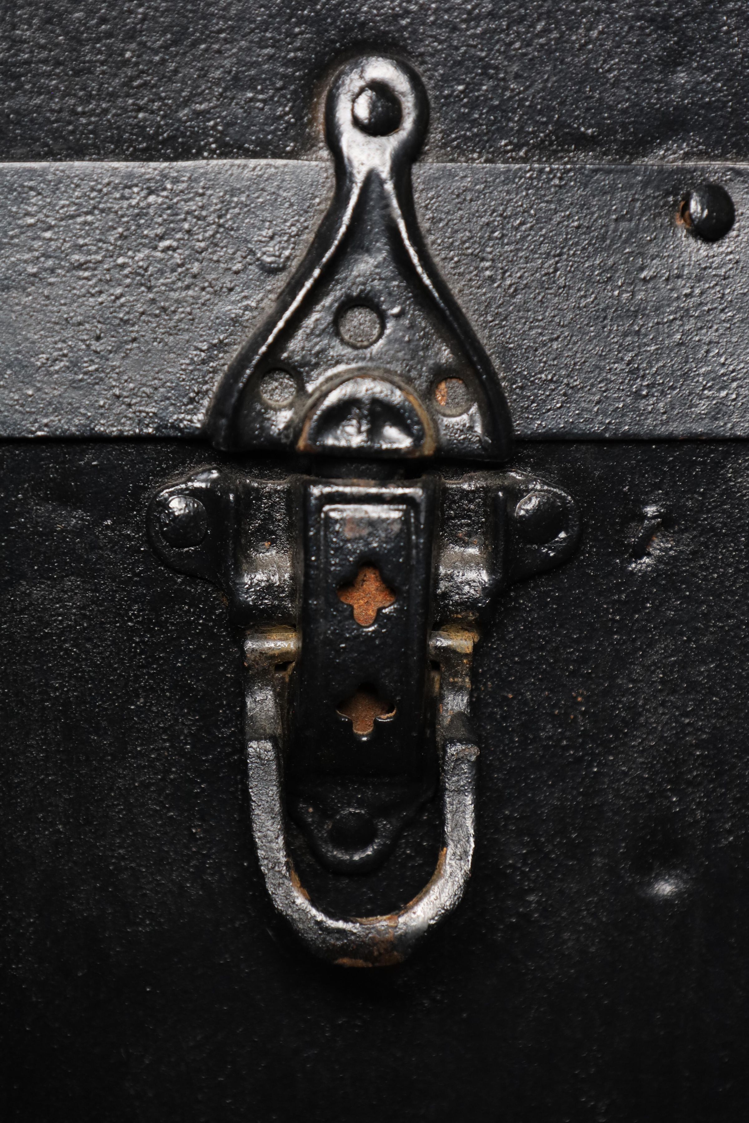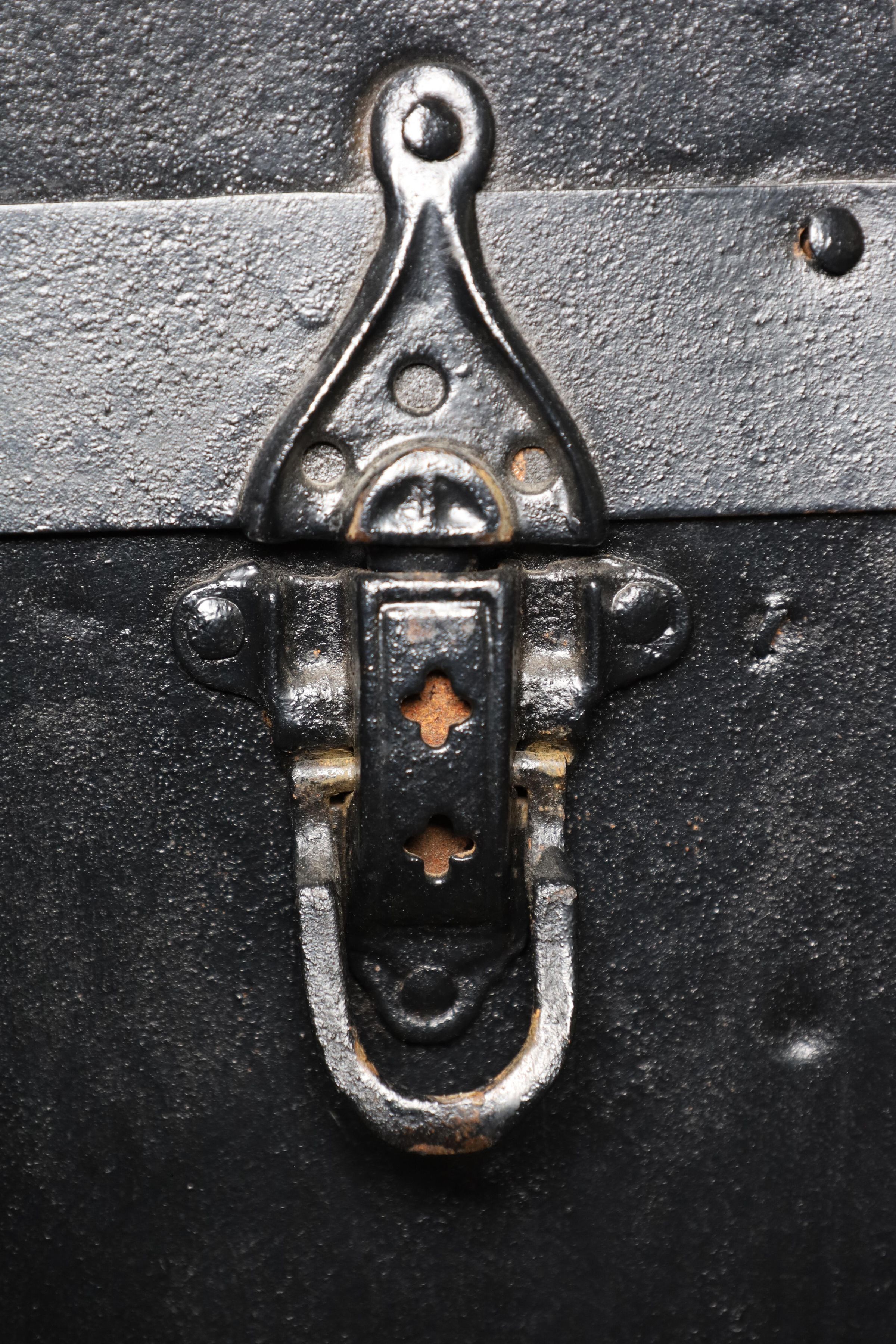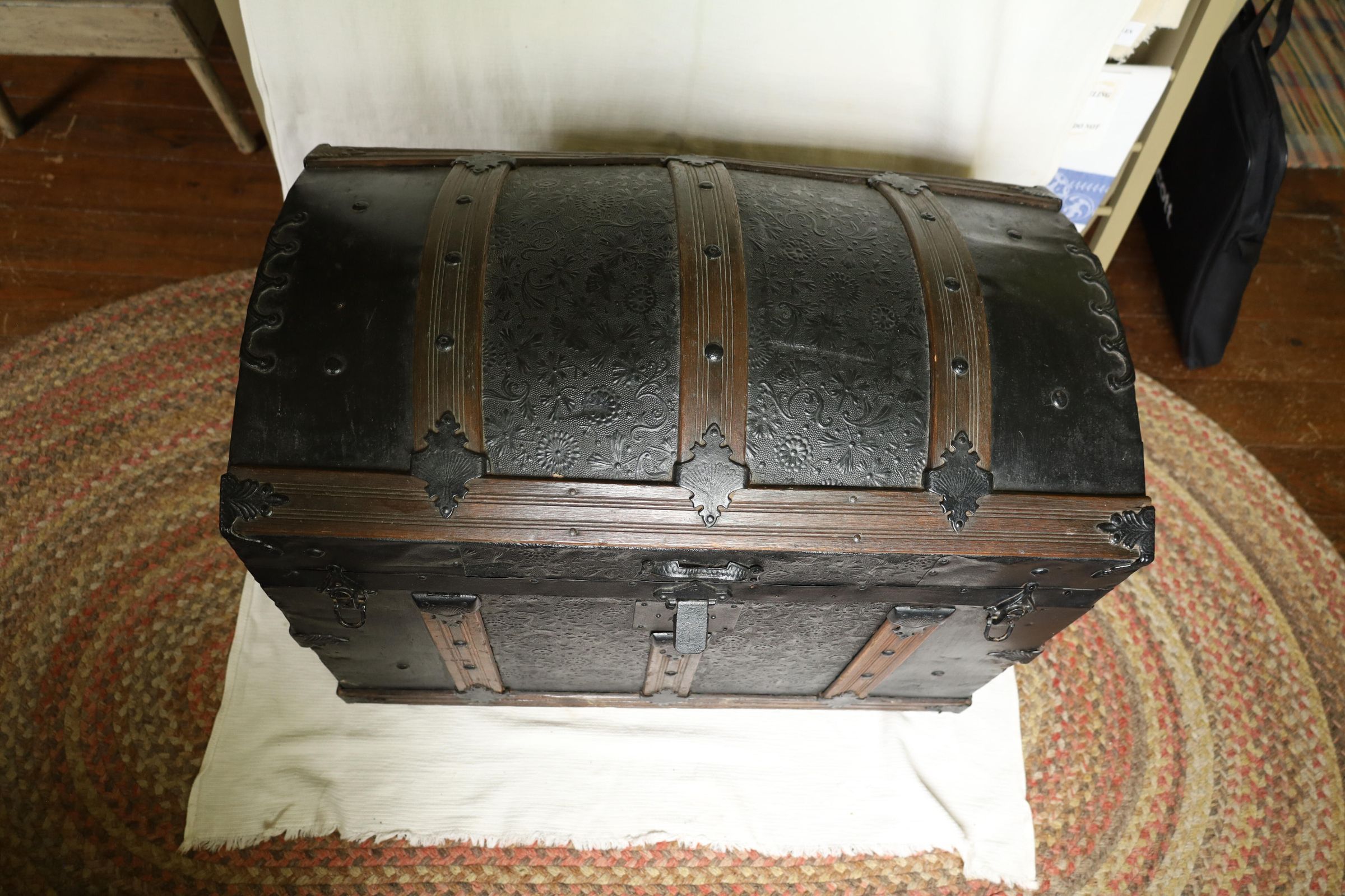 This black metal-covered dome top travel trunk has a floral design etched in the metal and three wooden slats on top and front of the trunk. This trunk could be a late 18th to early 19th century trunk. This type of trunk was used when traveling a long distance by water. A dome-shaped trunk could hold quite a bit of ones possessions.Location