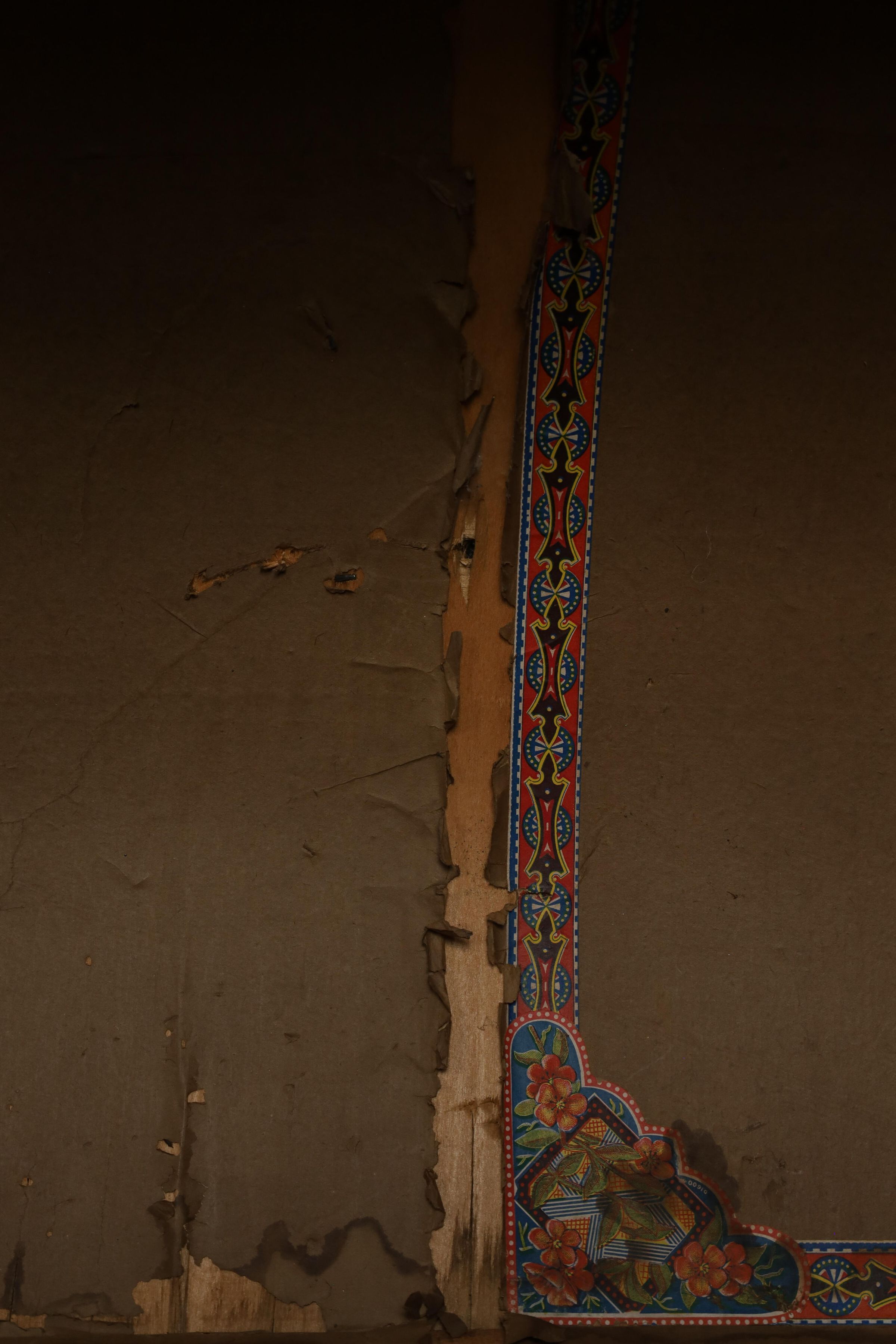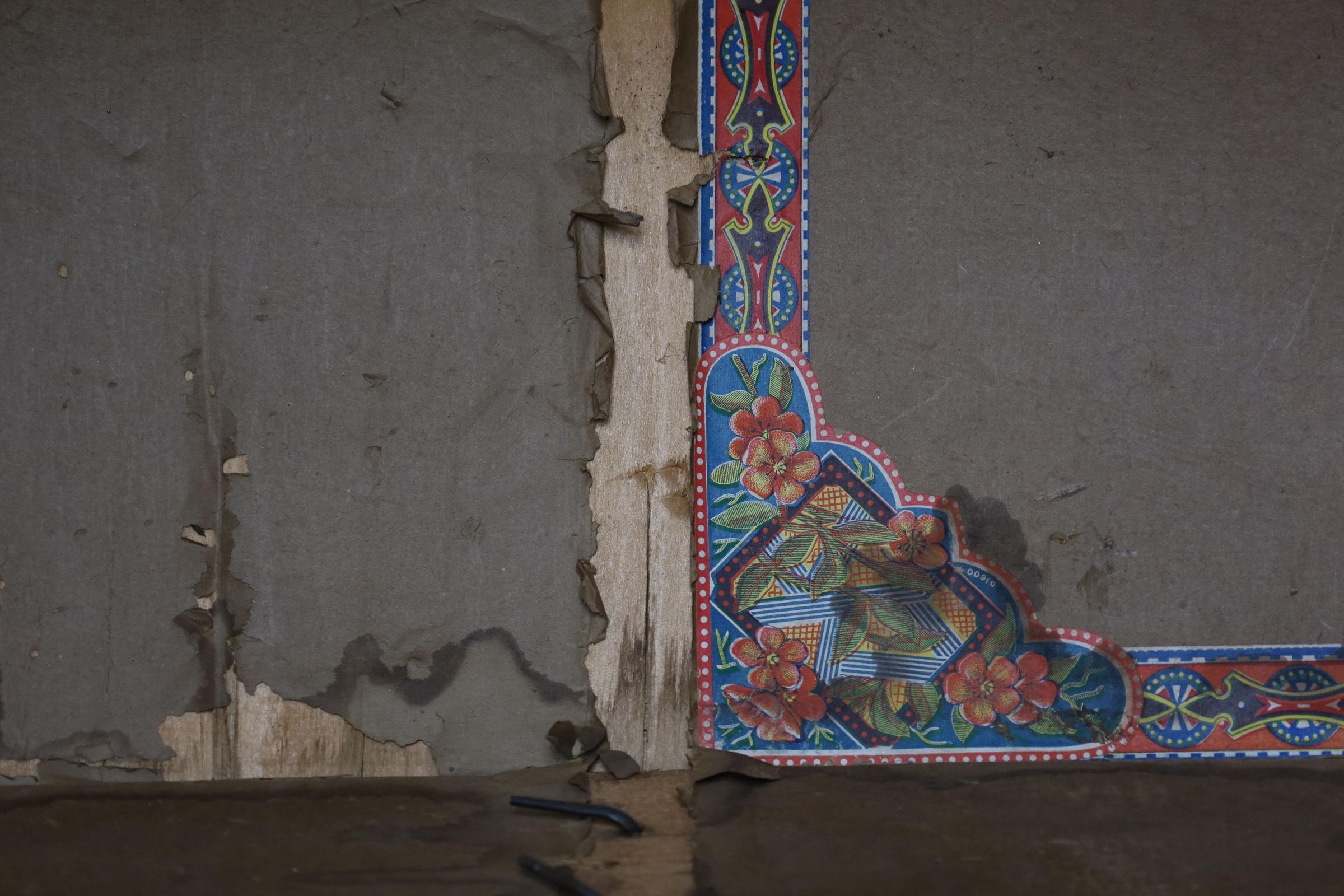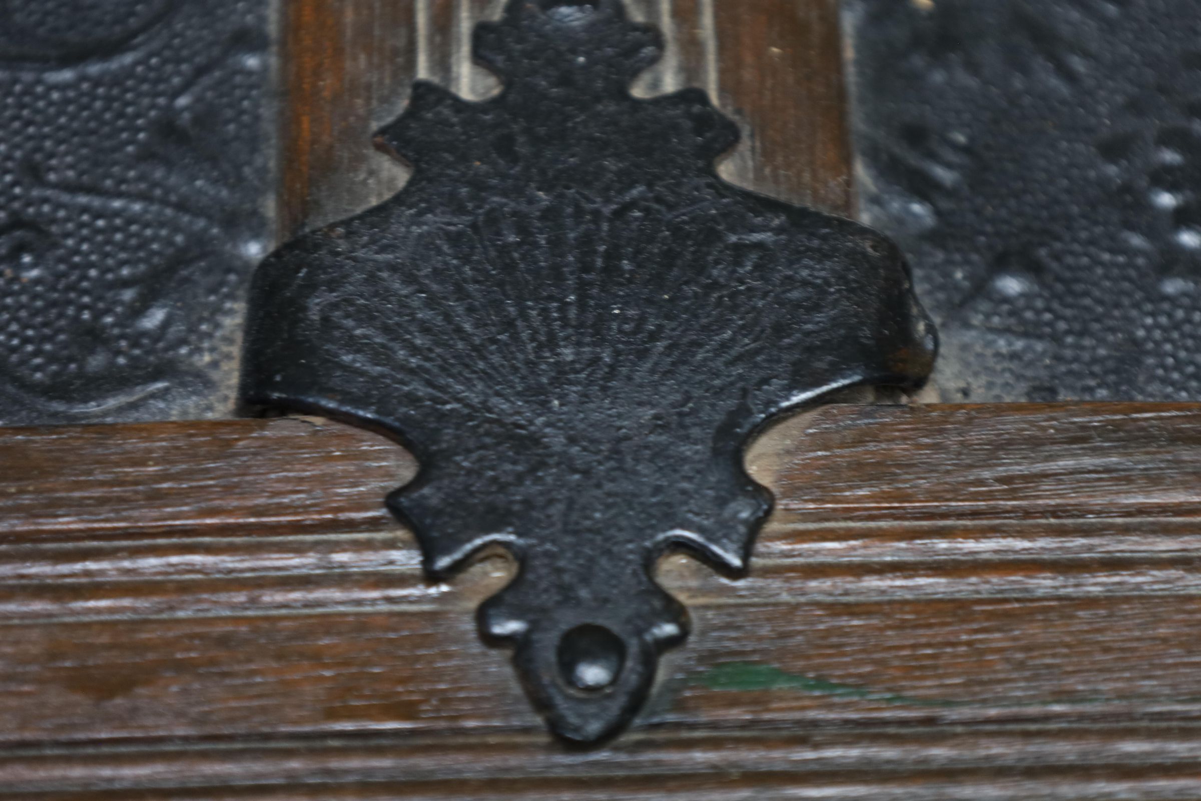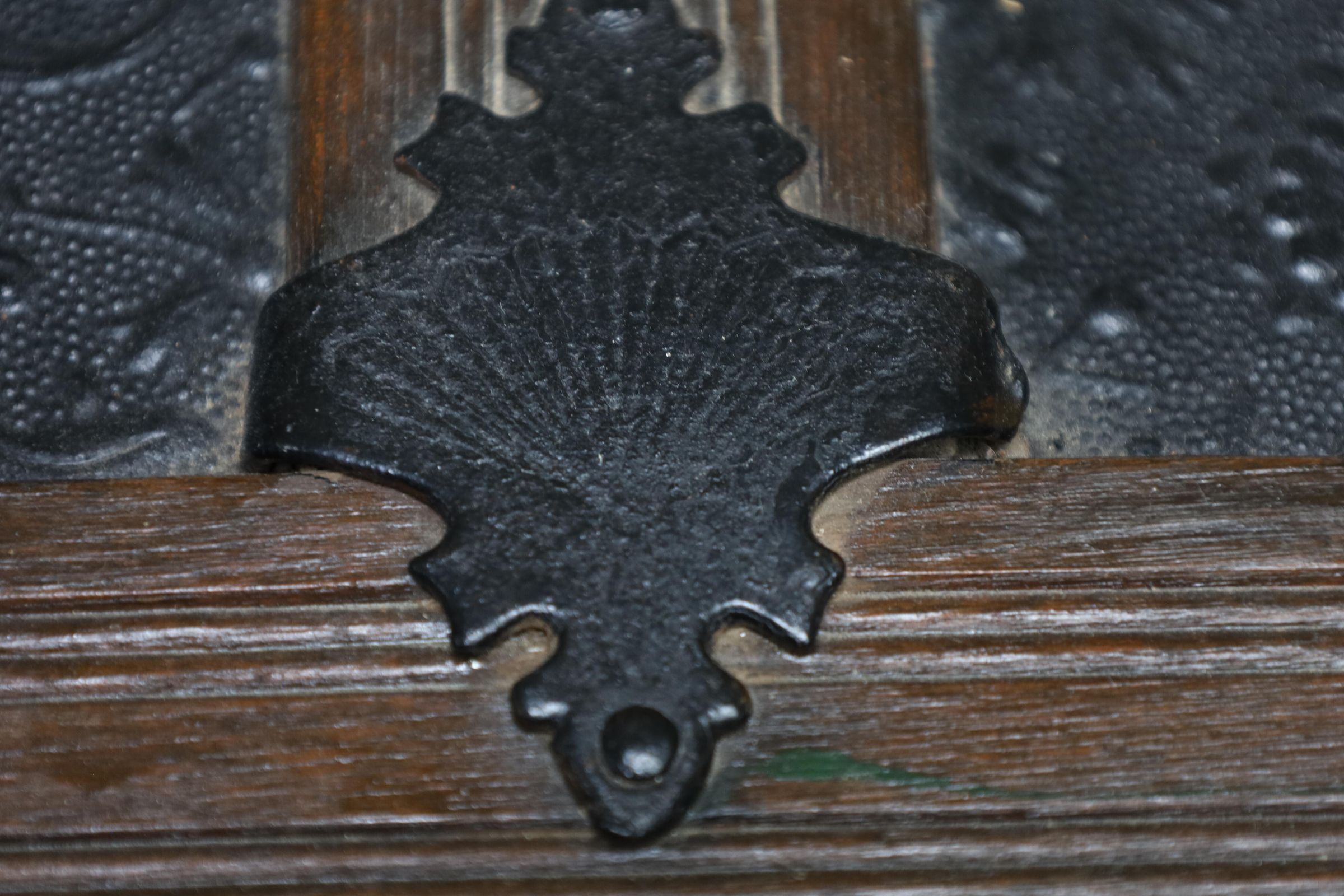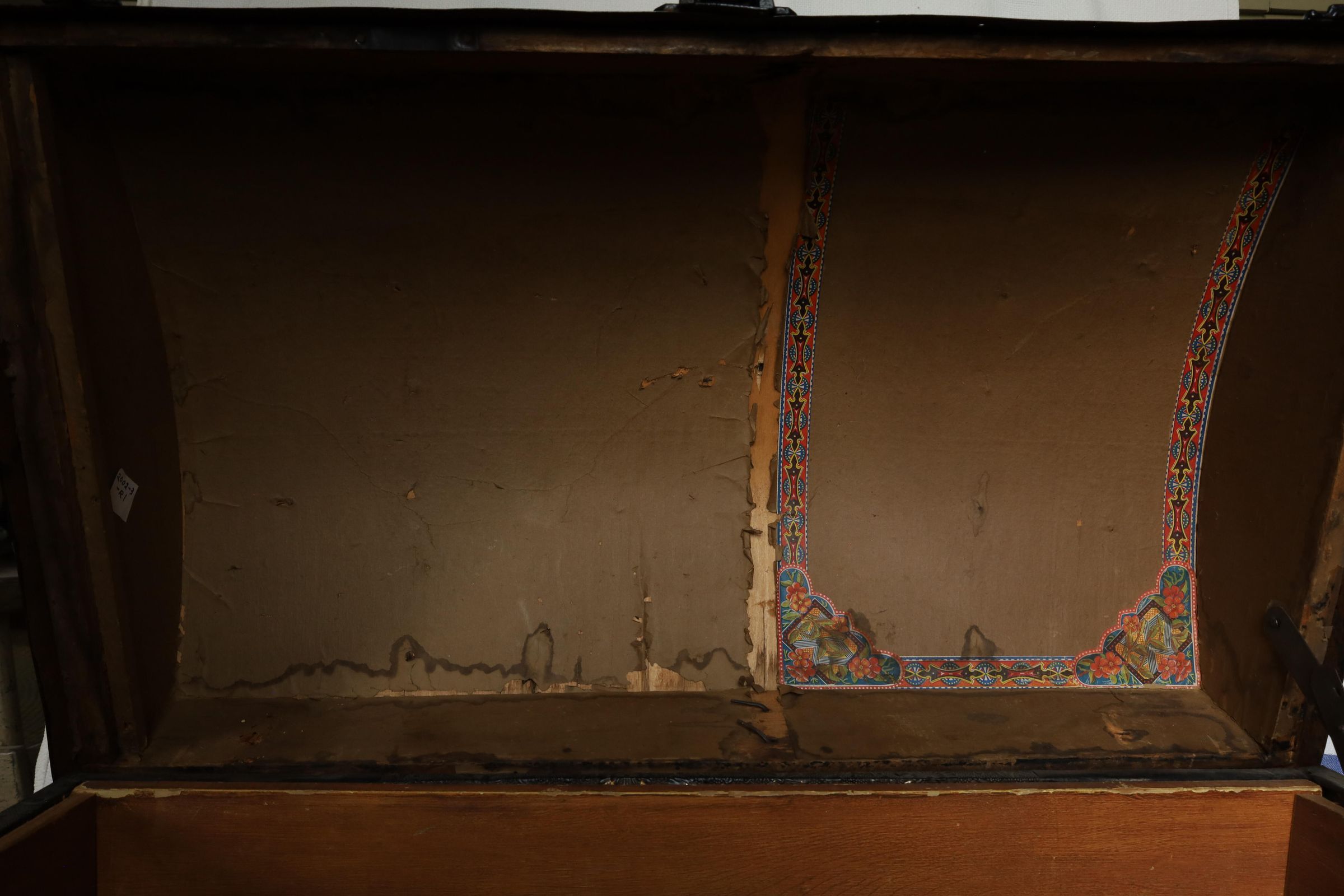 This black metal-covered dome top travel trunk has a floral design etched in the metal and three wooden slats on top and front of the trunk. This trunk could be a late 18th to early 19th century trunk. This type of trunk was used when traveling a long distance by water. A dome-shaped trunk could hold quite a bit of ones possessions.Location