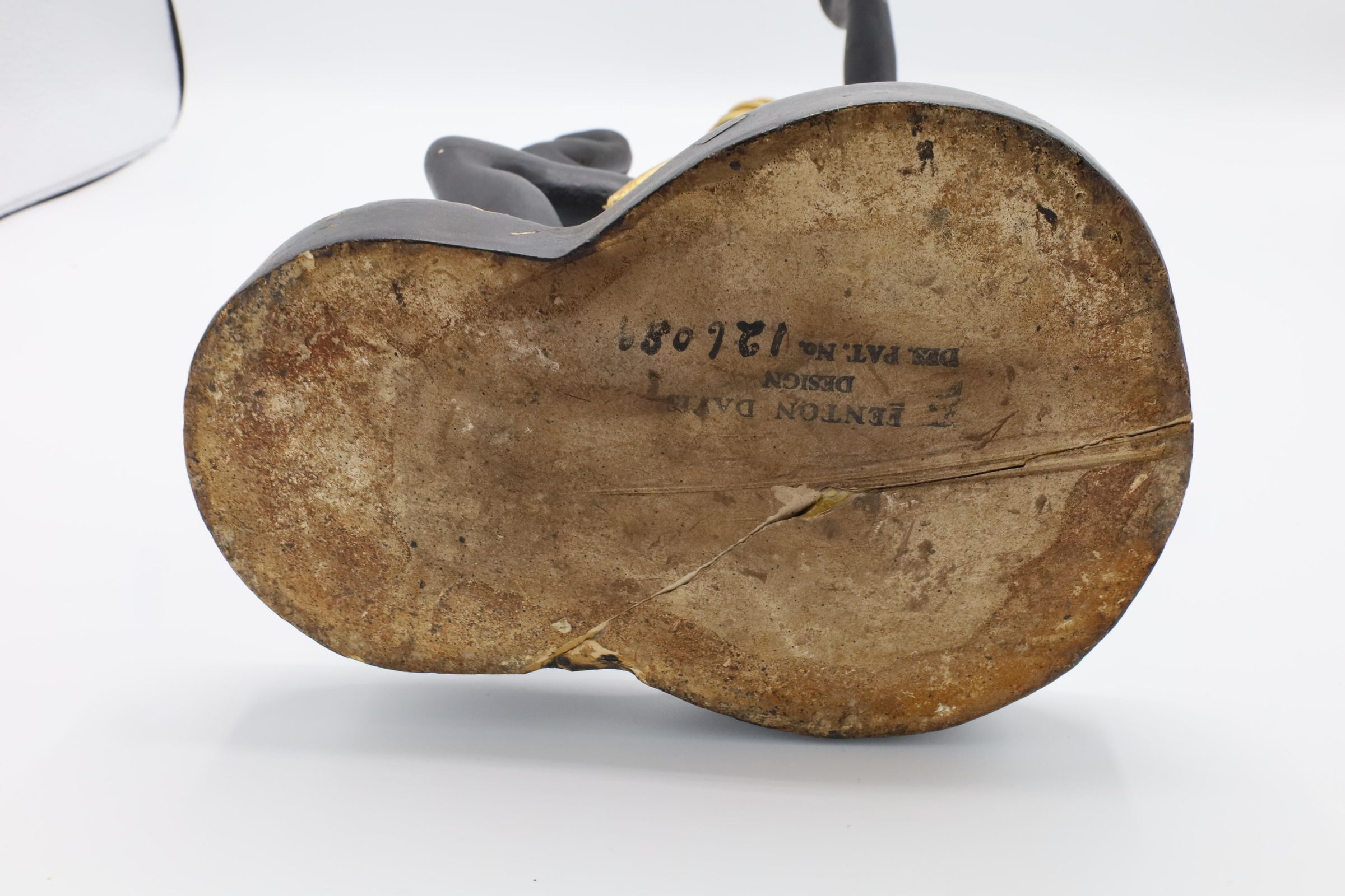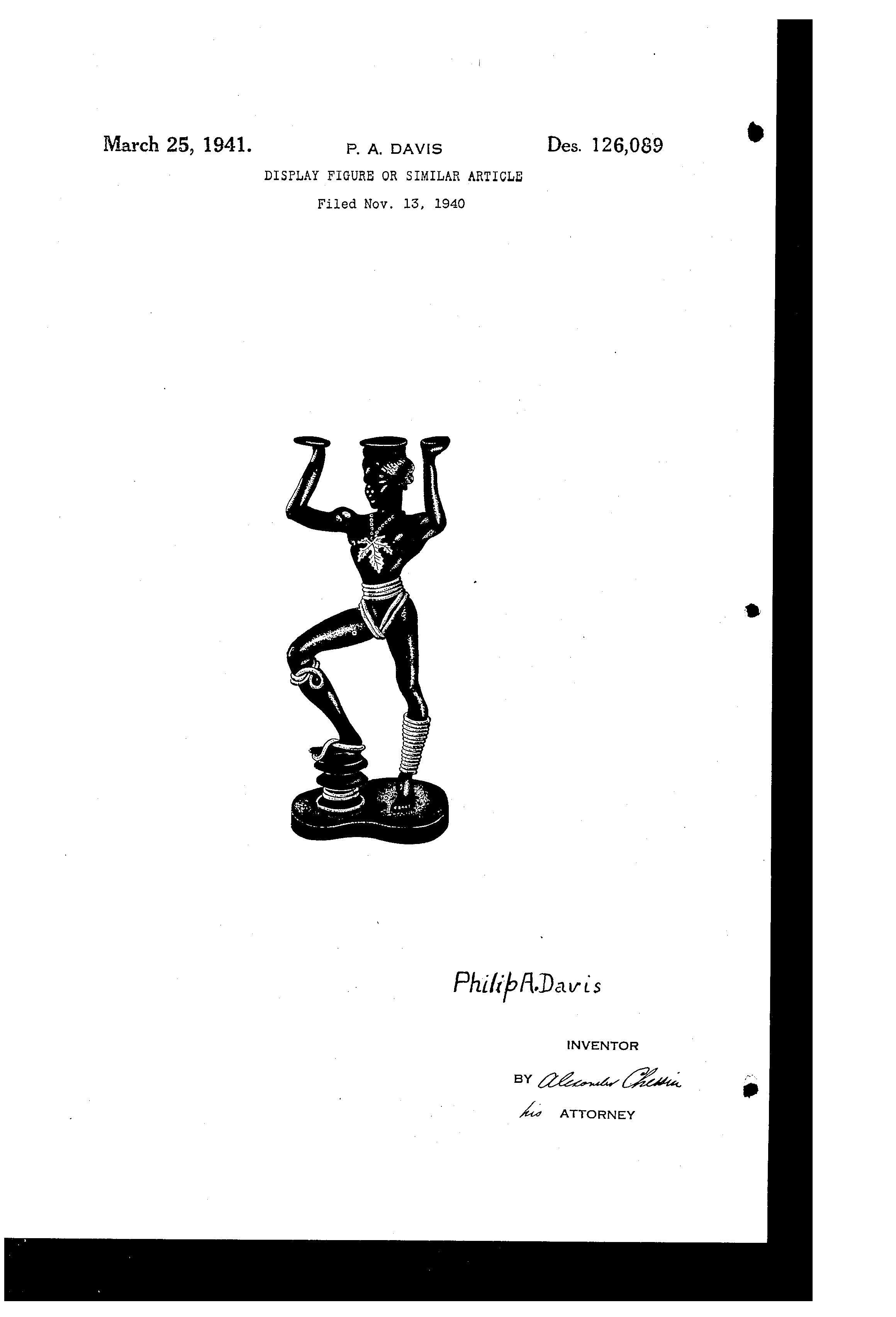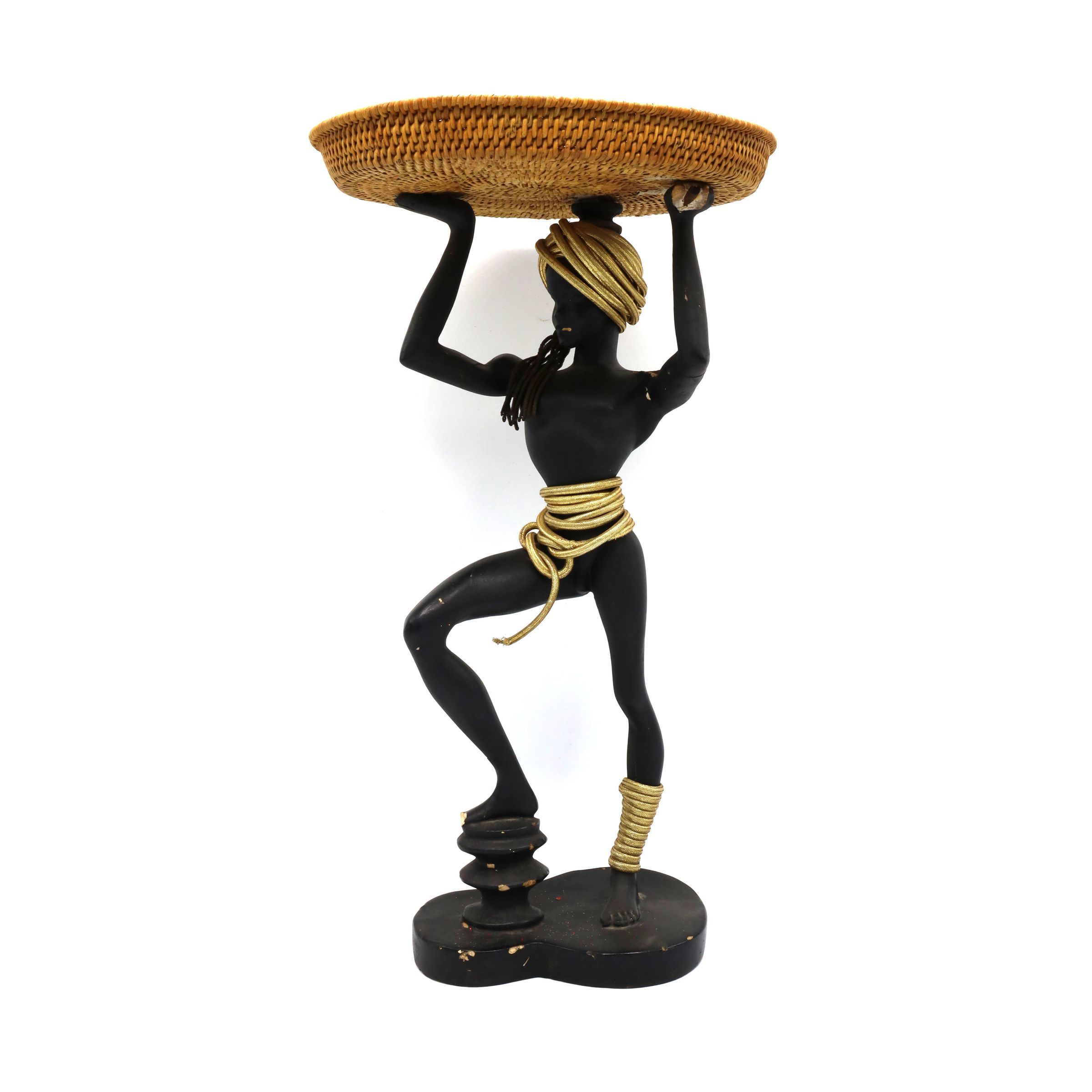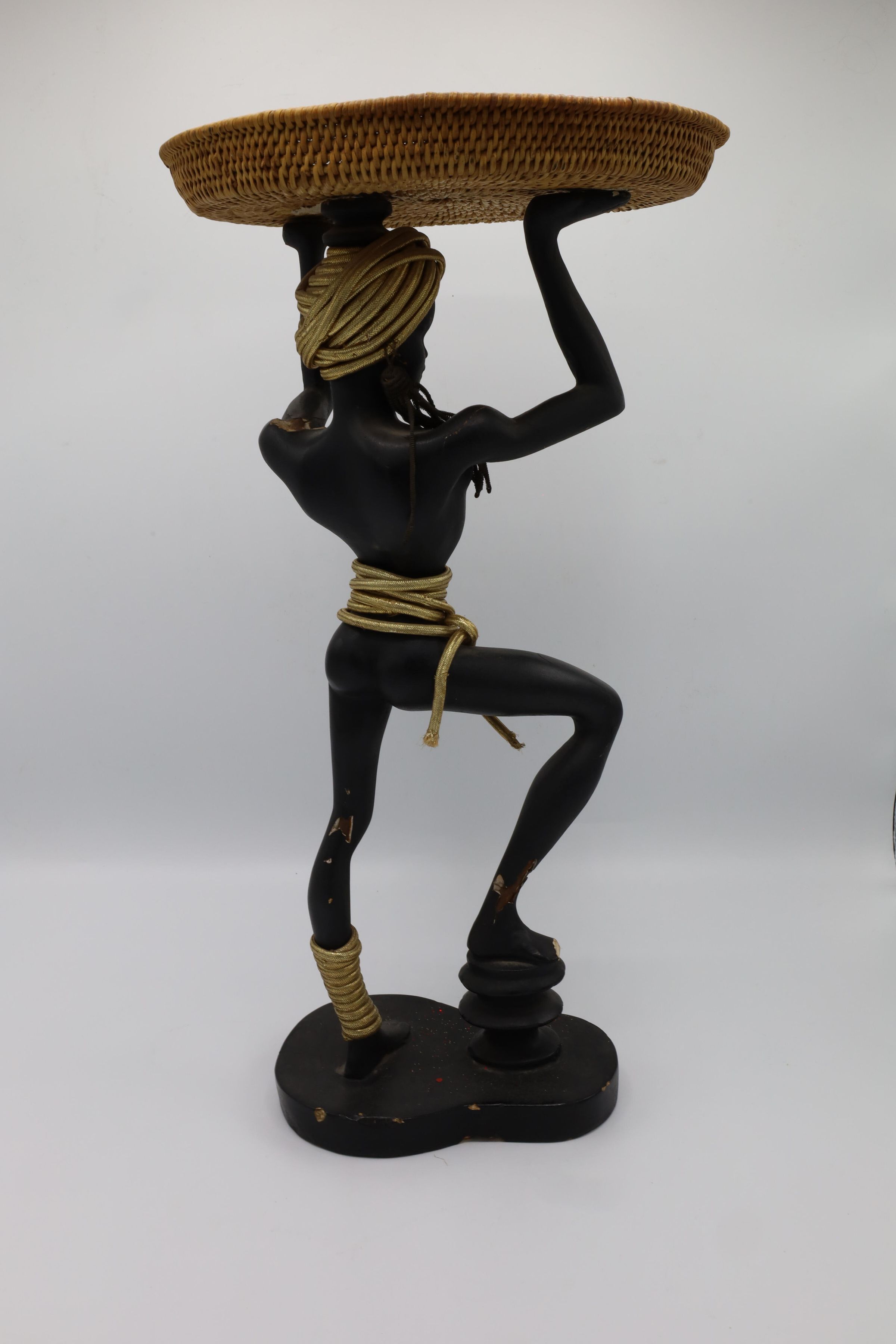 Male nude figure holding a wicker tray above the head. A gold-colored rope is coiled around the head, waist, and left foot. A patent for this figure design was submitted by Philip A. Davis of New York City on November 13, 1940.