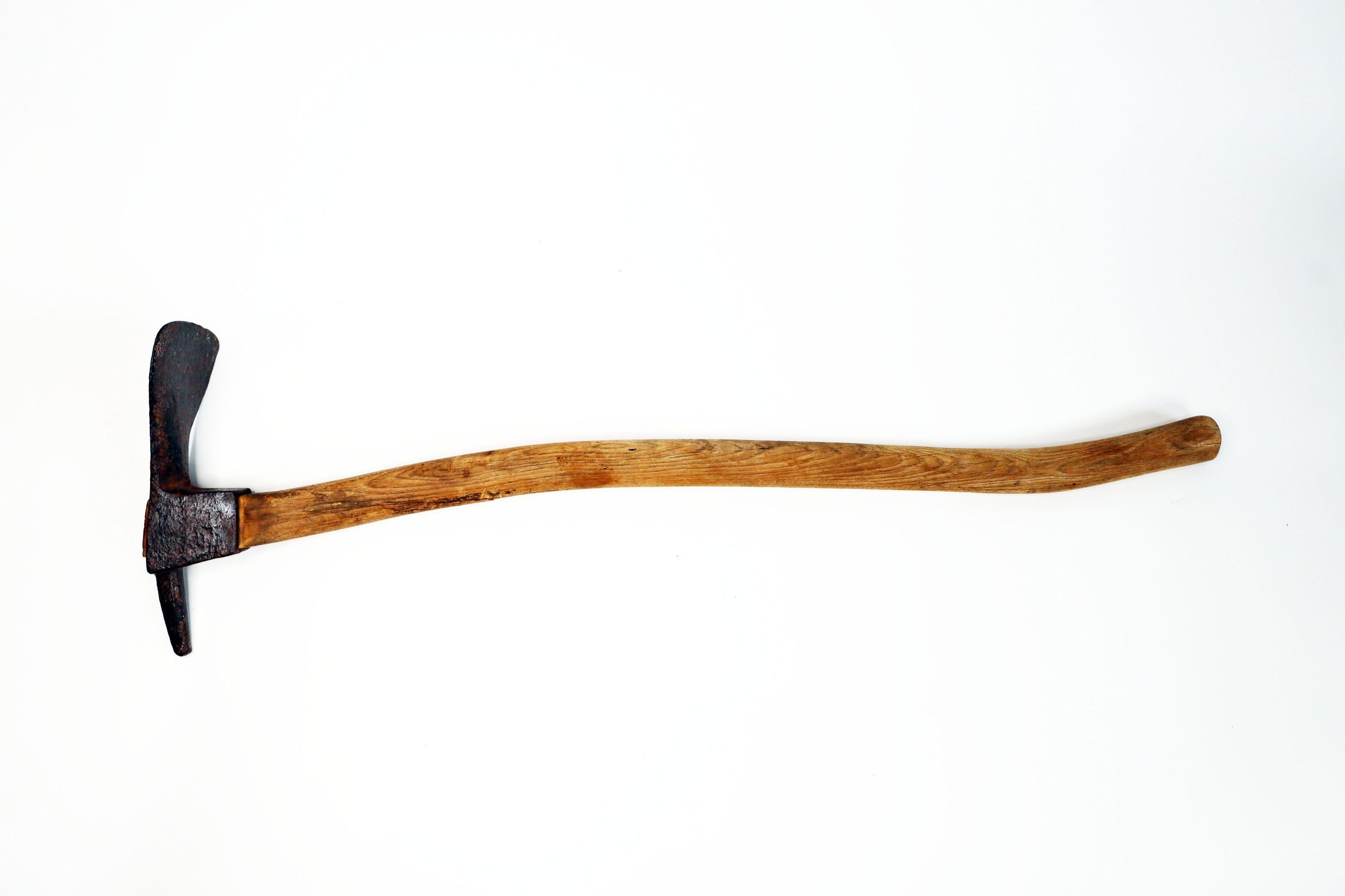 Trenching tool used for digging planting rows for crops by hand. Handle is longer than a traditional mattock, a similar tool for breaking up soil, and shorter than that of a hoe. Handle shape is similar to a long-handled axe and is curved for improved grip and leverage.