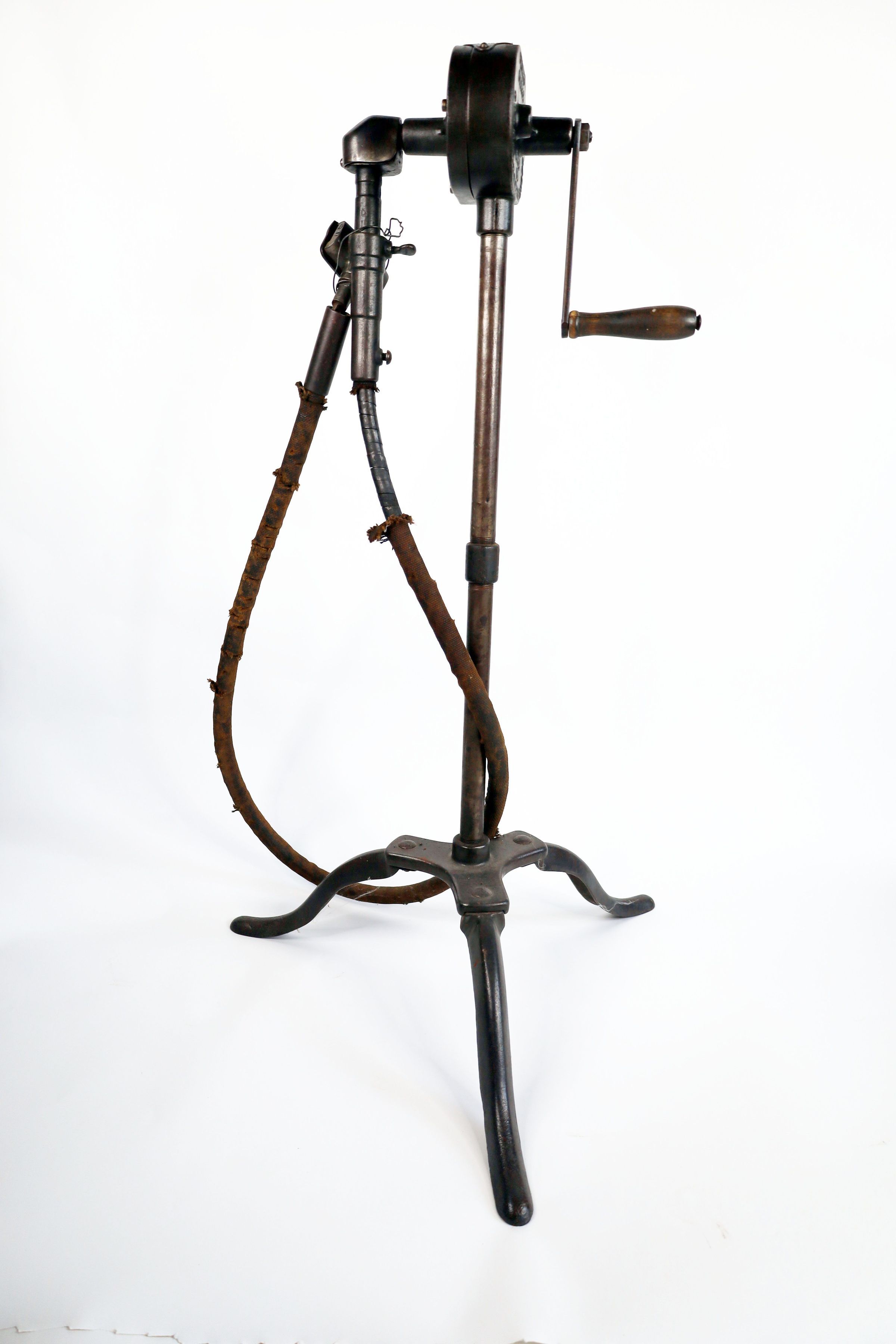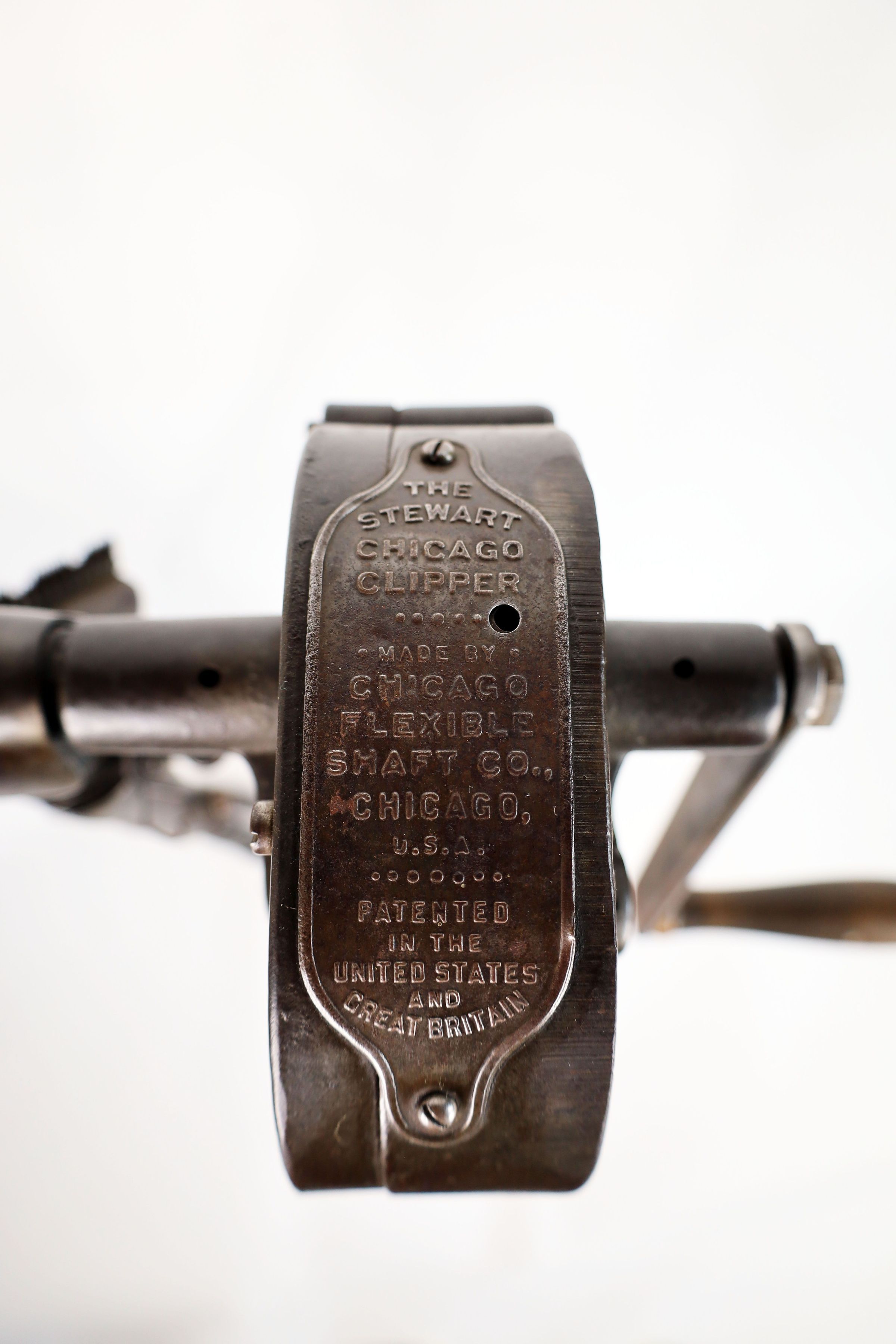 This is a hand operated clipping/shearing machine made by the Chicago Flexible Shaft Co. of Chicago, Illinois, USA. Clipping machines were used to mechanically shear wool from sheep or to clip a horse's coat. It features a stand and a flexible shaft at the end of which is a clipper. These clipping machines were developed in the early part of the twentieth century, and were patented in multiple countries.