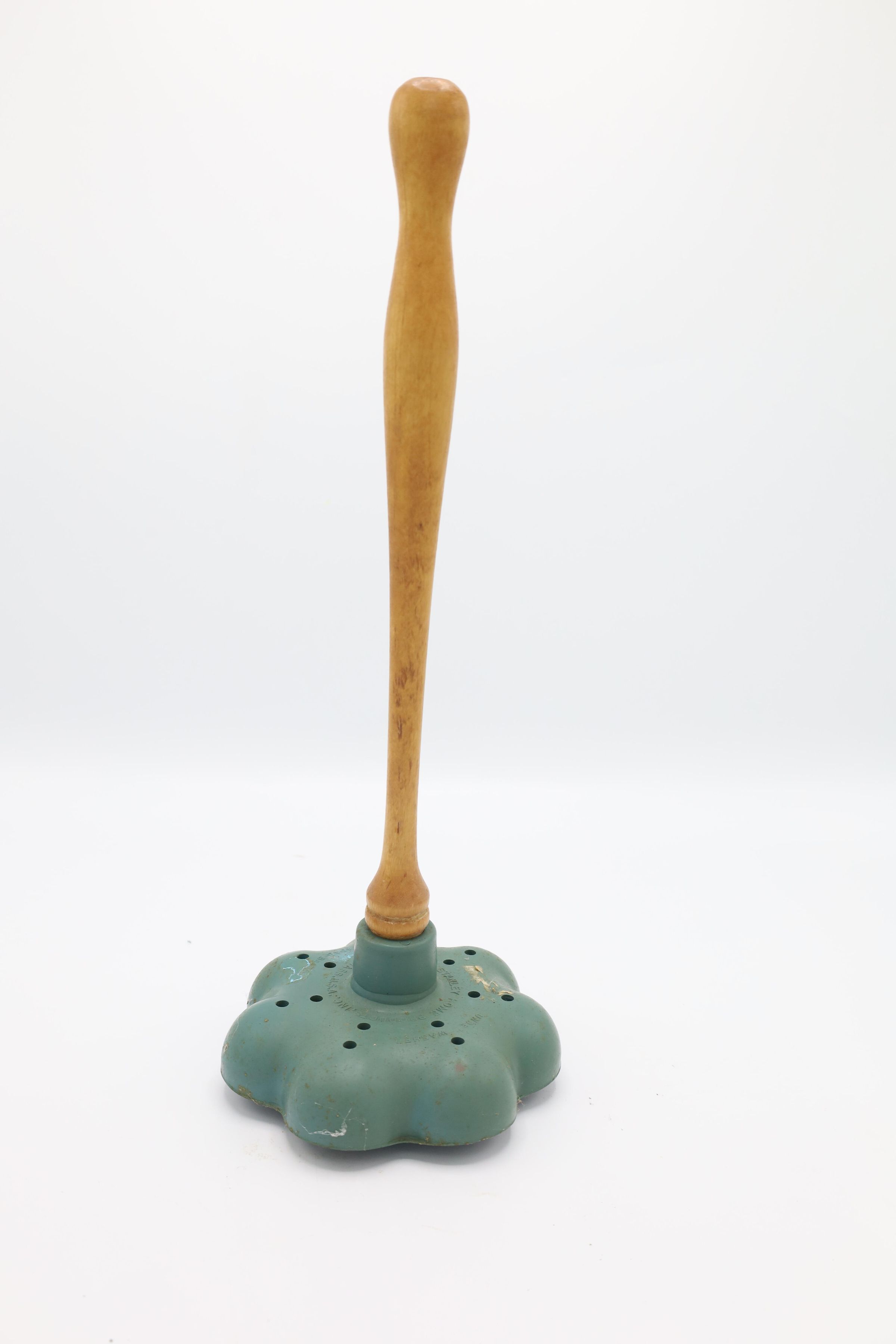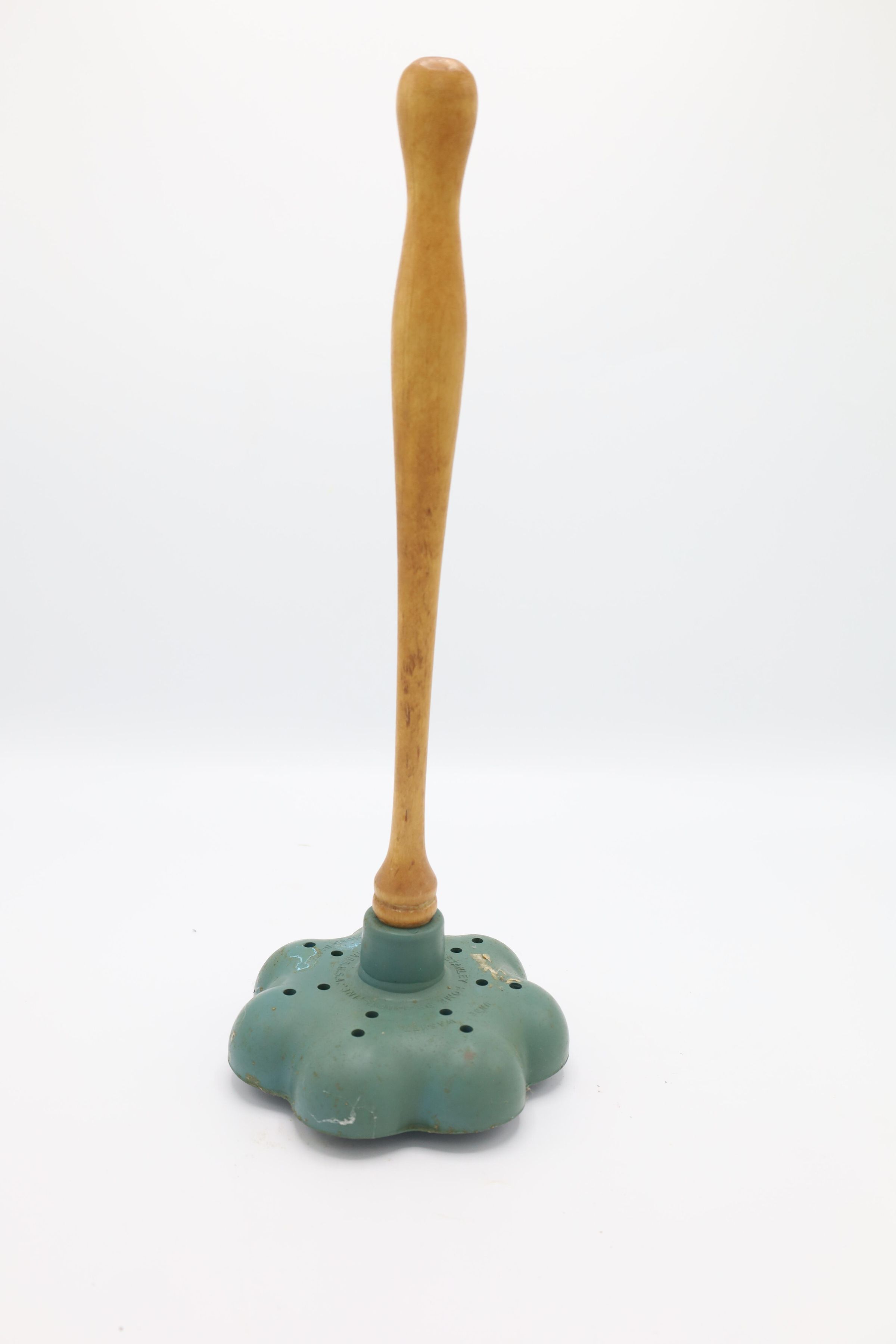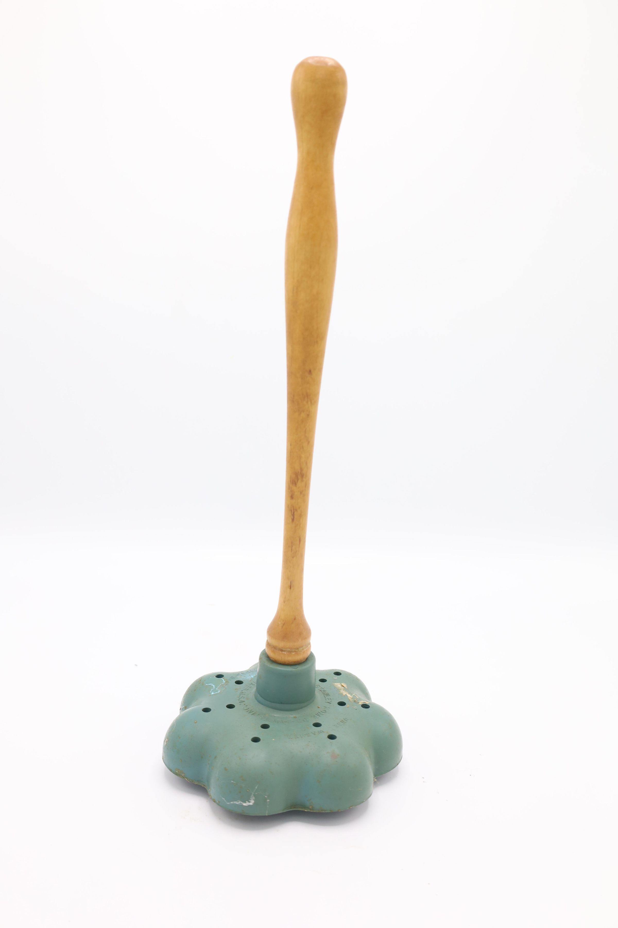 The 'Unde-Washer' was used to agitate the water when laundering clothing by hand at home. Holes in the rubber base aerated the soapy water, while the wooden handle allowed for agitation of garments as part of the cleaning process.Use
