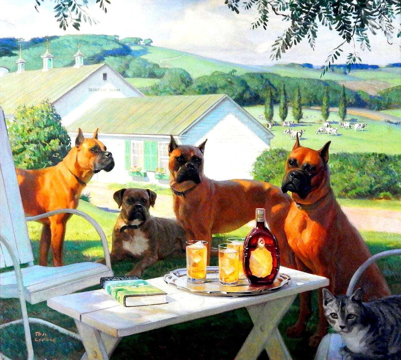 Oil painting of four dogs (boxers) and a cat at Malabar Farm.