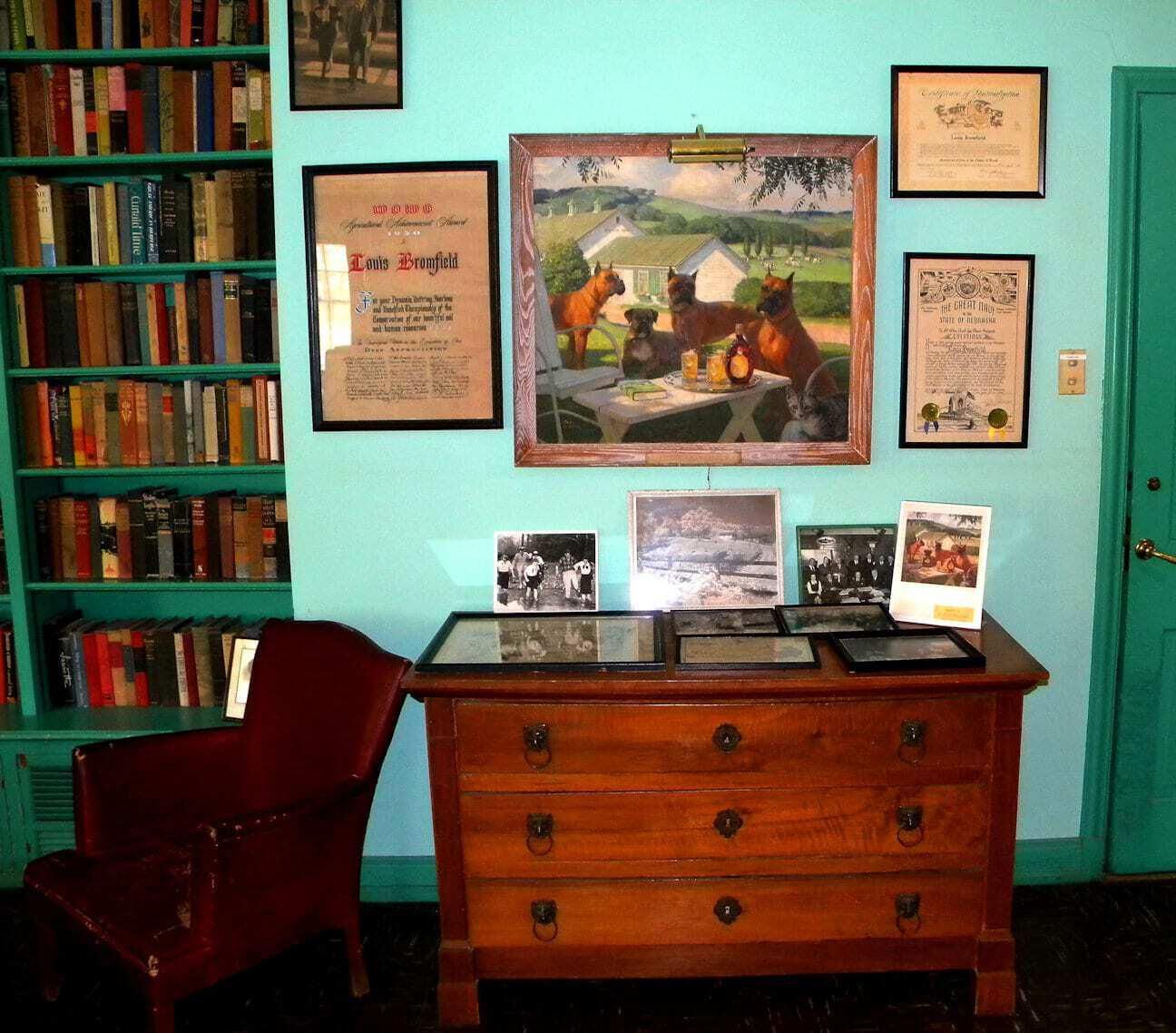 Tom Lovell completed this painting for Calvert Whiskey. It was one of a series of paintings that Lovell did for Calvert Whiskey. The Malabar Farm painting was completed in approximately 1947. Despite the use of Malabar Farm to promote Calvert Whiskey, Louis Bromfield’s favorite whiskey was White Horse Blended Scotch Whiskey.Context