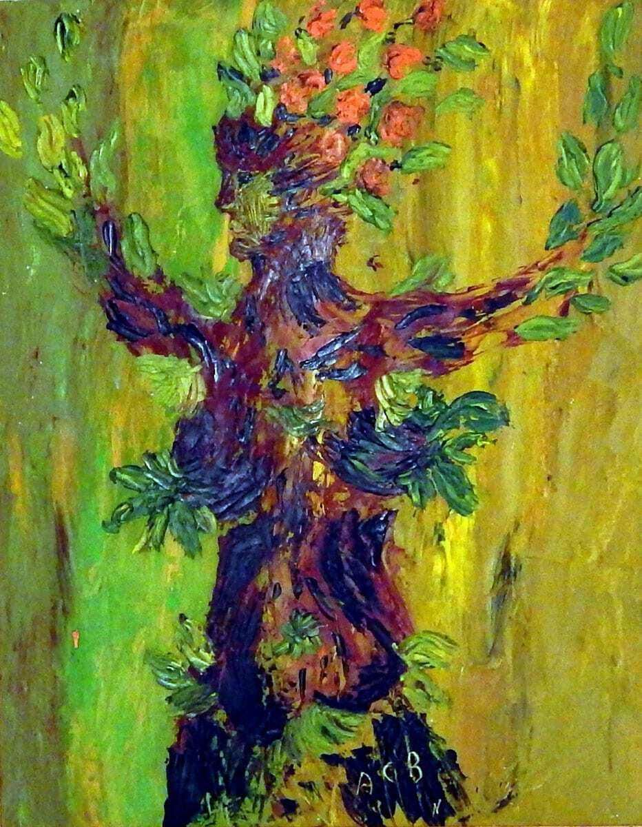 This painting is attributed to Anne Bromfield. It appears to be a human figure made of flowers, leaves, and other natural materials.Context