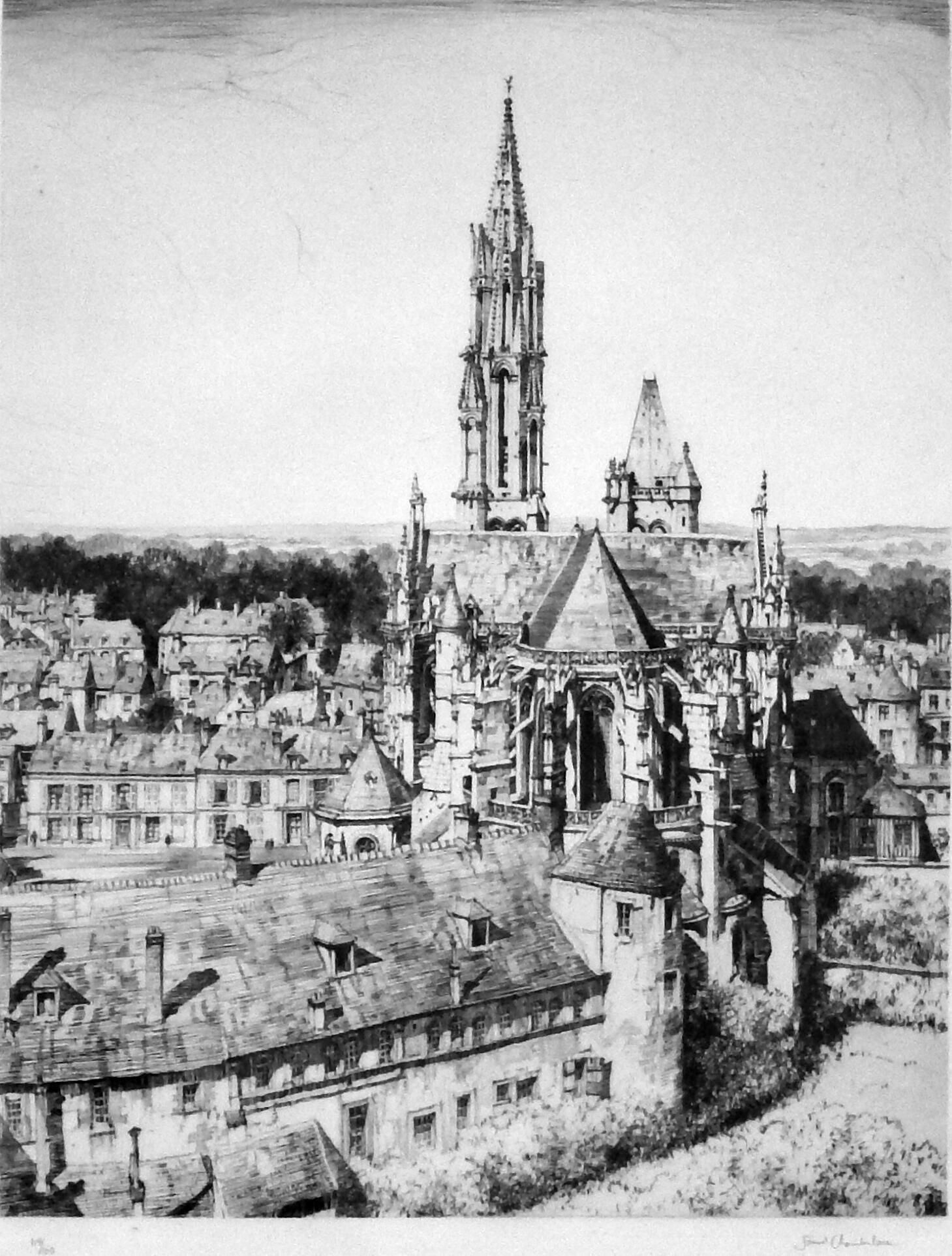 In the 1920s, Chamberlain studied various printmaking techniques in Paris, becoming exceptionally proficient at producing etchings of architectural subjects. In 1922 Chamberlain married Narcissa Gellatly. During their years in France, he and Narsissa traveled widely throughout Europe, with Chamberlain sketching. The couple also socialized with many ex-patriot Americans, including Alexander Calder, Gertrude Stein, and Louis Bromfield. In 1930 he purchased a home in Senlis, the same small town near Paris where the Bromfield family lived.
