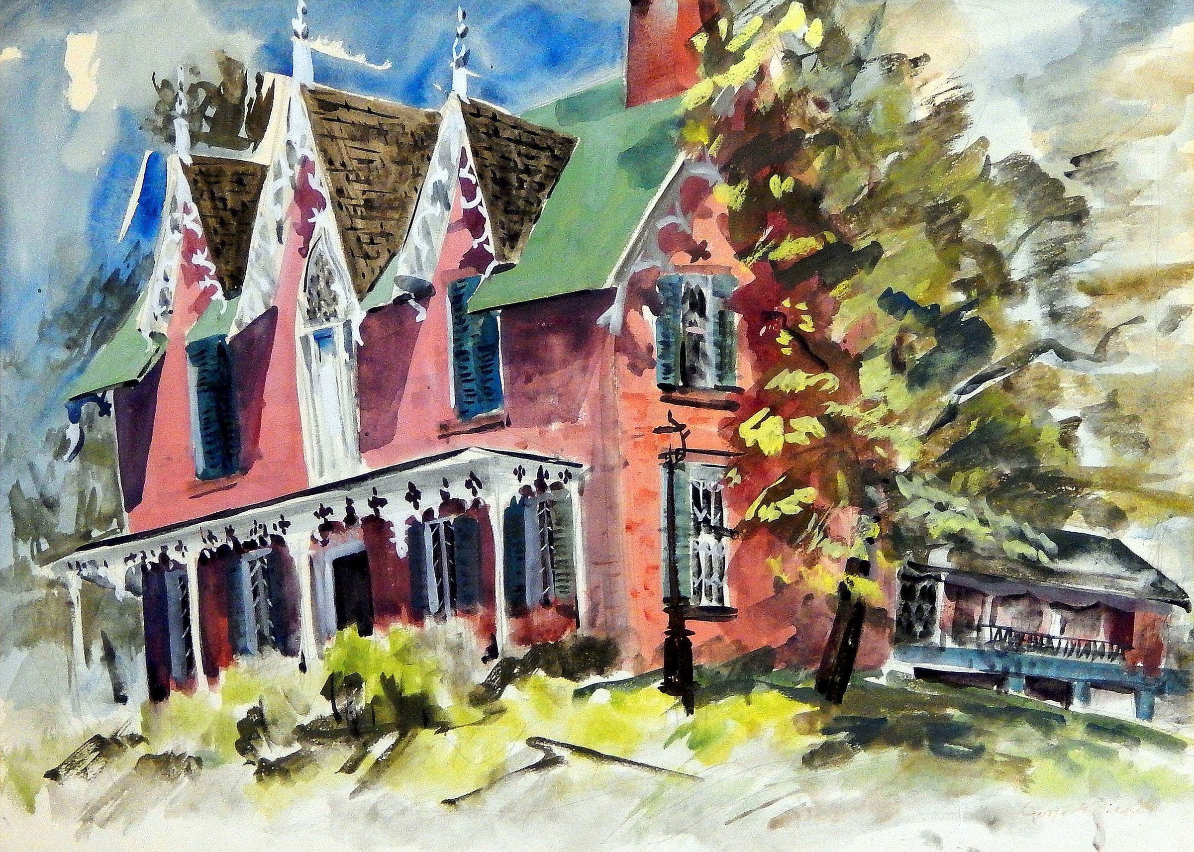 Between 1945 and 1959, Biddle executed a series of watercolor paintings using prominent and recognizable Mansfield, Ohio, and Richland County, Ohio locales as subjects. This George Biddle painting of the Oak Hill Cottage in Mansfield, Ohio hangs in the Big House living room and may be from this series.Context