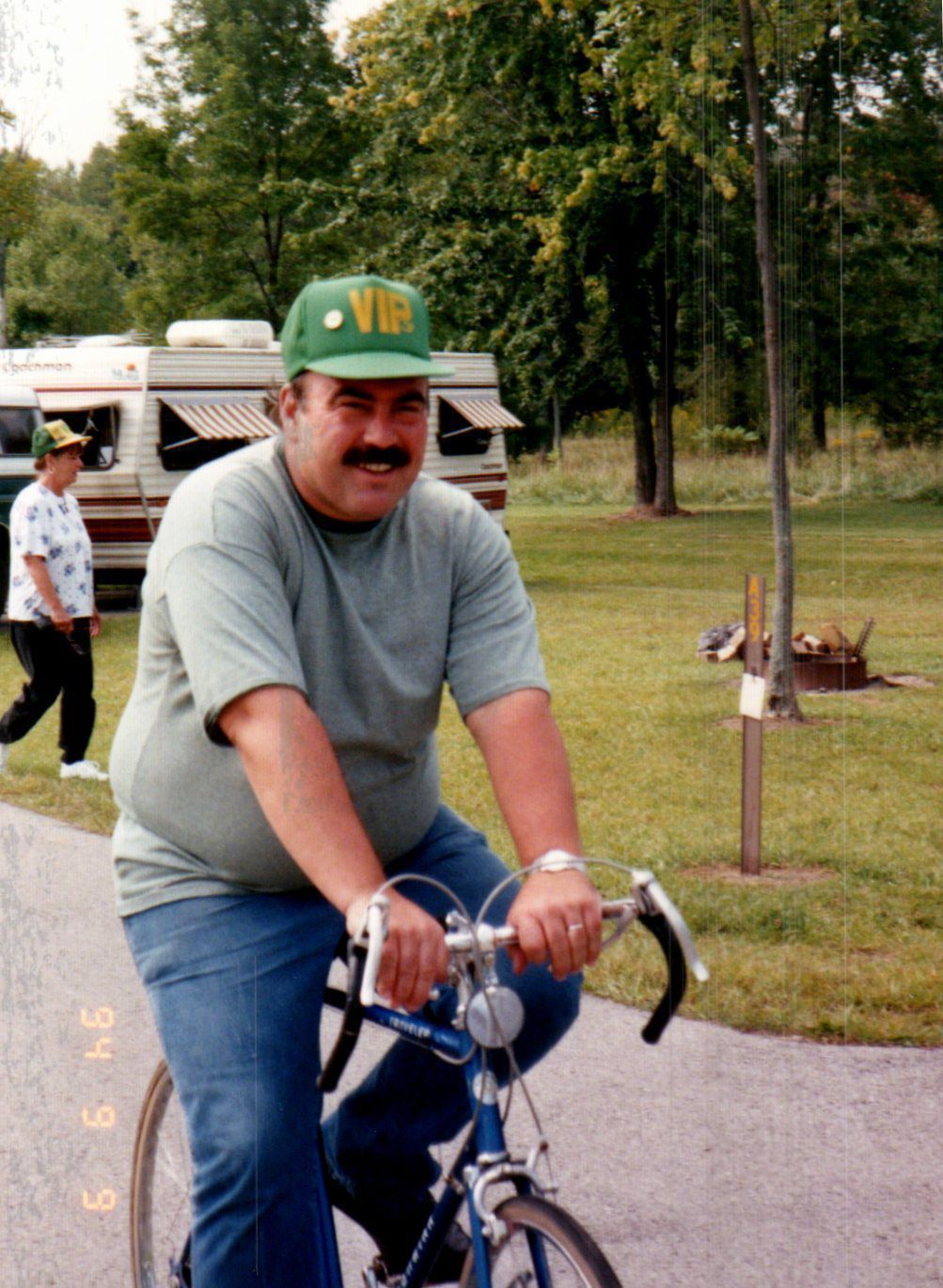 A park volunteer wearing his "VIP" hat (standing for Volunteers in Parks program) rides a bike during the statewide VIP gathering held at Indian Lake State Park during the summer of 1994.Cataloged By